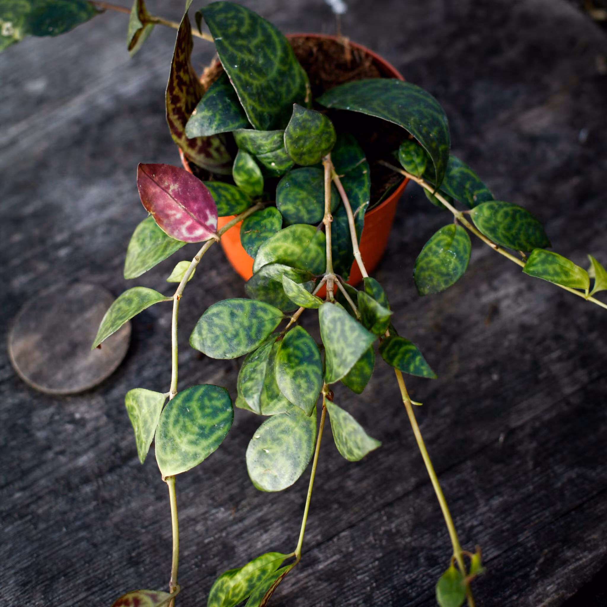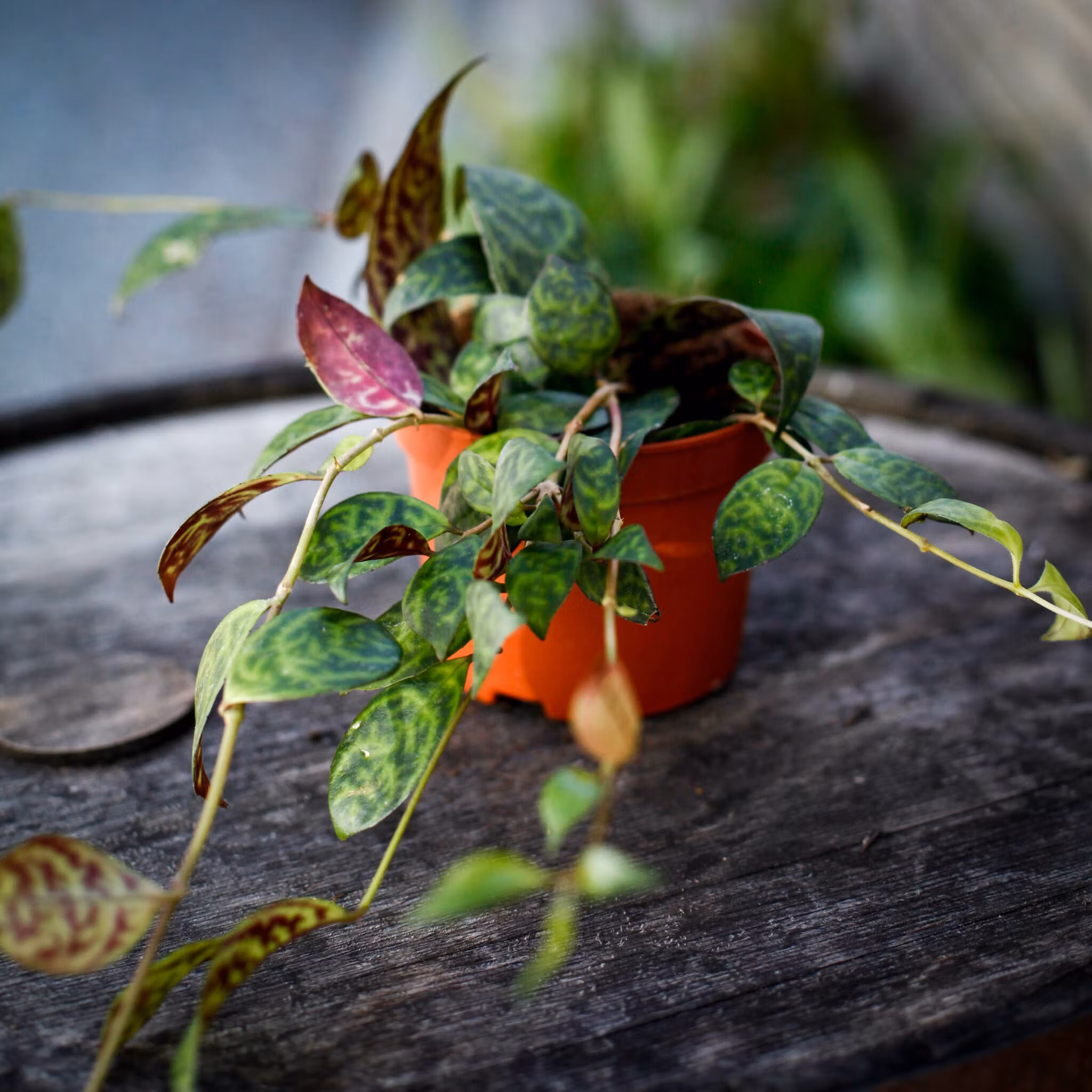 Aeschynanthus marmoratus, även känd som marmorerad läppstiftsblomma, är en unik hängväxt med dekorativa, mörkgröna blad som har ljusare marmorering. De eleganta bladen ger ett mönstrat utseende som gör denna växt till ett attraktivt inslag i inomhusmiljöer. Aeschynanthus marmoratus trivs bäst i ljusa, indirekta ljusförhållanden och kräver minimal skötsel, vilket gör den idealisk för både nybörjare och erfarna växtälskare. Växten är också känd för sina rörformiga blommor, som kan ge en extra färgklick när de blommar. Perfekt för att hänga i amplar eller placeras på hyllor där dess blad kan skapa ett vackert hängande mönster.
