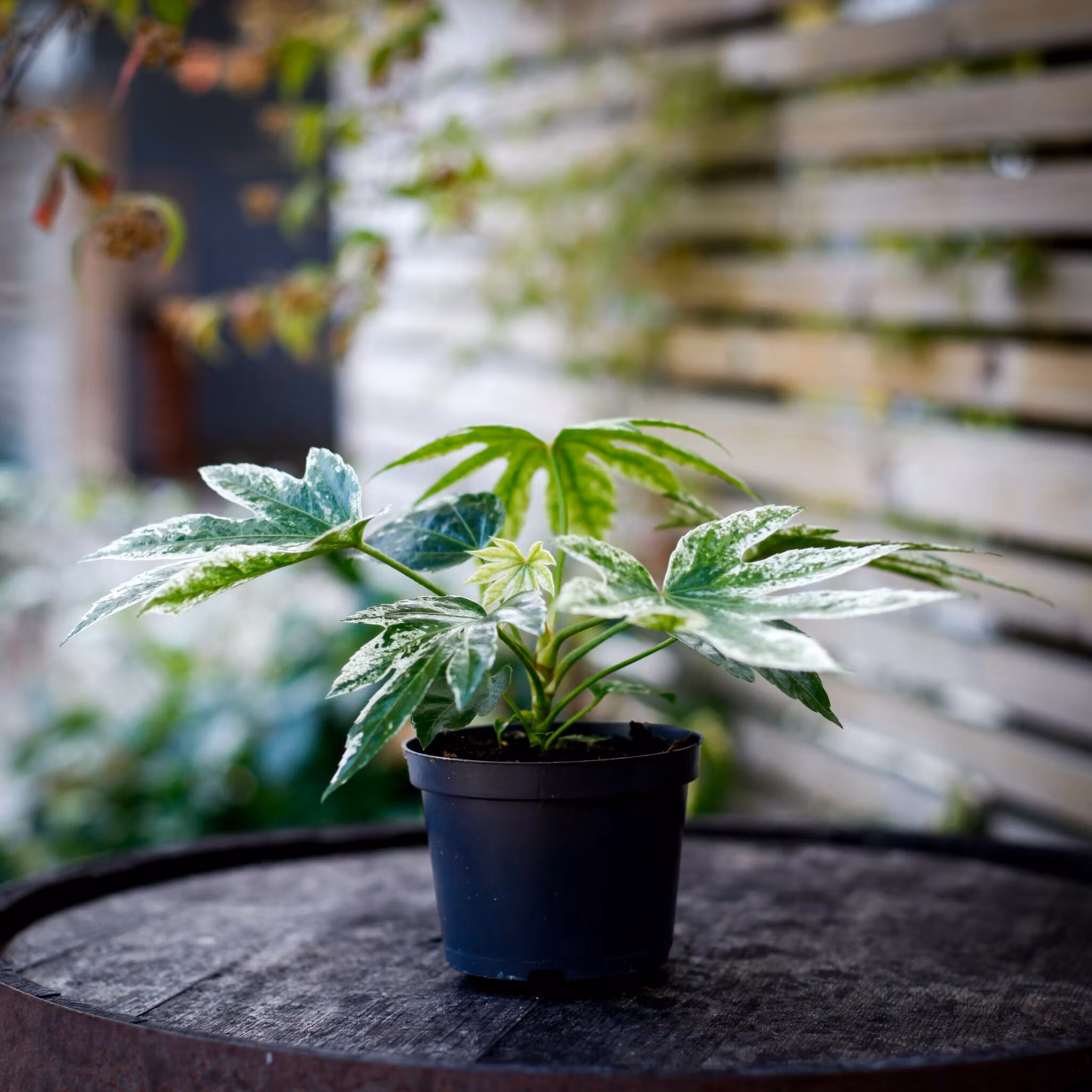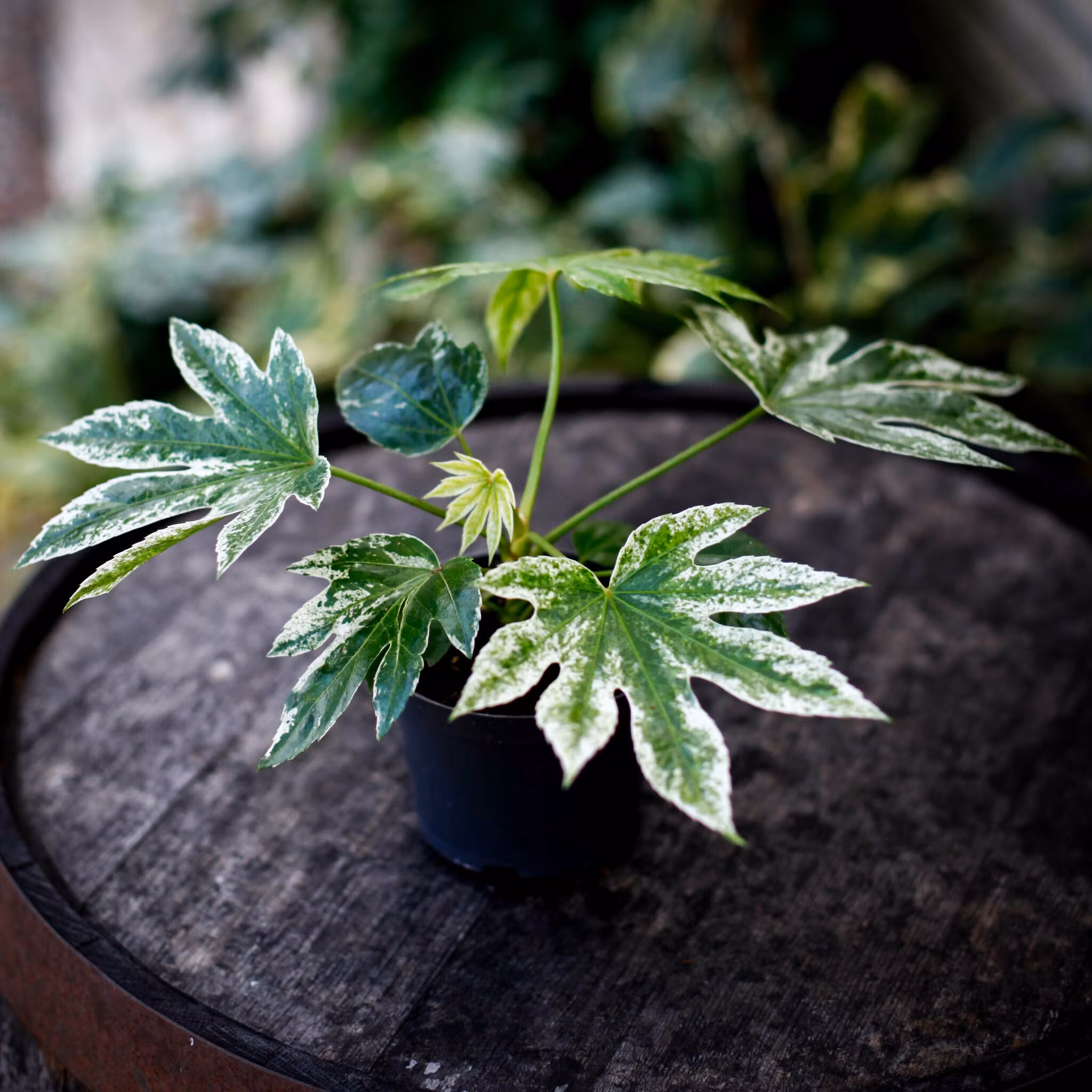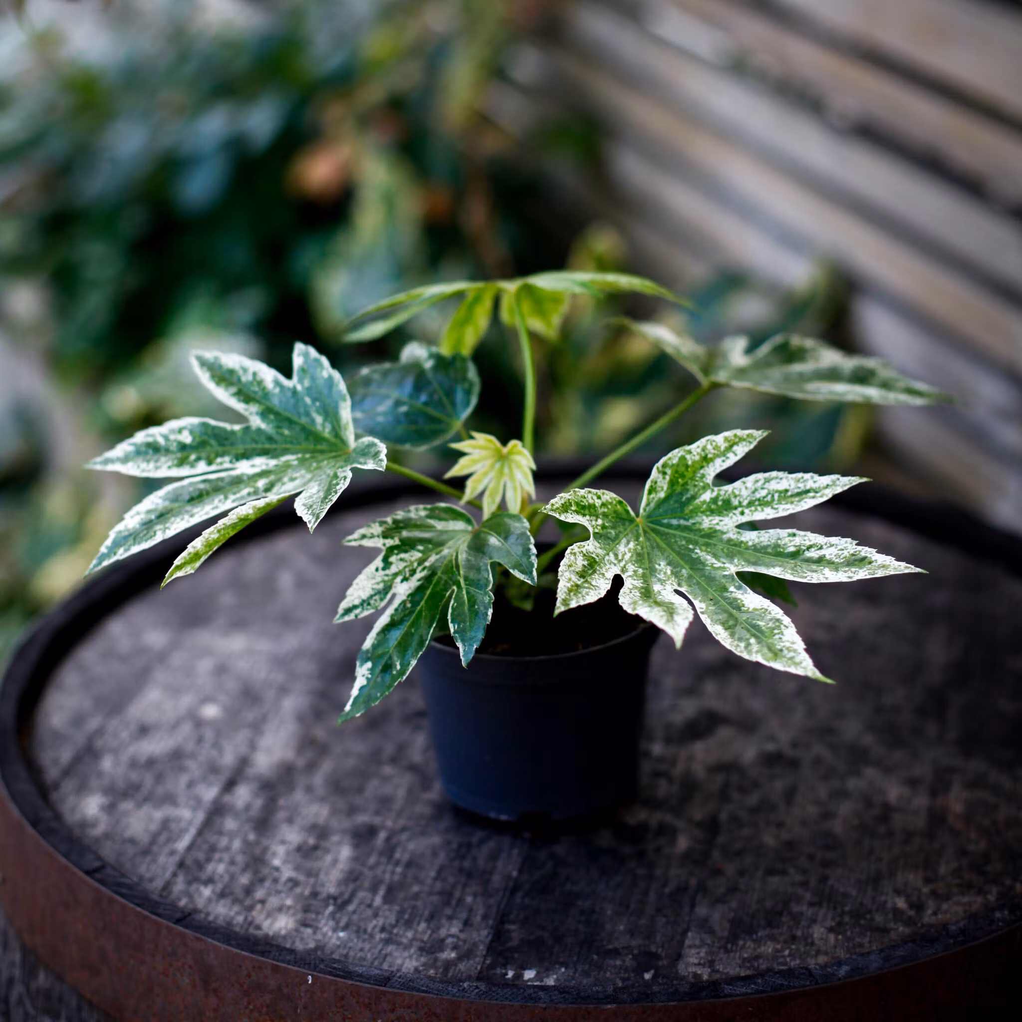Fatsia japonica 'Spider's Web' är en imponerande och lättskött växt som utmärker sig med sina stora, glänsande, palmliknande blad och en fantastisk mönstring som påminner om ett spindelnät. Denna sort är perfekt för att ge ditt hem en tropisk och exotisk känsla och fungerar utmärkt som en iögonfallande accenter i både moderna och klassiska inredningar.