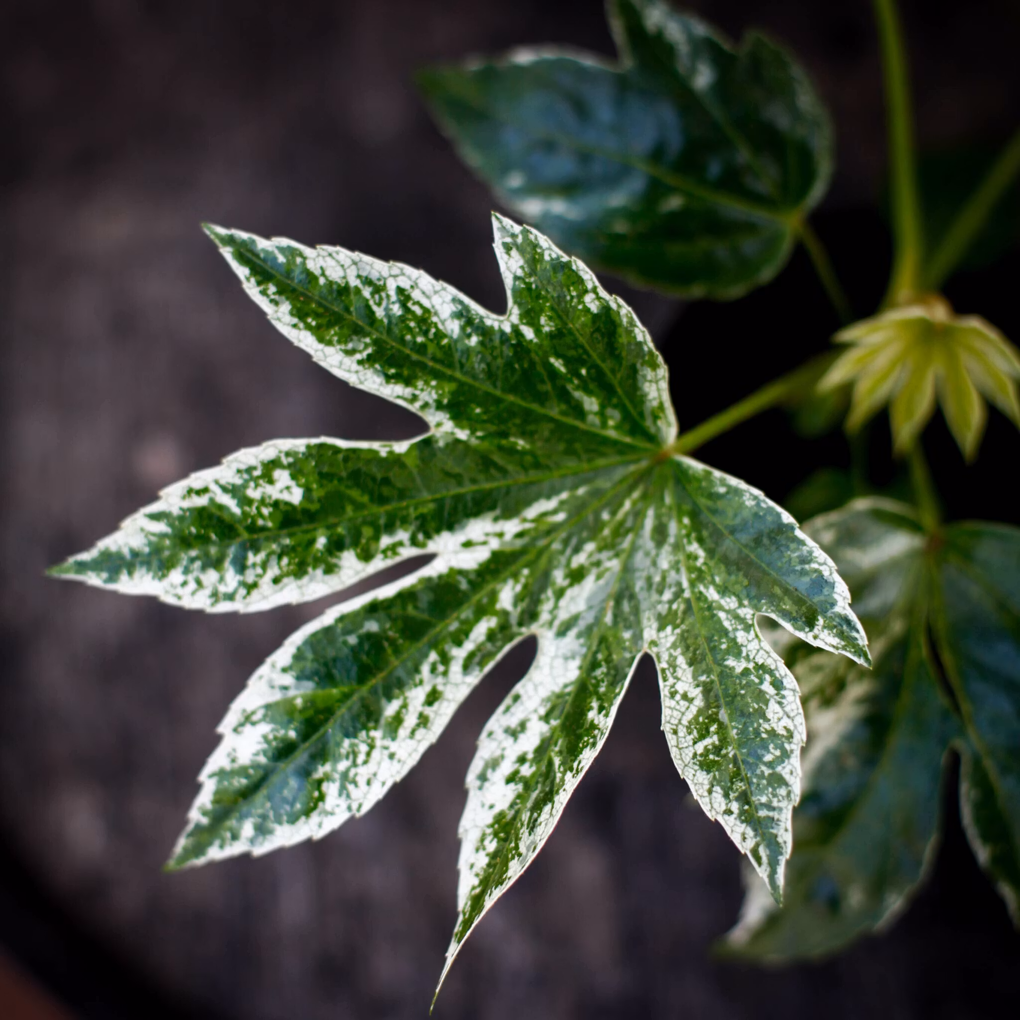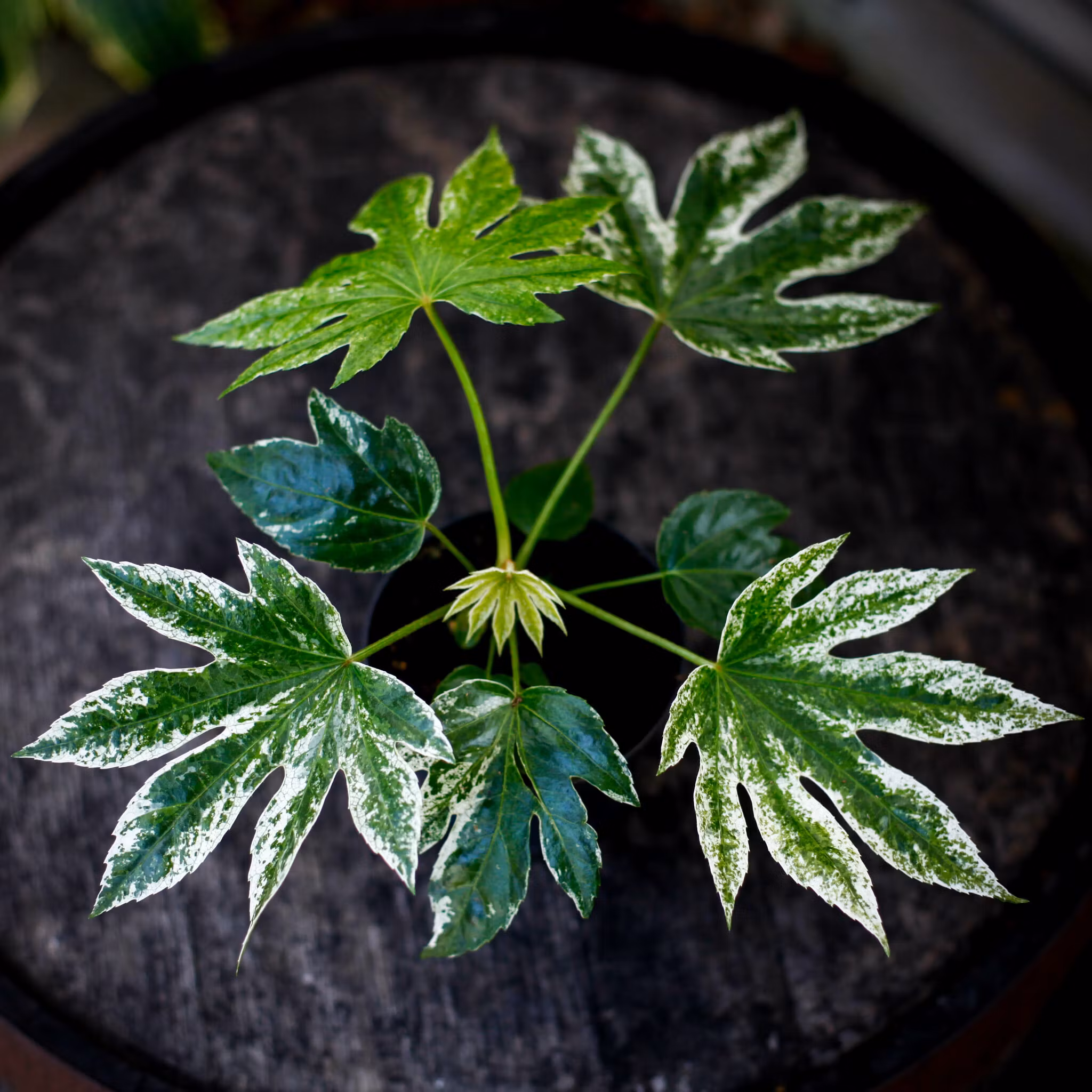 Fatsia japonica 'Spider's Web' - en tropisk skönhet med unika spindelnätsmönster, perfekt för att ge ditt hem en exotisk och dramatisk touch! 🌿