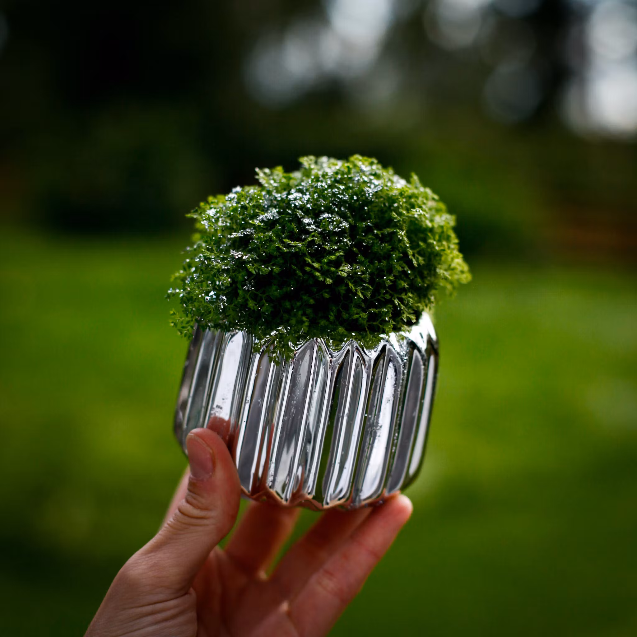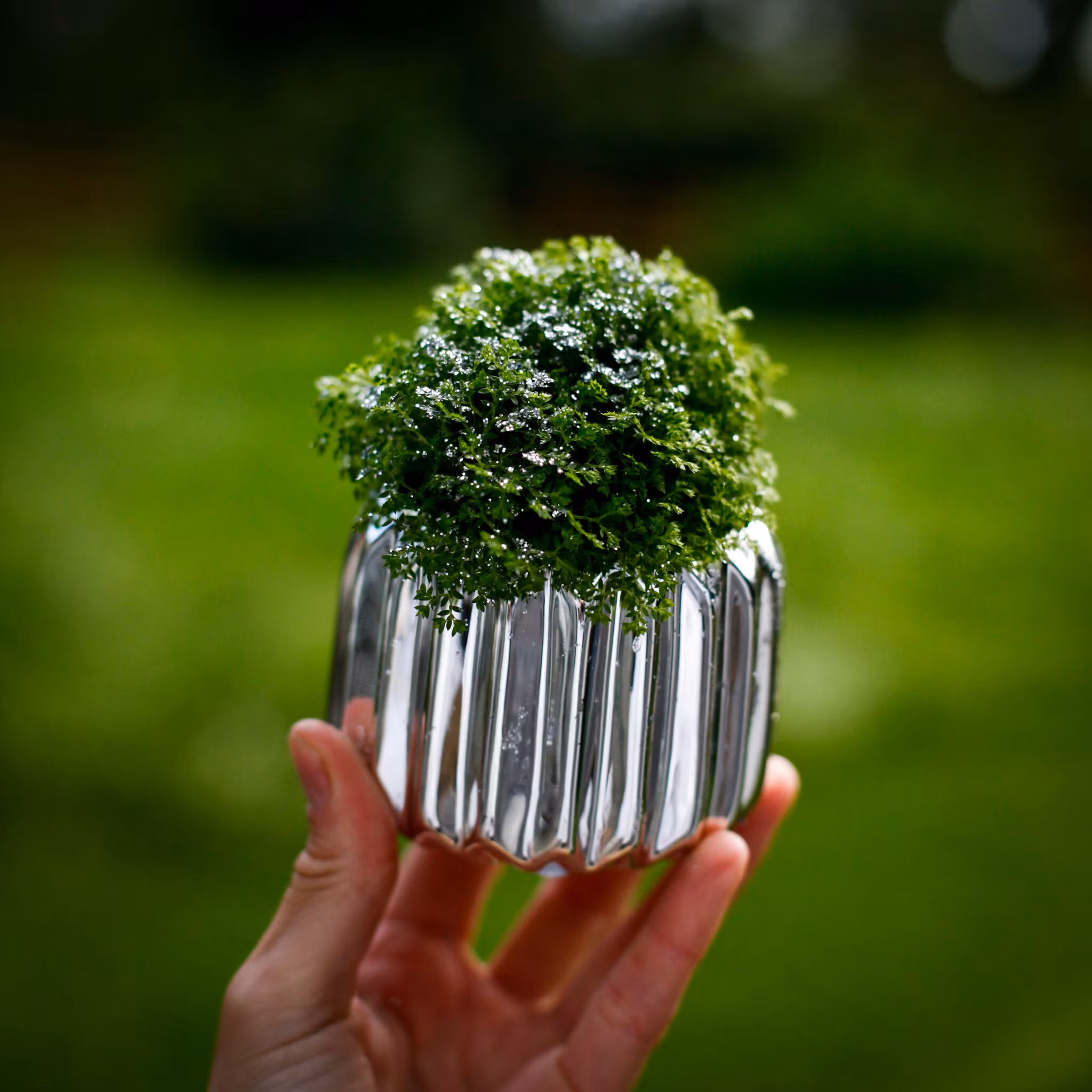 Glitterbomb Selaginella apoda i silvrig kruka — en festlig växt med gnistrande blad, perfekt för dekoration. Beställ enkelt hos Klorofyllverket.se.