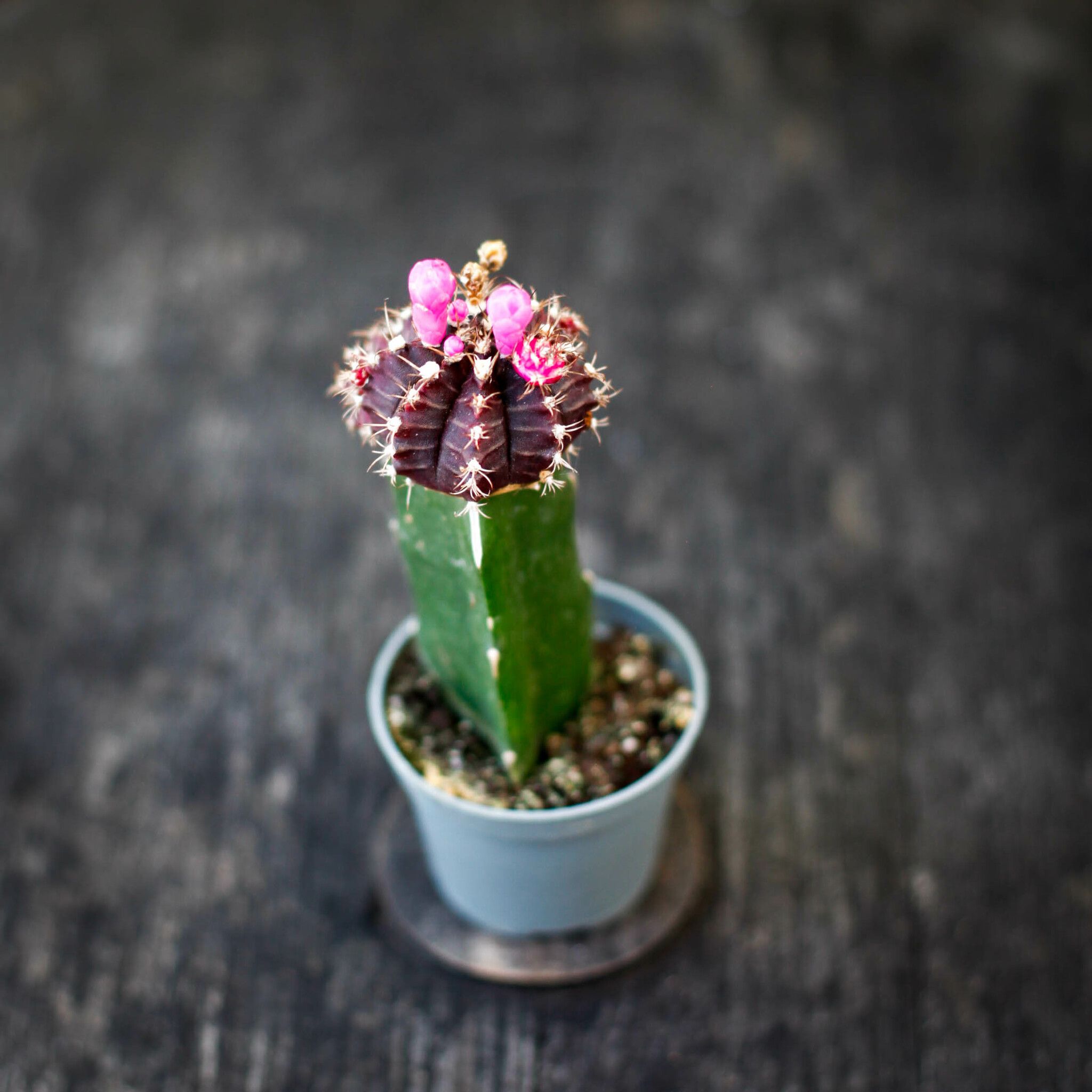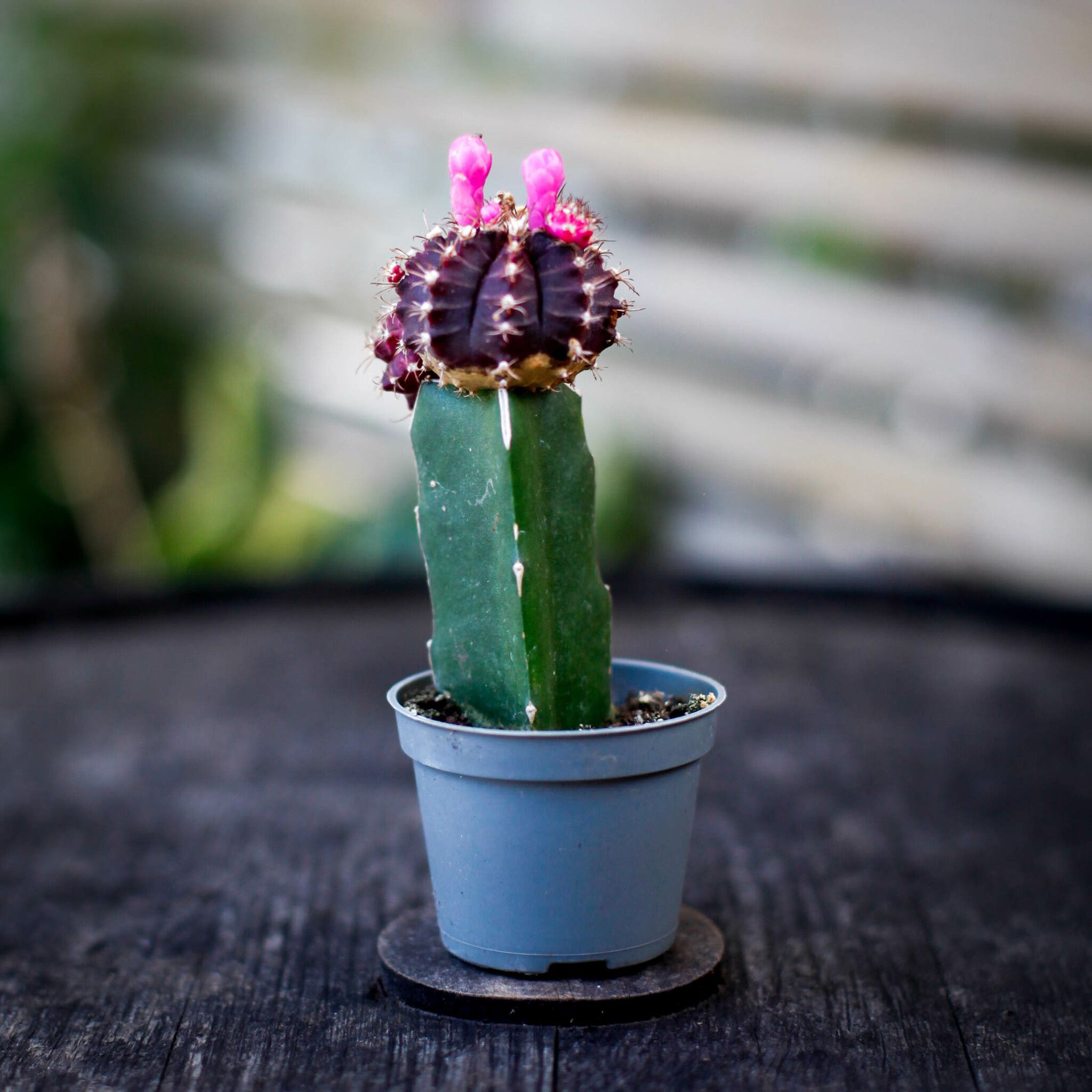 Gymnocalycium mihanovichii lila, eller "Moon Cactus", har en lila topp på en grön bas. Lättskött, trivs i indirekt ljus och är perfekt för små utrymmen.