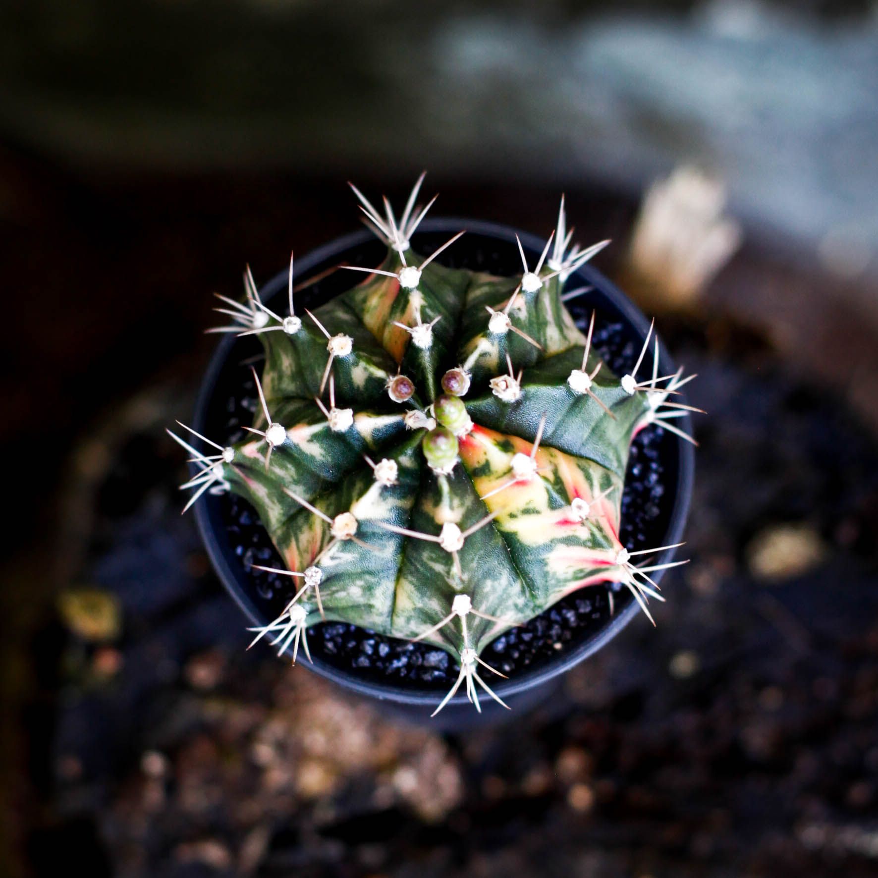 Gymnocalycium mihanovichii 'Variegata' Den är idealisk för samlare eller inredningsentusiaster som vill ha en exotisk och lättskött kaktus som sticker ut.