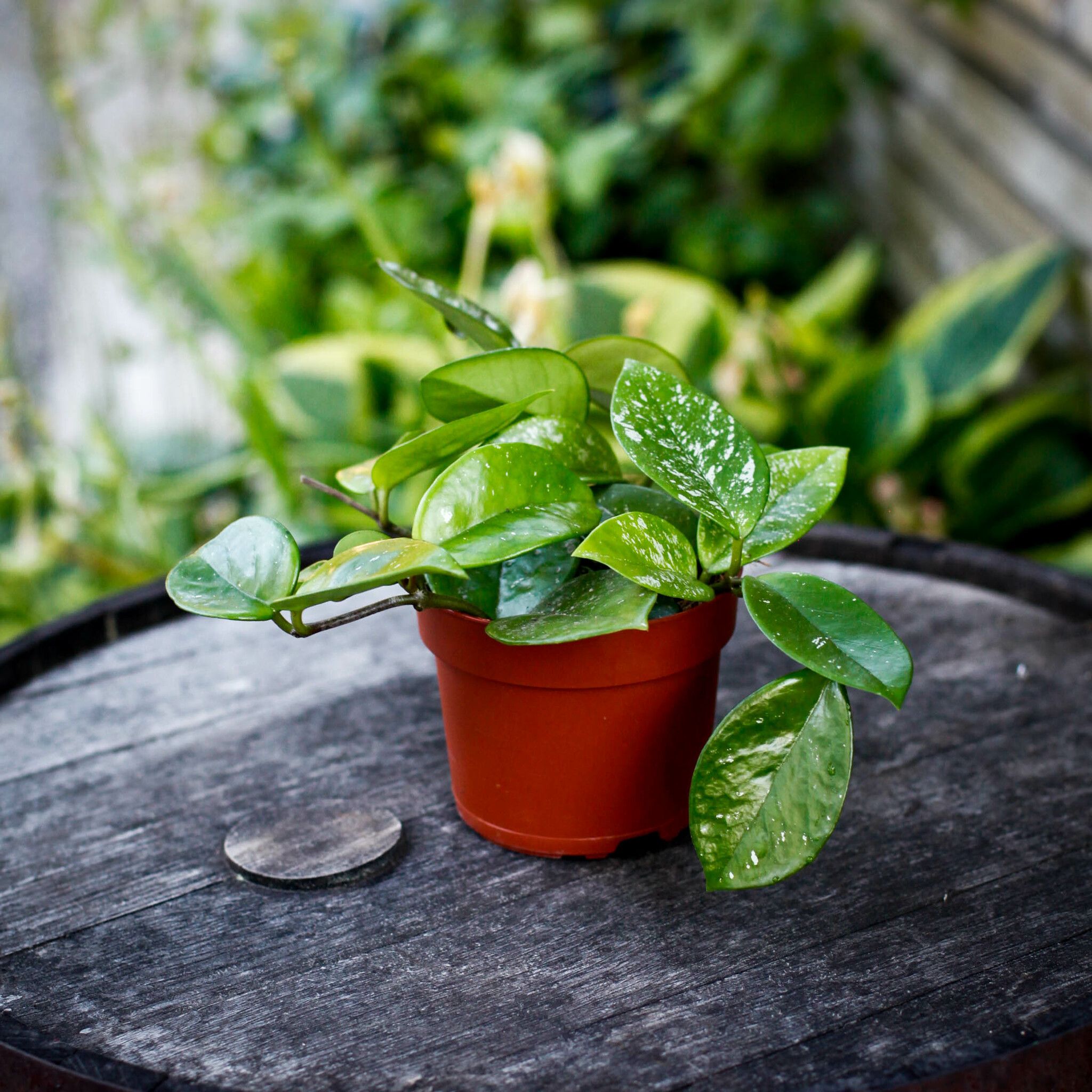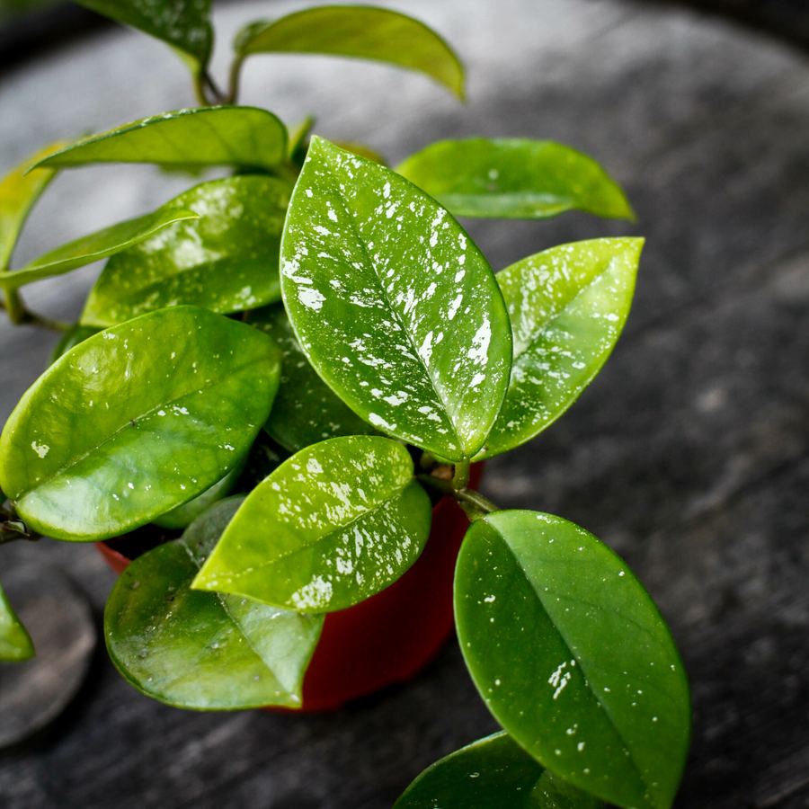 Hoya carnosa 'Freckles Splash' En tålig och populär hoyasort med ett livfullt och dekorativt bladverk som kännetecknas av silverstänk – som fräknar – på blanka, mörkgröna blad. En lättskött klassiker i hoyavärlden som passar både nybörjare och samlare.