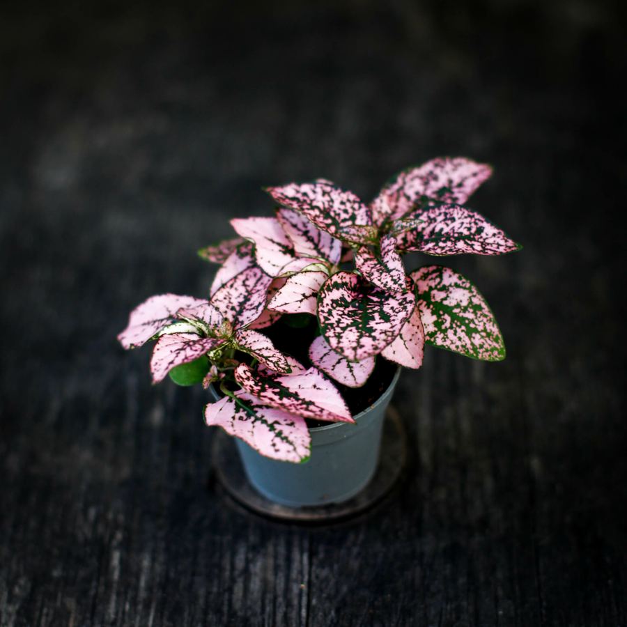 Hypoestes rosa, även kallad prickblad, är en dekorativ växt känd för sina livliga rosa blad med kontrasterande gröna mönster. Den ger ett lekfullt och färgstarkt inslag i alla inomhusmiljöer och kan odlas både som krukväxt och i blomsterarrangemang.