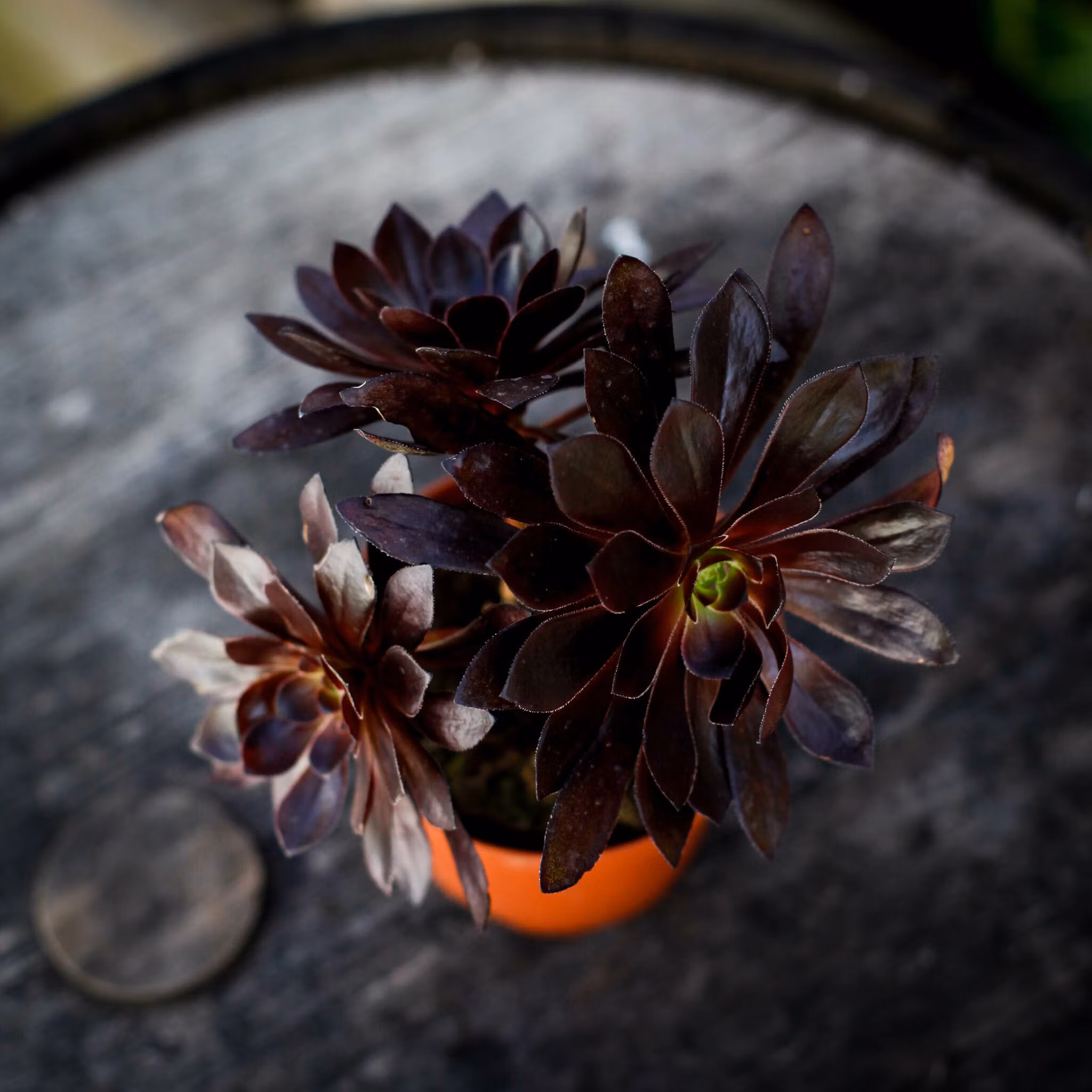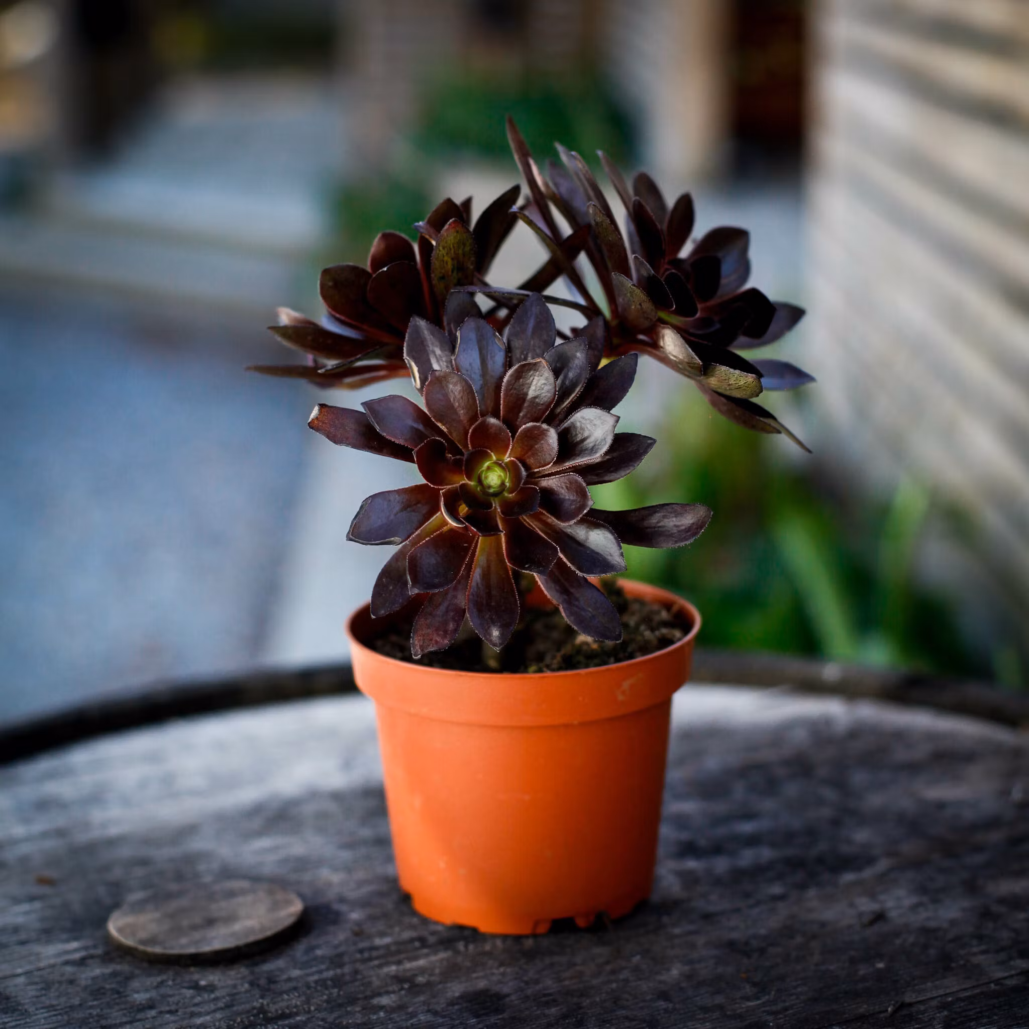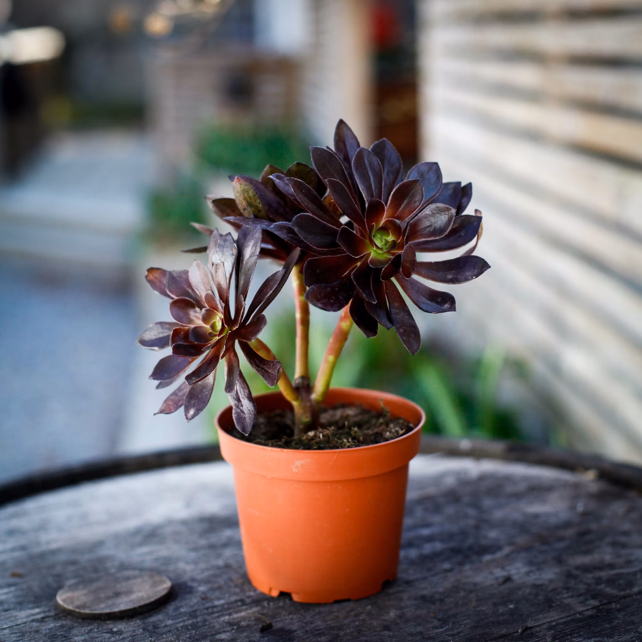 Mörka, gotiska Aeonium 'Schwarzkopf' för soliga platser. Stilfull och lättskött suckulent som ger dramatisk kontrast i både hem och trädgård.
