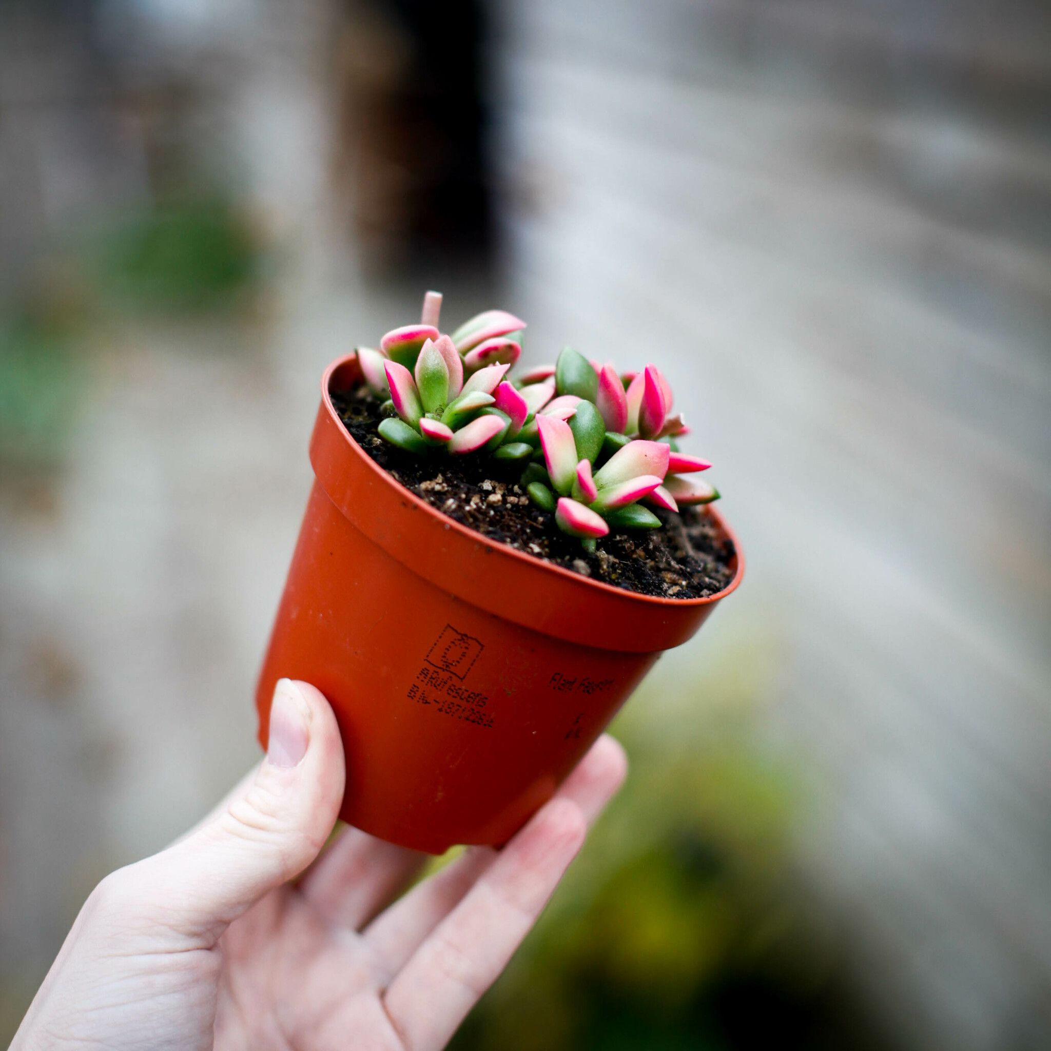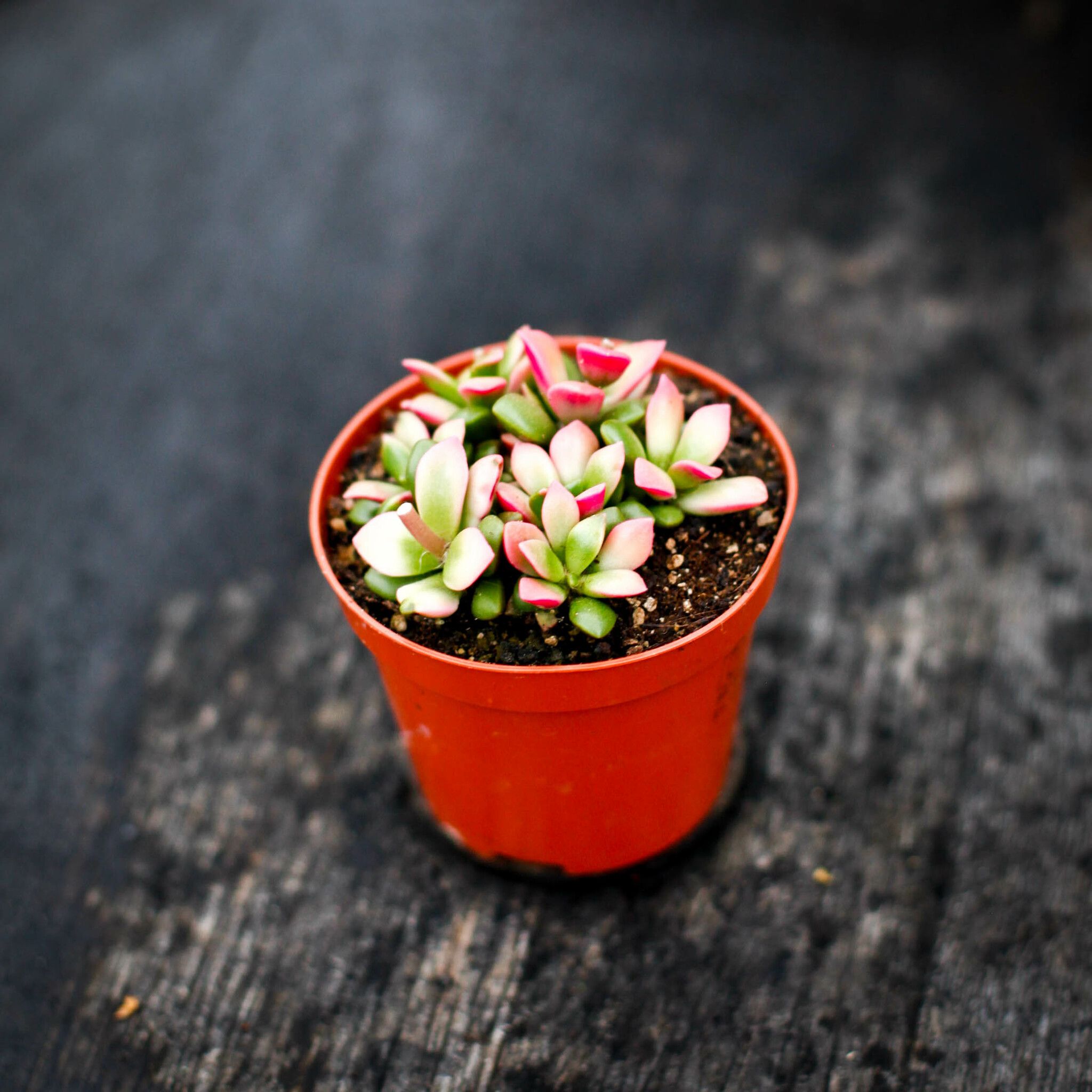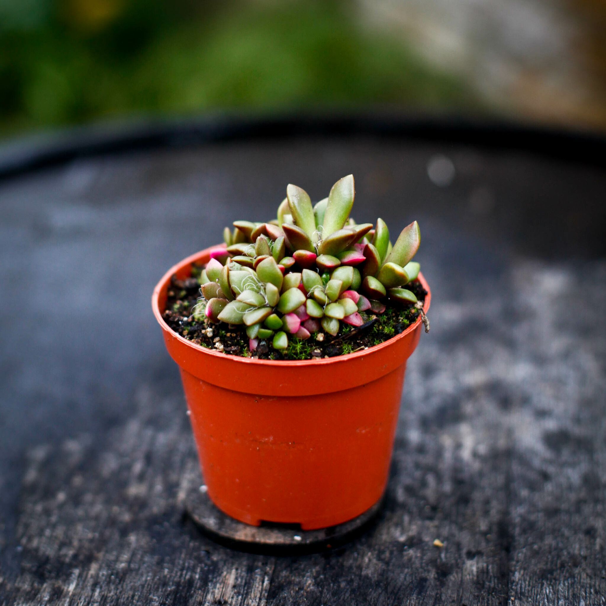Anacampseros rufescens 'Variegata' 8,5 cm, är en färgstark suckulent med gröna, rosa och lila blad. Lättskött, trivs i ljus och kräver minimal vattning. Perfekt
