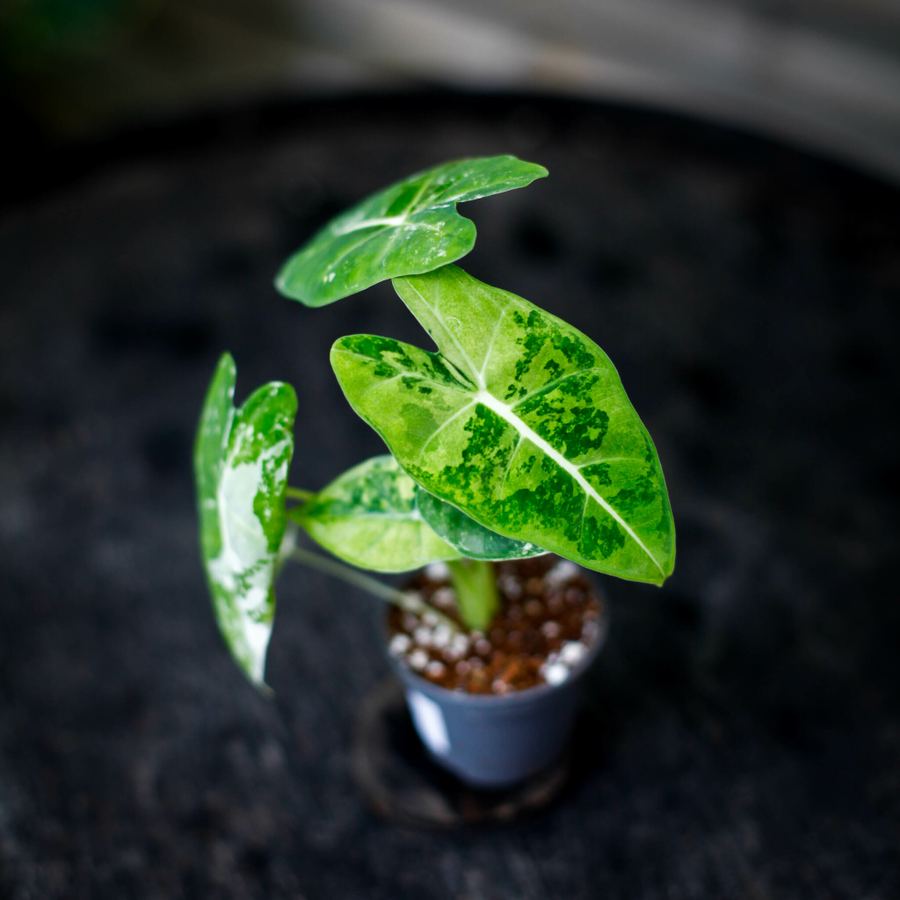 UNIK! Det du ser är det du köper! Alocasia Frydek Variegata - en sällsynt krukväxt med eleganta, djupt gröna blad och ljusa mönster. Köp den nu!