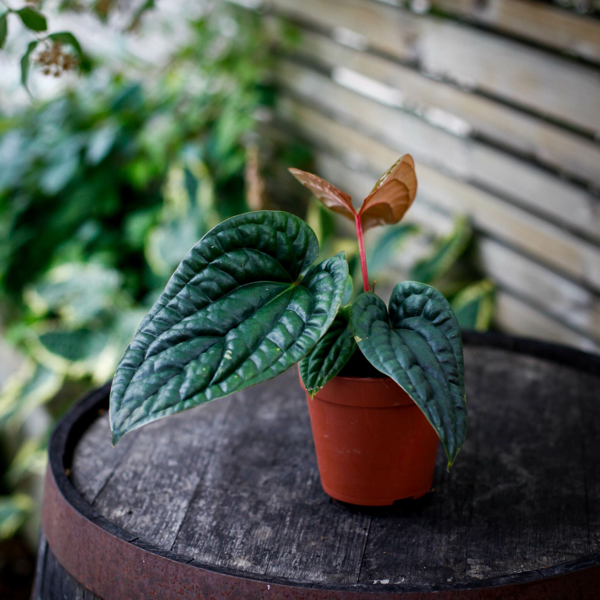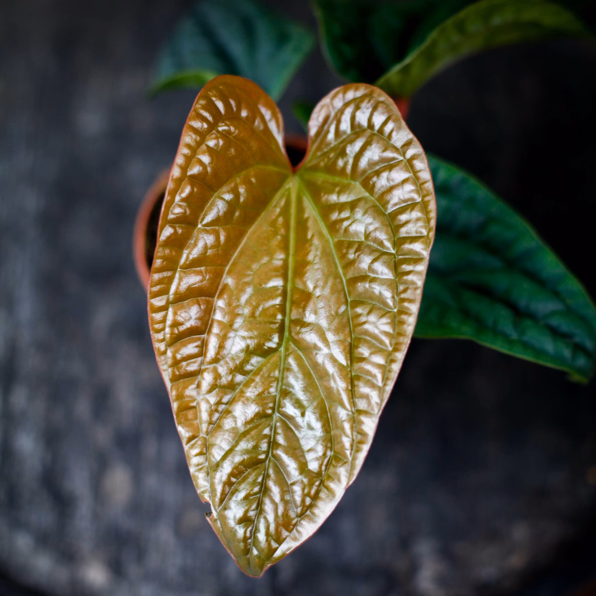 Anthurium luxurians x radicans är en hybrid som kombinerar det bästa av två populära arter. Denna växt imponerar med sina stora, djupt ådrade blad som har en nästan läderartad struktur och en elegant glans. Bladen är mörkgröna och utvecklas till en mer strukturerad yta med tiden, vilket ger växten ett unikt och exotiskt utseende.