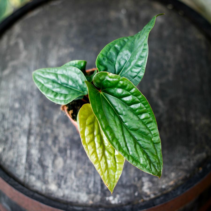 Anthurium luxurians x radicans är en hybrid som kombinerar det bästa av två populära arter. Denna växt imponerar med sina stora, djupt ådrade blad som har en nästan läderartad struktur och en elegant glans. Bladen är mörkgröna och utvecklas till en mer strukturerad yta med tiden, vilket ger växten ett unikt och exotiskt utseende.