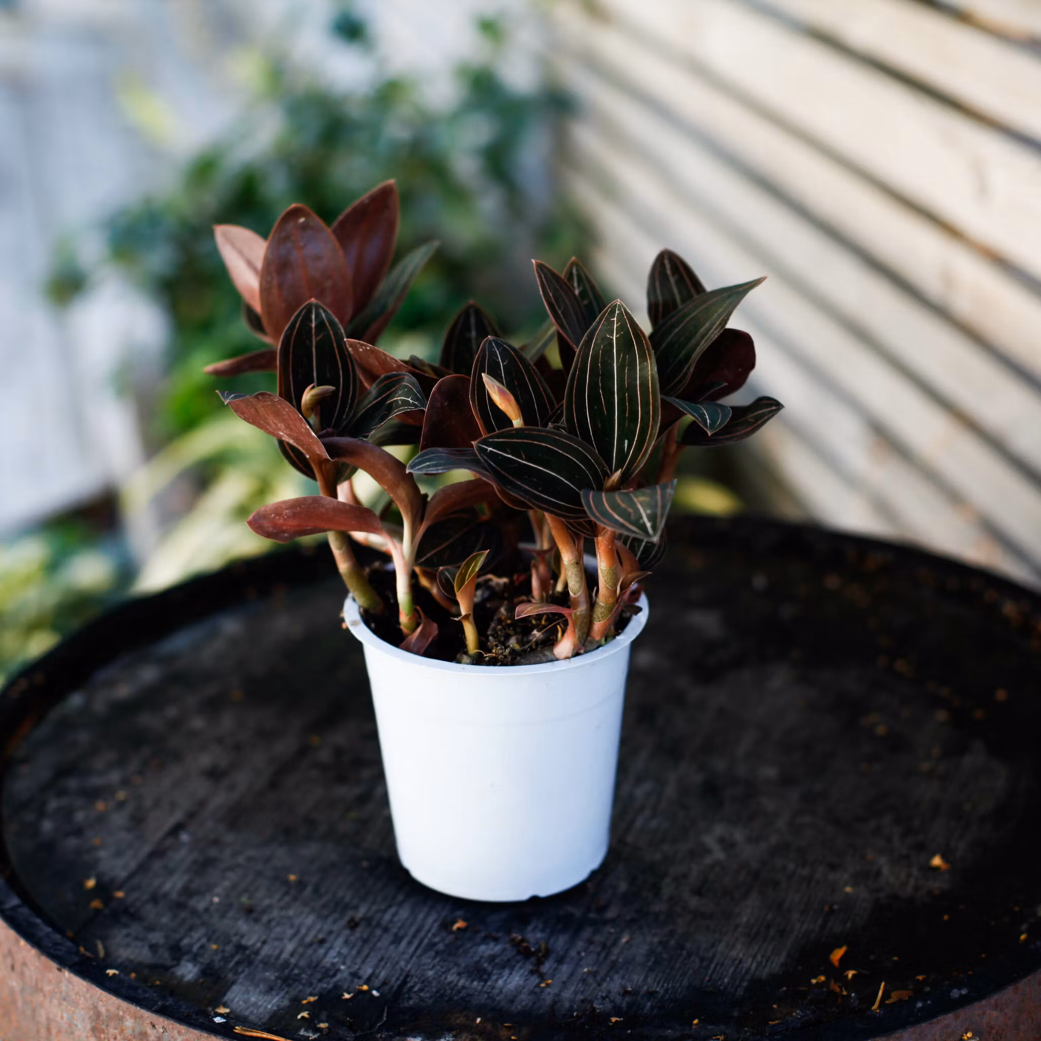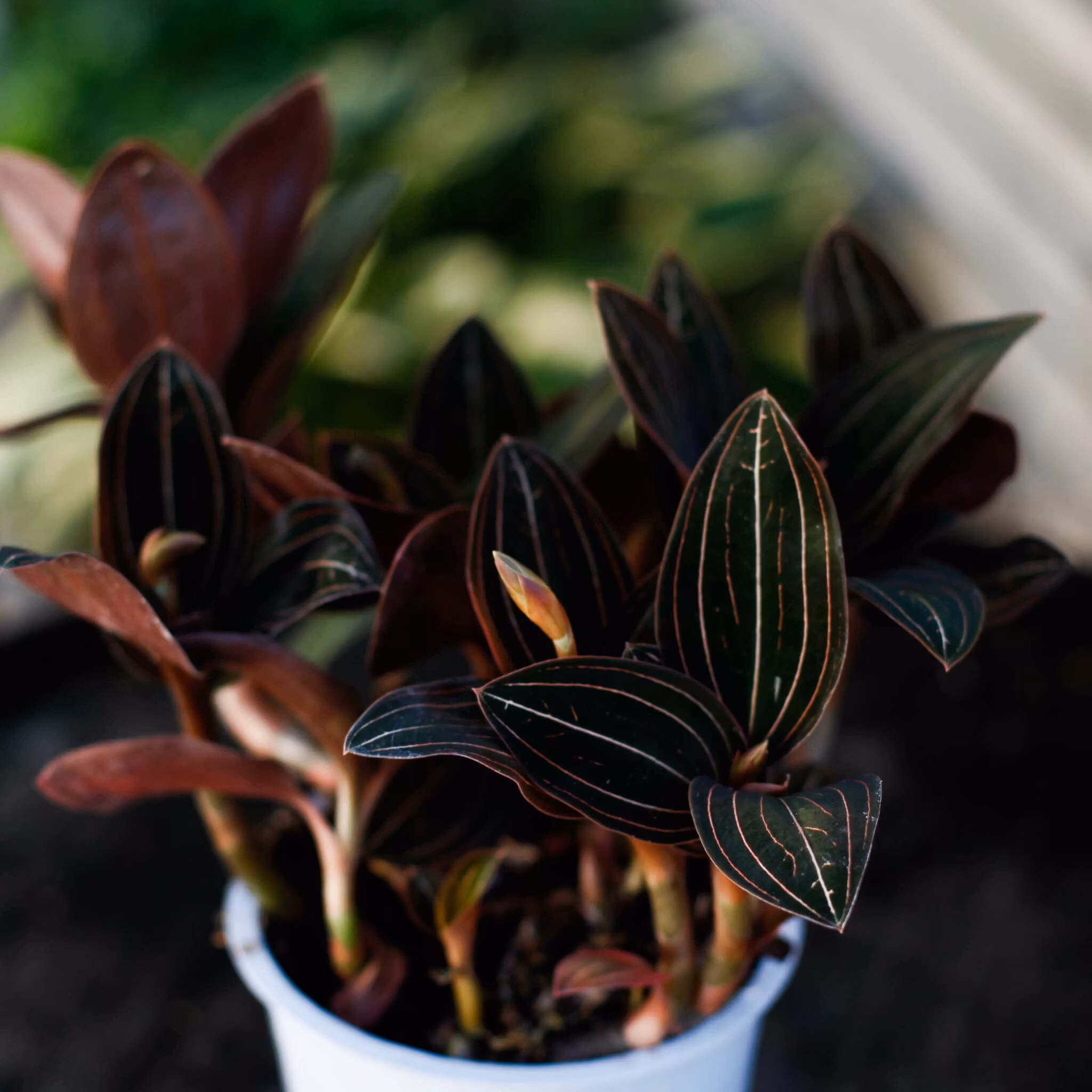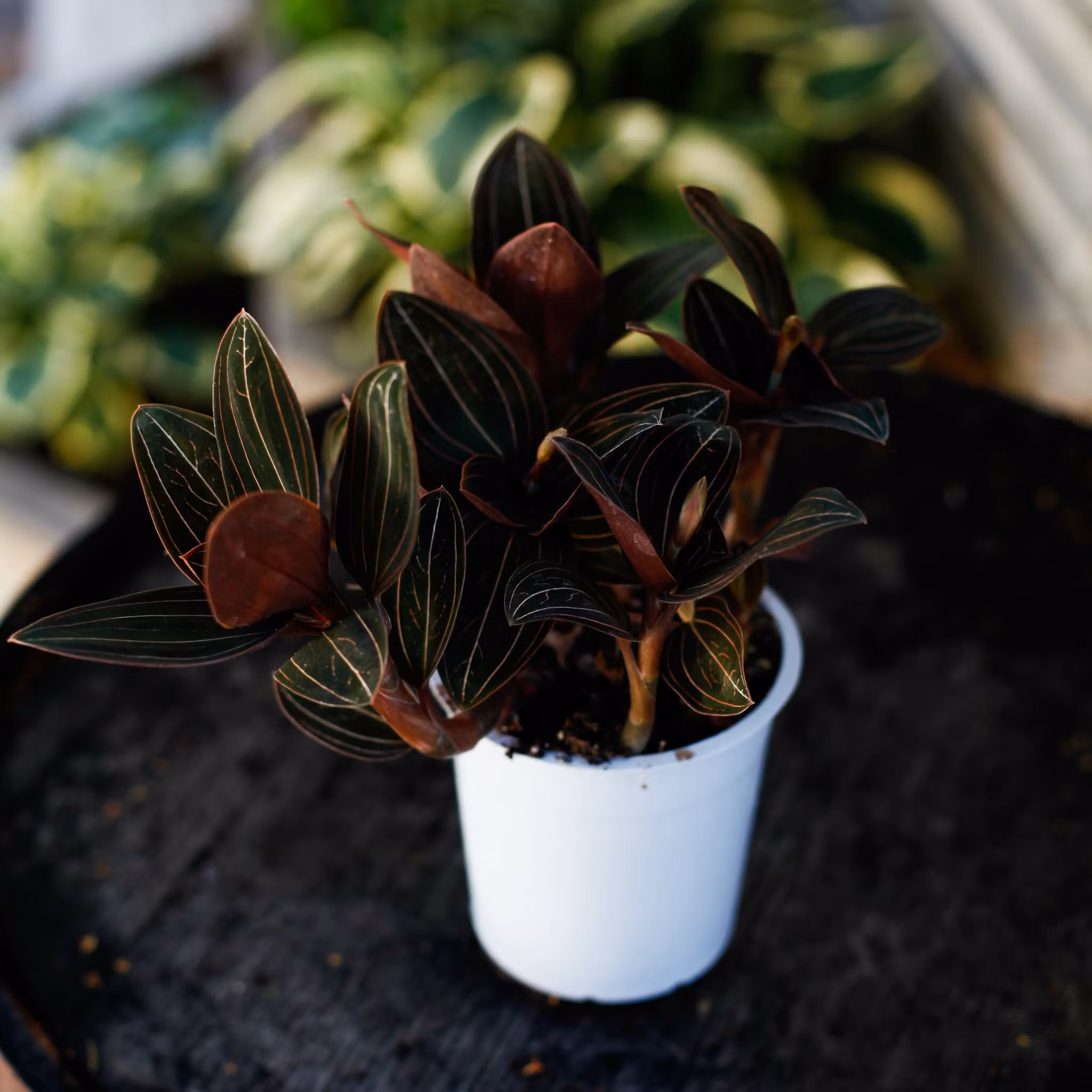 Ludisia discolor - orkidéart med slående blad i mörkgrönt till brunsvart och glänsande yta. Vackra, delikata blommor som kompletterar den unika looken!