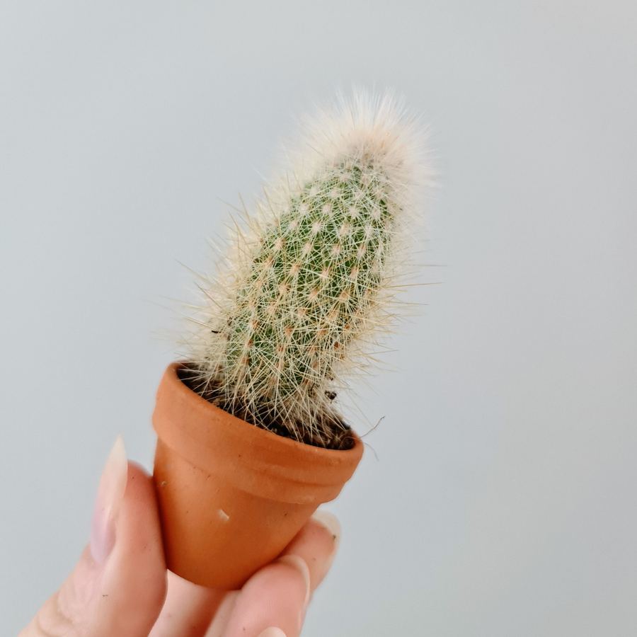 Minikaktus i lerkruka. Placera soligt, låt torka mellan vattningarna. Svag växtnäring vår-höst.