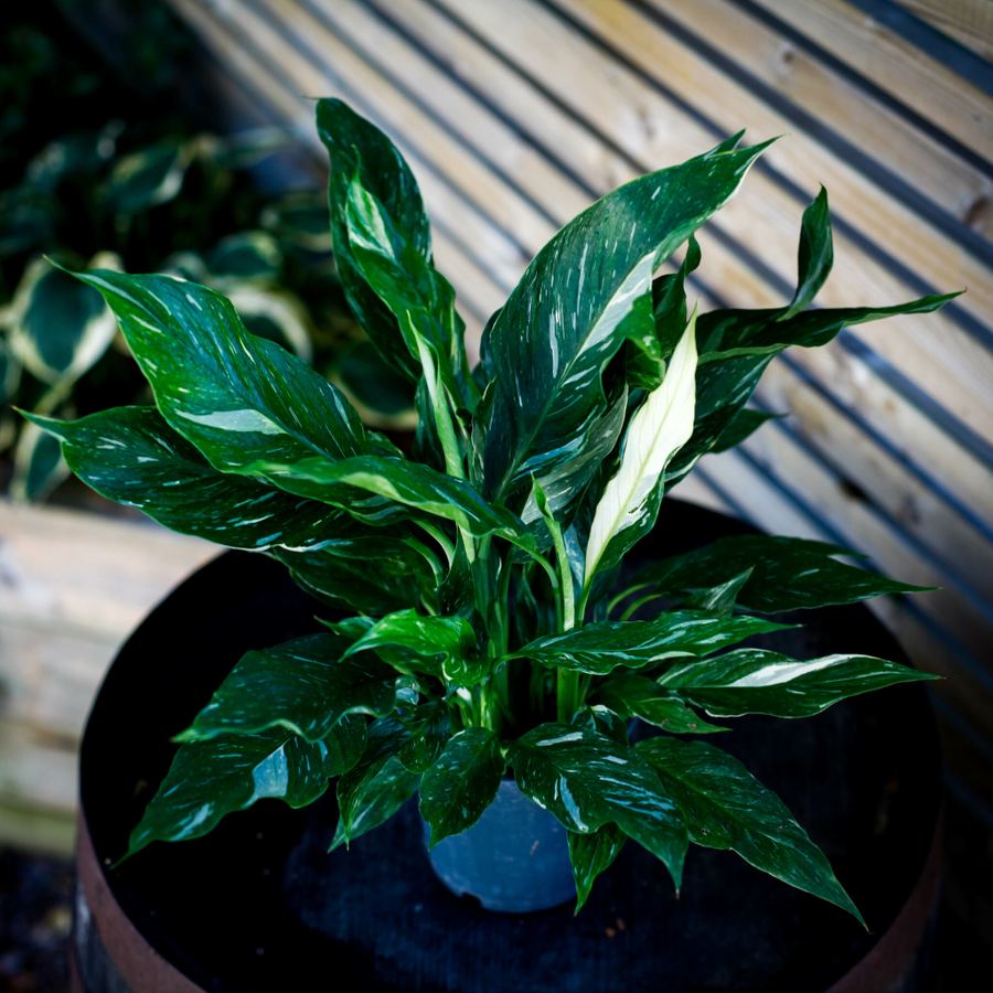 Spathiphyllum ’Domino’ är en fredskalla med vackra blad som är har inslag av vita partier. En växt som är lättskött och lättplacerad.