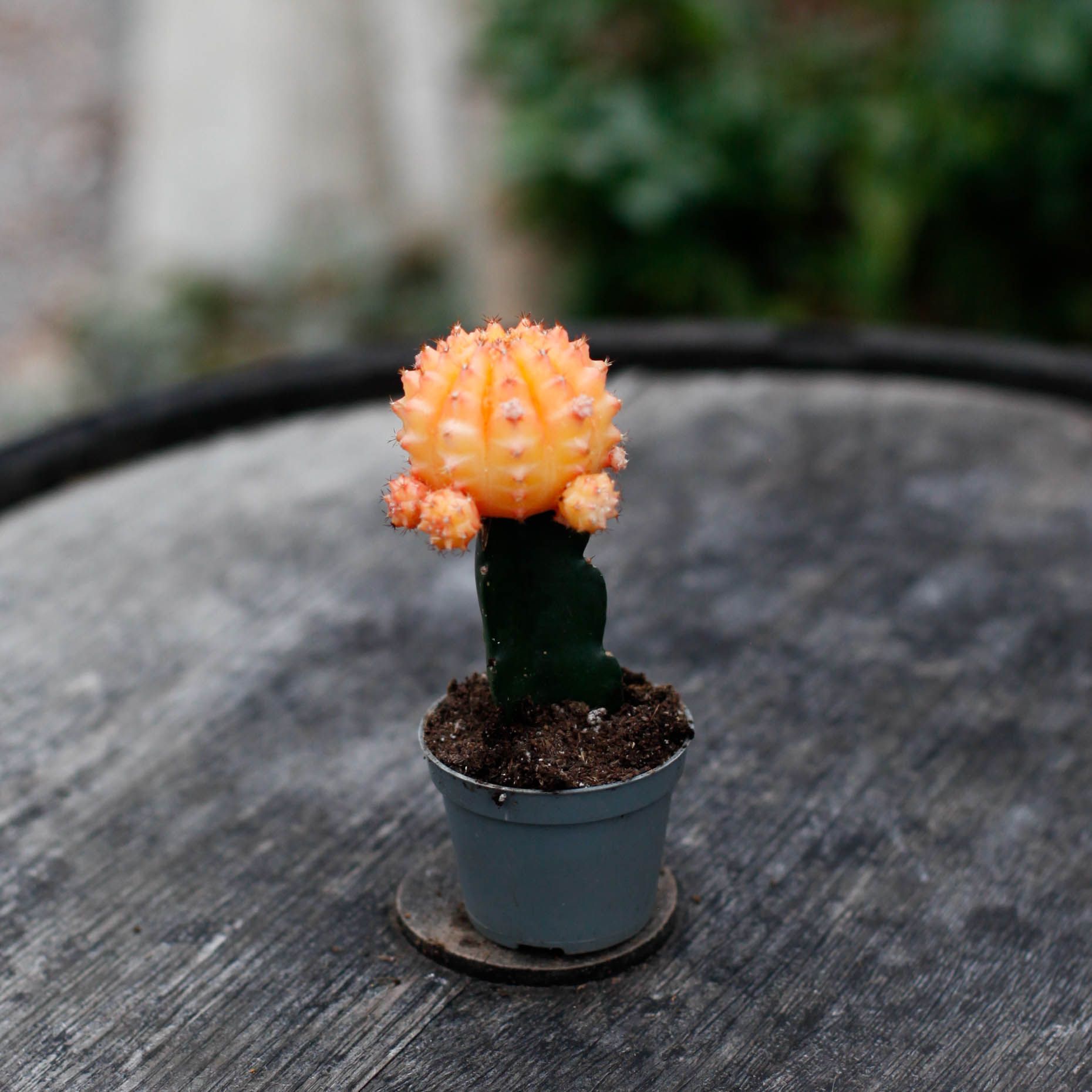 Gymnocalycium mihanovichii aprikos färgad, även känd som "Moon Cactus", är en unik och färgstark kaktus med en distinkt orange topp, som faktiskt är en muterad klon utan klorofyll. På grund av detta måste den ympas på en grön basväxt för att överleva. Den röda toppen är sfärisk och ribbad, vilket skapar ett iögonfallande kontrast mot den gröna stammen. Växten är kompakt och lättskött, vilket gör den idealisk för små utrymmen som fönsterbrädor eller skrivbord. Gymnocalycium mihanovichii trivs i ljusa, indirekta ljusförhållanden och behöver minimal vattning, vilket gör den perfekt för nybörjare och kaktusälskare. Dess unika utseende gör den till ett levande konstverk som tillför färg och karaktär till alla inomhusmiljöer.