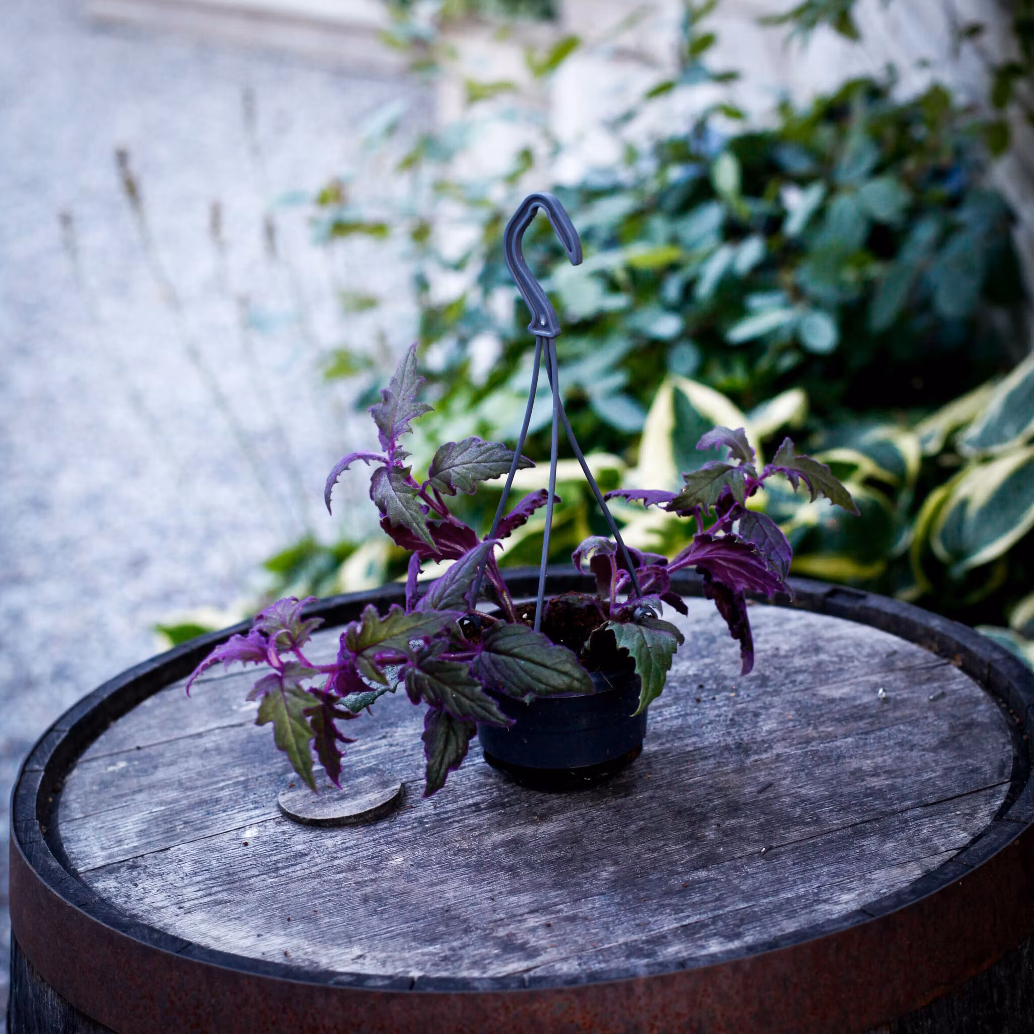 Gynura aurantiaca 'Purple Passion' i ampel, är en vacker och färgglad växt som lyser upp vilket rum som helst med sin lila färgprakt.