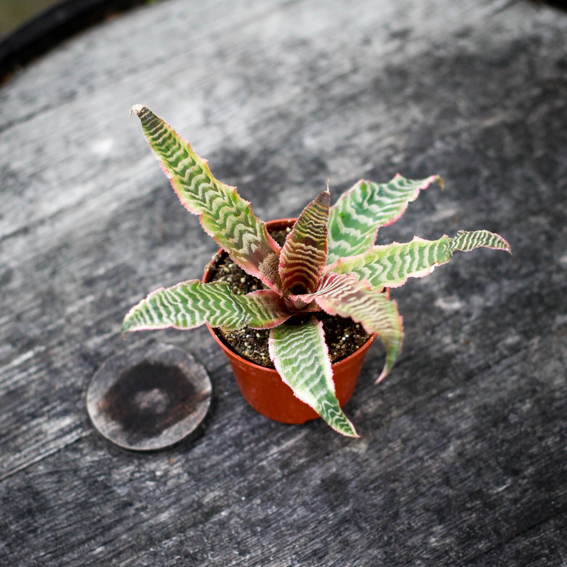Upptäck Cryptanthus 'Elaine', en tålig bromeliad med unika rosa och gröna mönster. Perfekt för att ge ditt hem en exotisk touch! Köp nu på klorofyllverket.se.