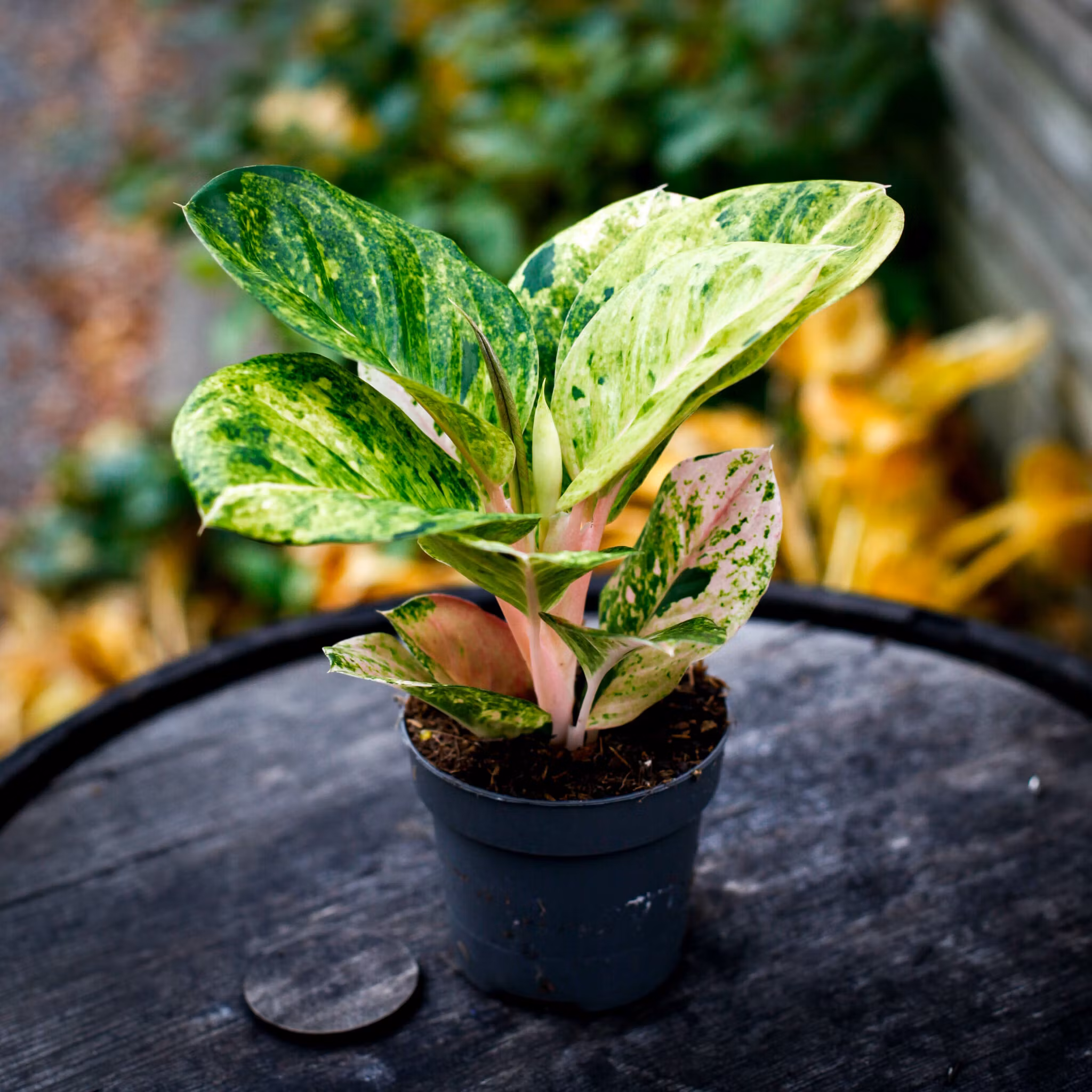 Aglaonema 'Apple Fantasy' är en tropisk skönhet med rosa, gröna och krämvita blad. Perfekt för halvskugga, håll jorden fuktig och njut av dess livfullhet.