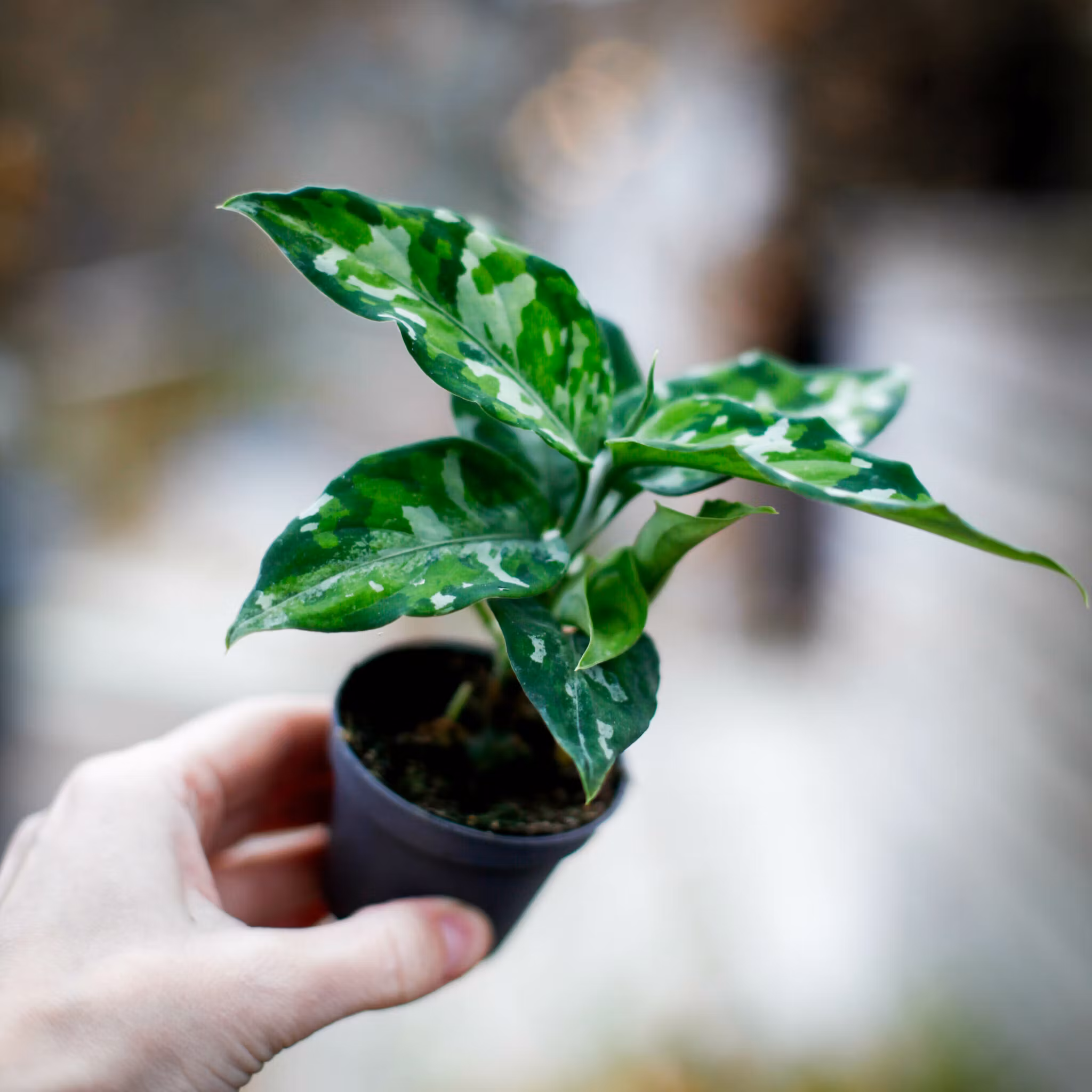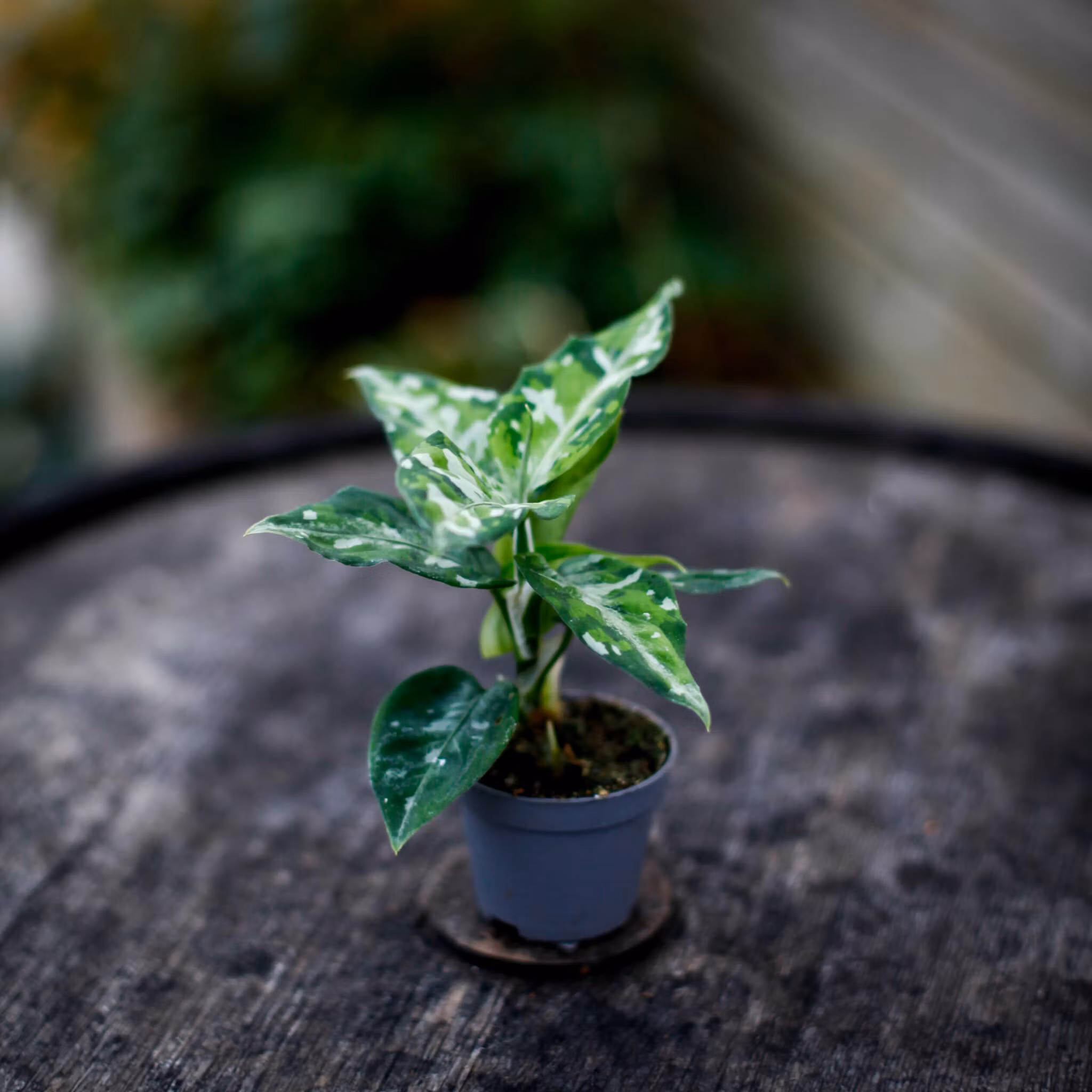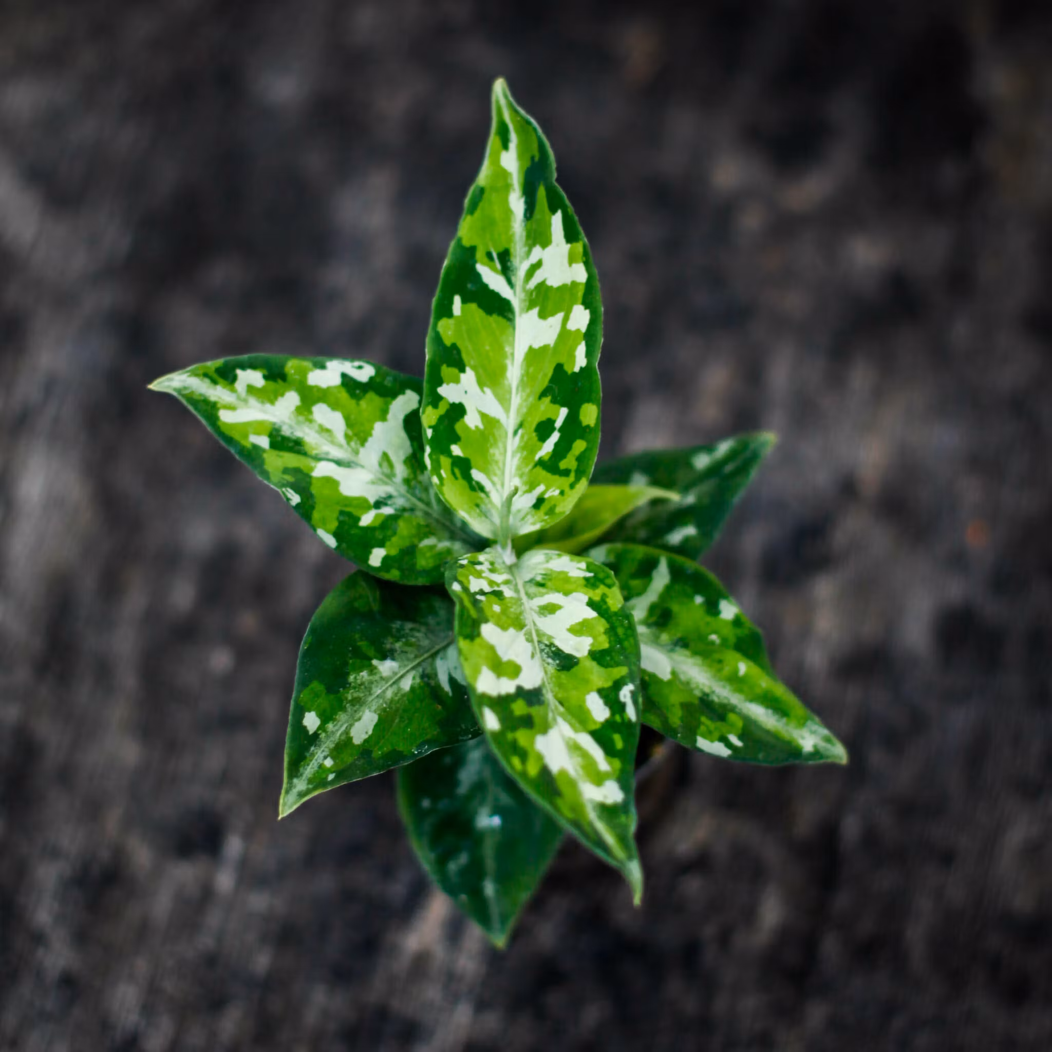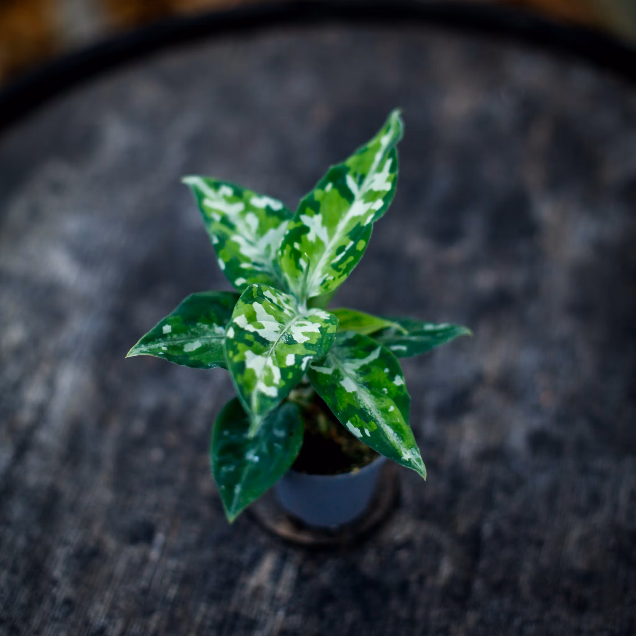 Aglaonema 'Tricolor' 6 cm är en ovanlig och vacker Silverkalla med unika camouflagemönstrade blad. Köp hos Klorofyllverket