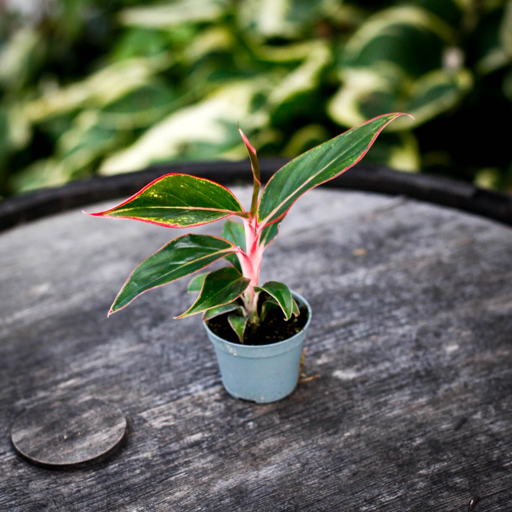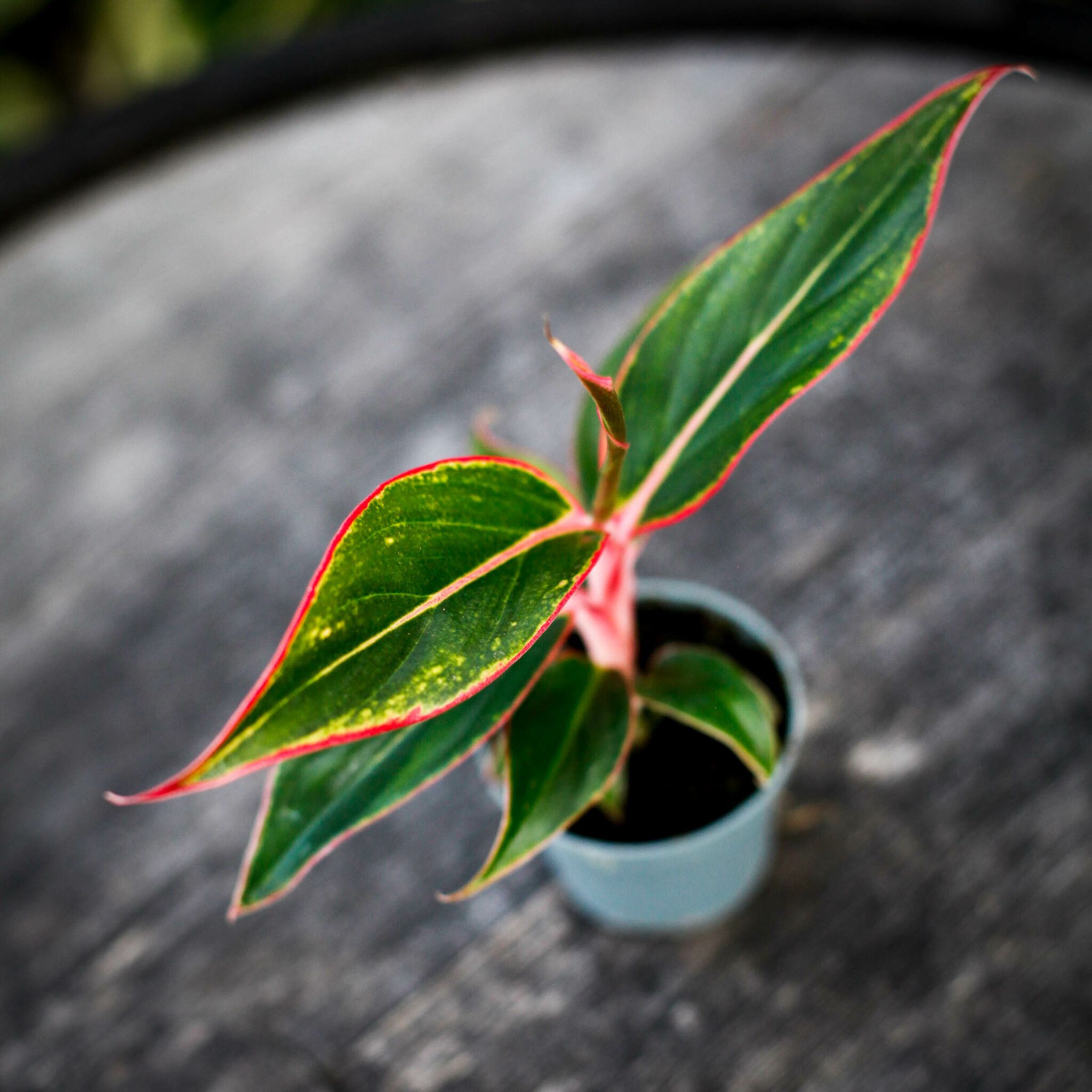 Aglaonema 'Siam Aurora' är en tropisk skönhet med röda och rosa bladkanter. Perfekt för inomhusmiljöer, enkel att sköta och en riktig blickfångare.