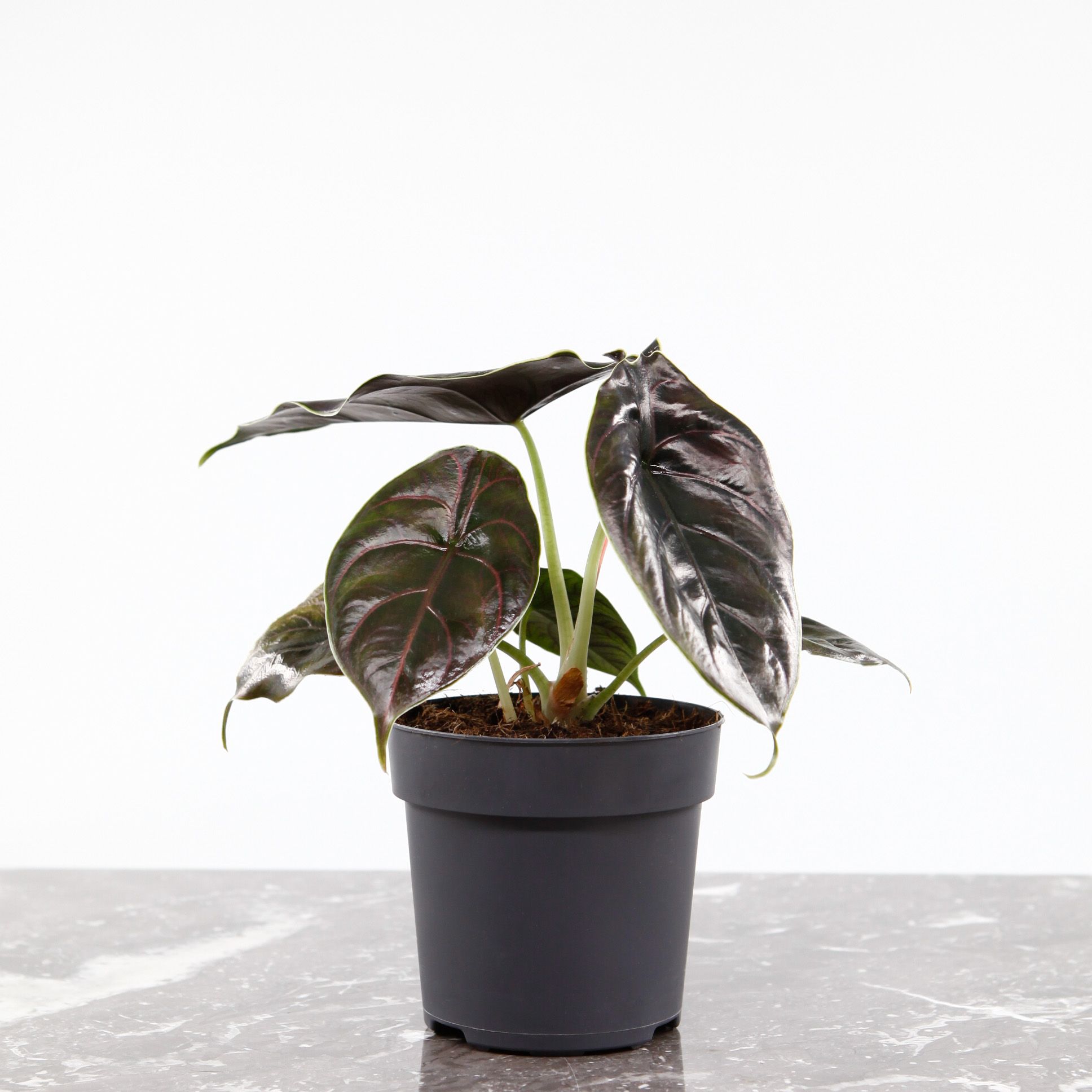 Alocasia 'Azlanii' – en exotisk pärla från Bruneis regnskogar. Skapa en inomhusdjungel med dess metalliska lila blad och dramatiska ådror.🌿