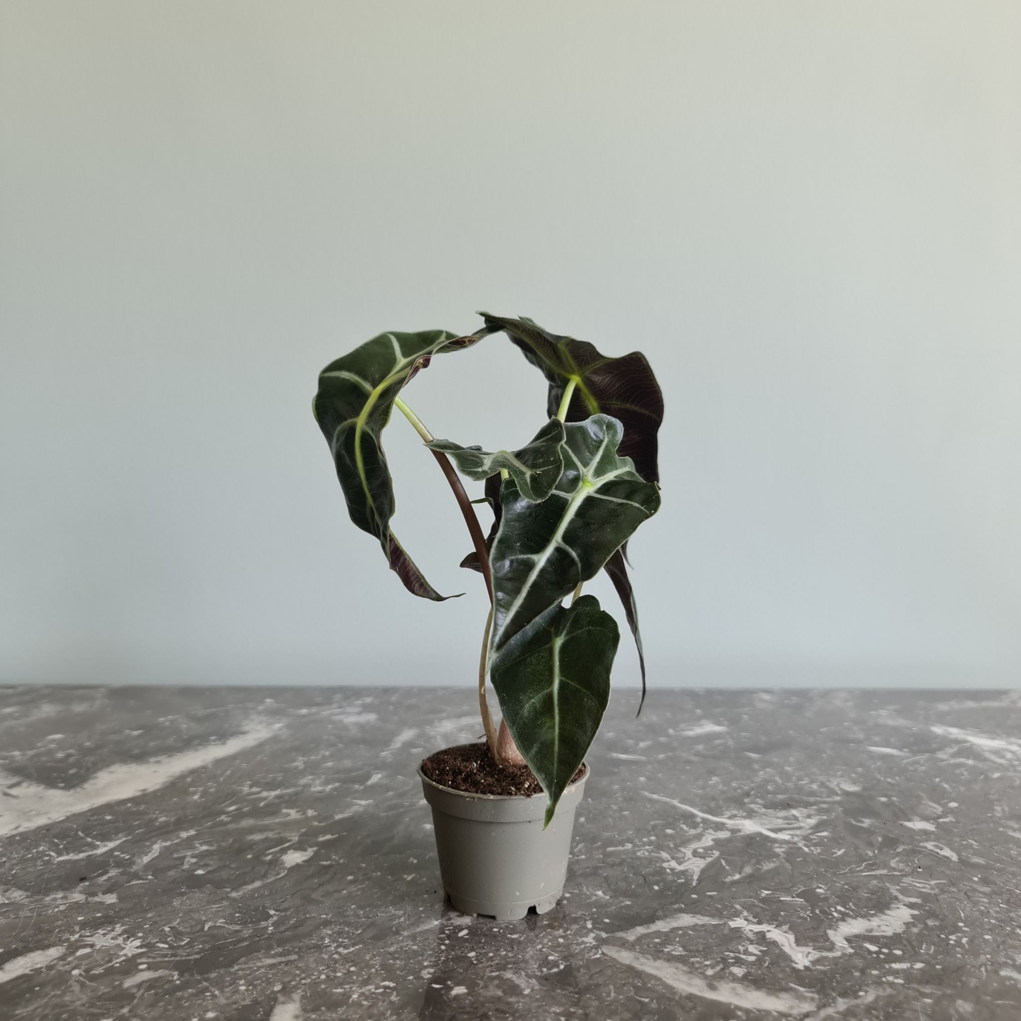 Alocasia 'Polly', även känd som "African Mask" eller "Elephant Ear", är en populär växt med sina imponerande, glänsande, hjärtformade blad och eleganta silhuett. Denna tropiska växt med sina mörkgröna blad och silvriga ådringar är inte bara vacker, utan den har också en lätt och vacker stil som gör den till en favorit bland växtälskare och inredare.