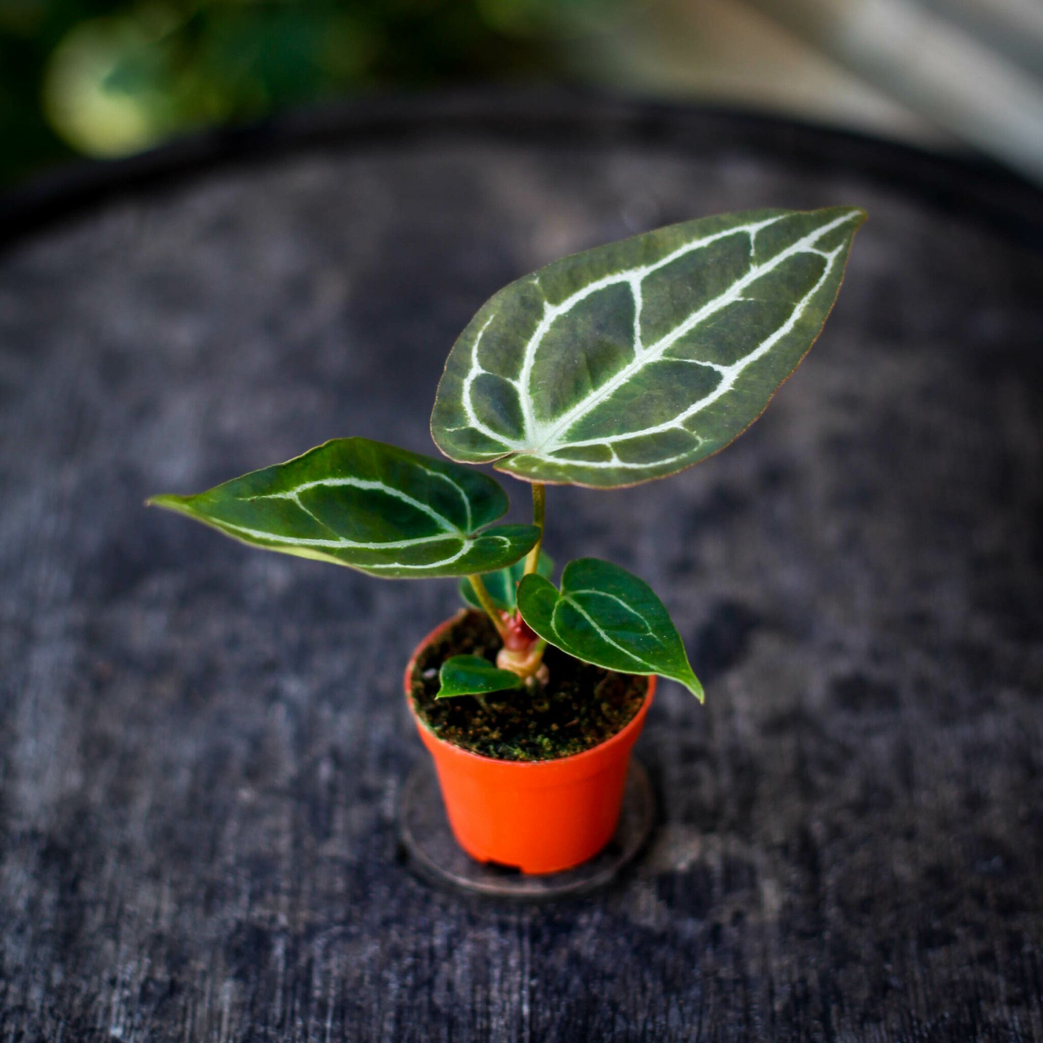 Upptäck Anthurium crystalliniums 6 cm, sammetlika blad och silvriga vener. Idealisk för skuggiga platser i hemmet. Skönhet i halvskugga!