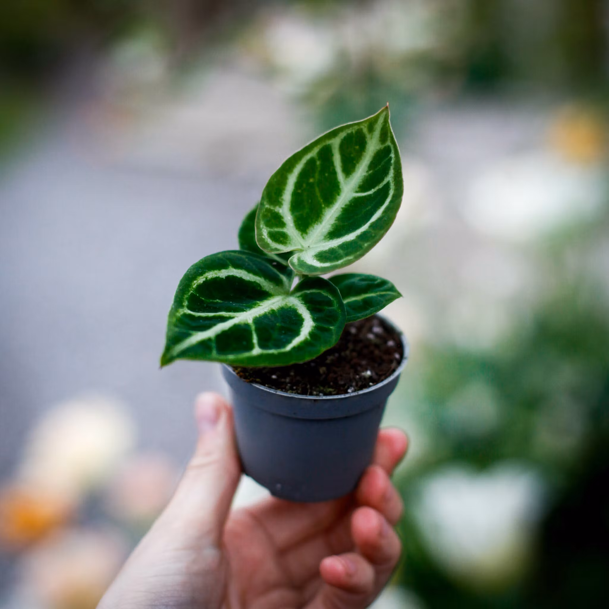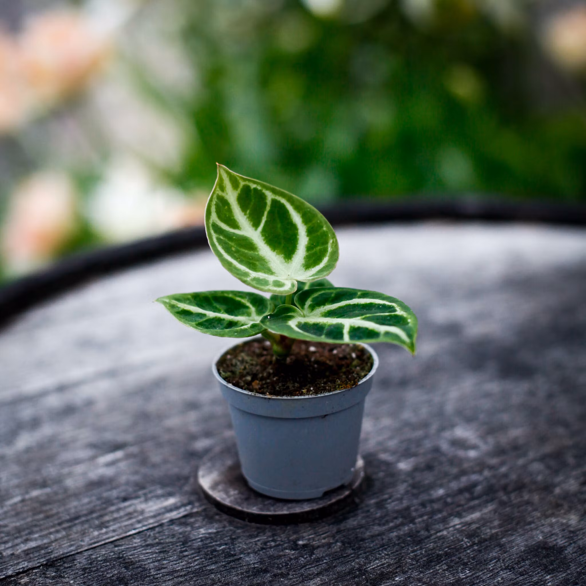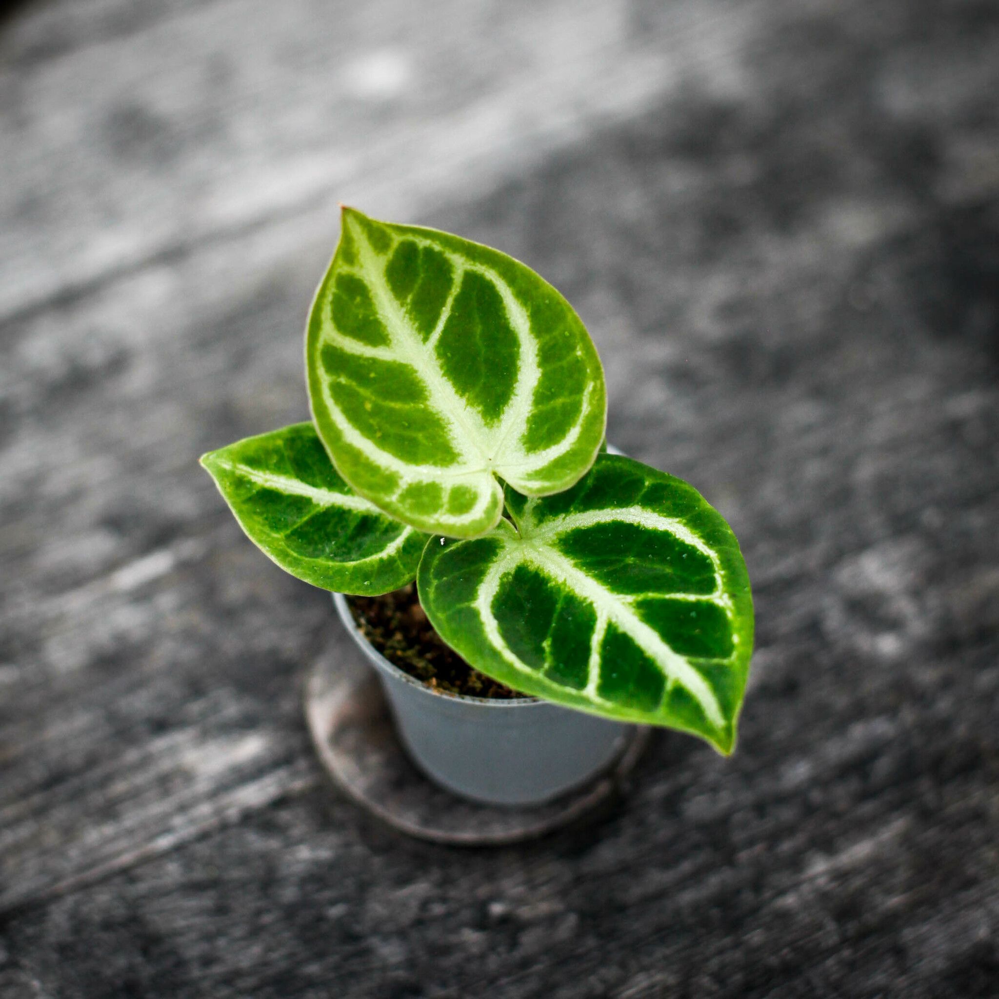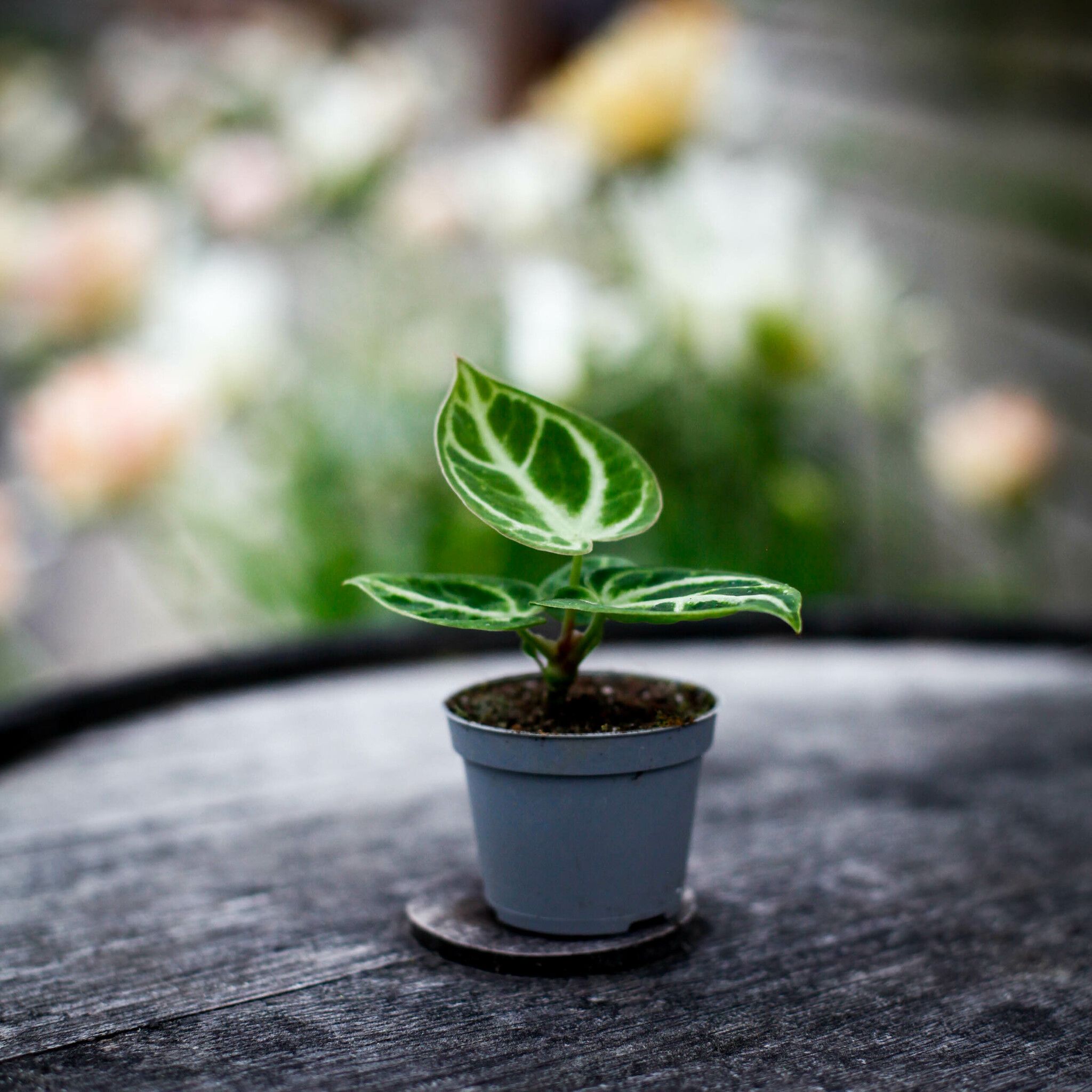 Anthurium crystallinum 'Dorayaki' – en unik samlarväxt med runda, sammetslena blad som påminner om japanska bakelser. Perfekt för eleganta växtsamlingar.