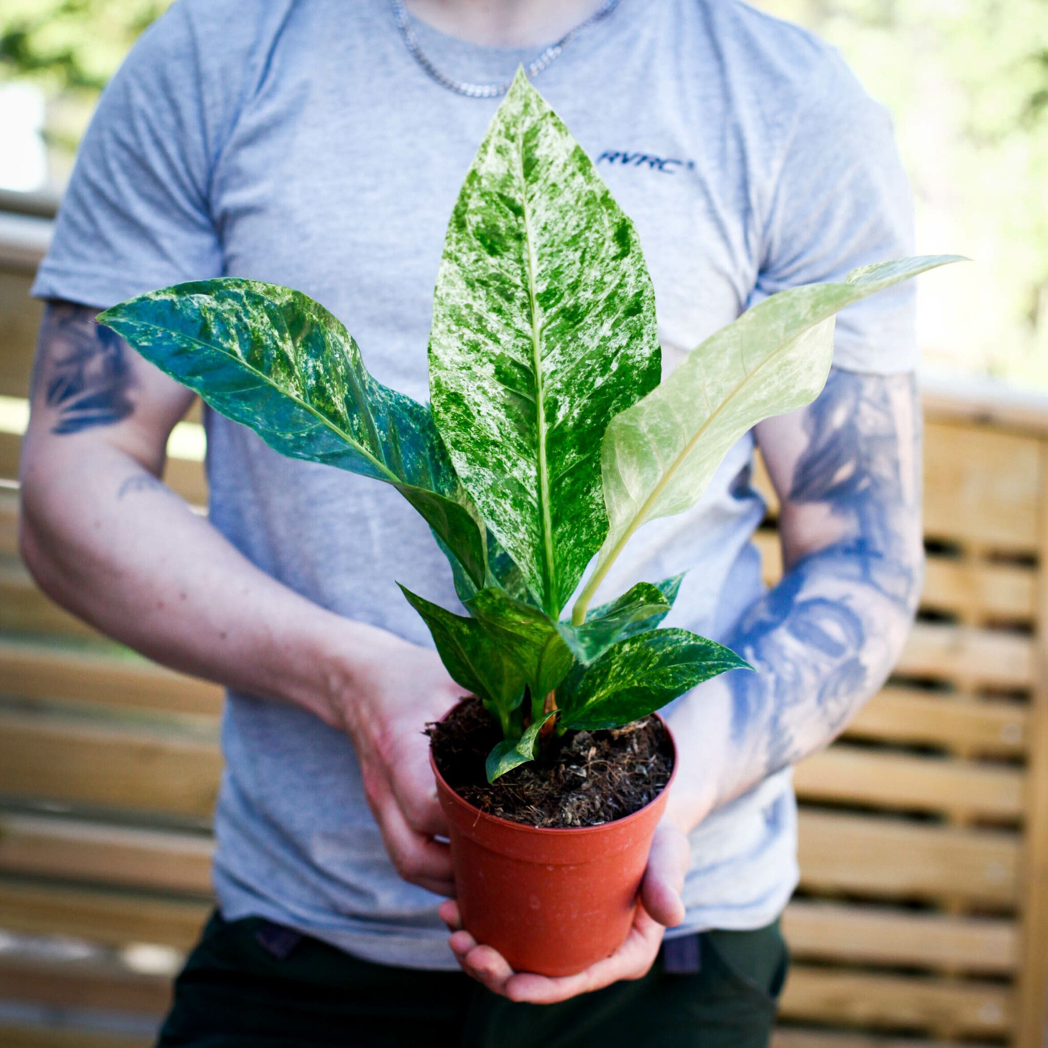 Anthurium hookeri 'Variegata' är en spektakulär växt som sticker ut med sina stora, breda blad dekorerade med ett fantastiskt mönster av grönska och vita eller gulaktiga variegeringar. Denna tropiska skönhet är både ett samlarobjekt och en iögonfallande inomhusväxt som tillför elegans och exotisk charm till alla miljöer. Hög variegering!