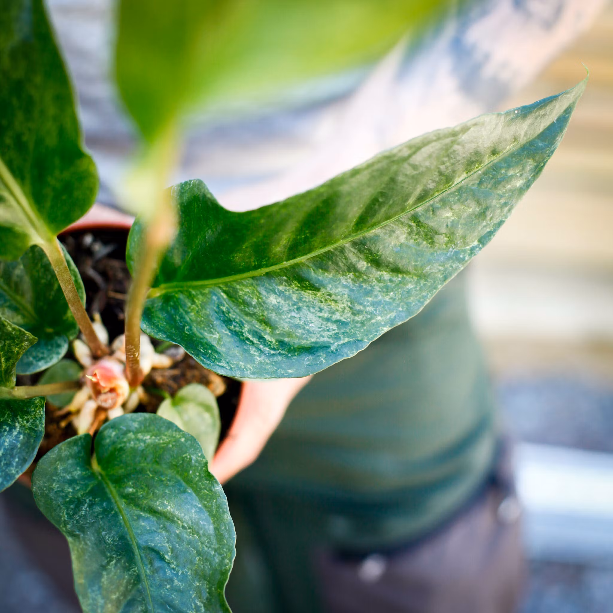 Anthurium hookeri 'Variegata' 12 cm - en tropisk skönhet med variegerade blad. Perfekt för att skapa exotisk atmosfär och elegans i ditt hem. Köp nu hos Klorofy
