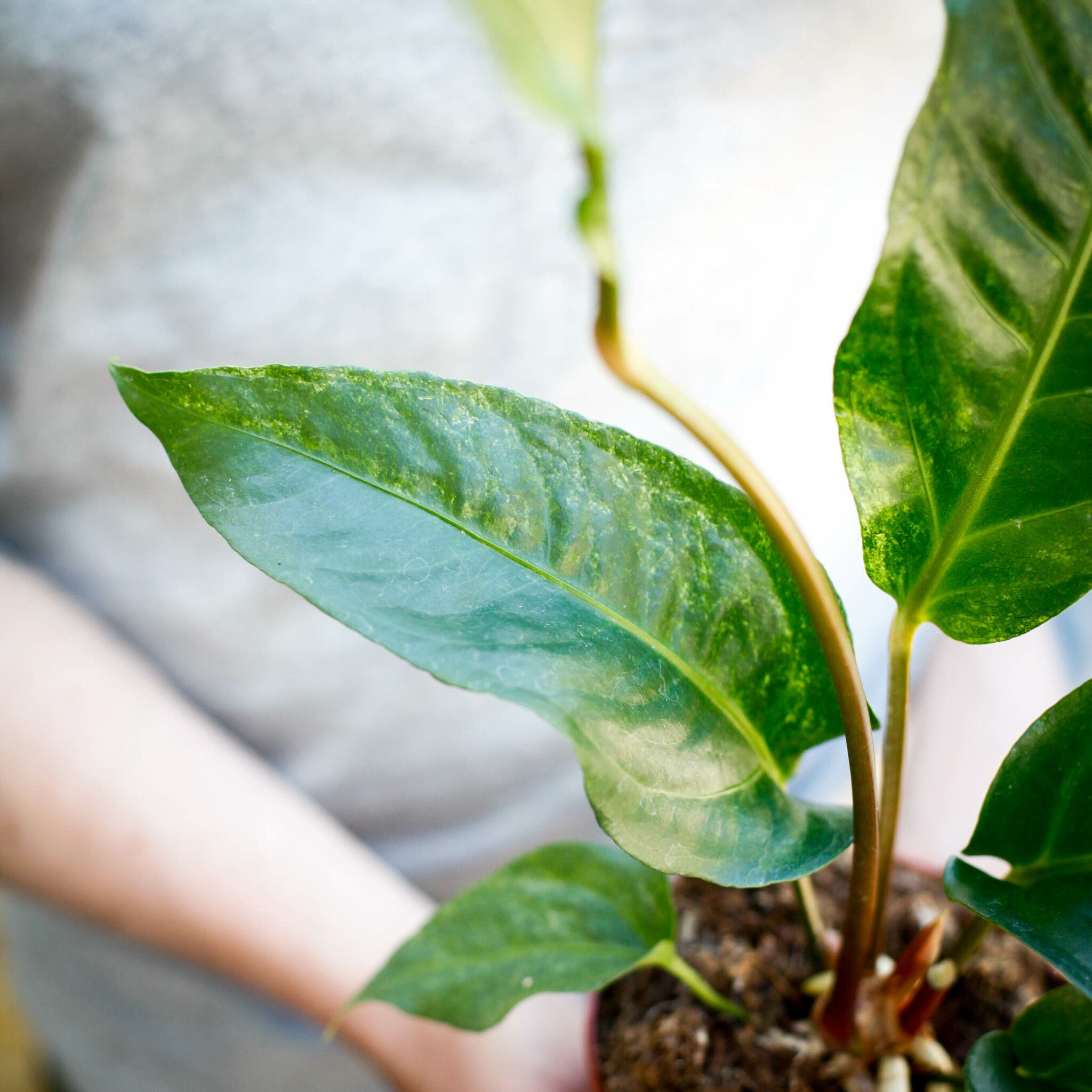 Anthurium hookeri 'Variegata' 12 cm - en tropisk skönhet med variegerade blad. Perfekt för att skapa exotisk atmosfär och elegans i ditt hem. Köp nu hos Klorofy
