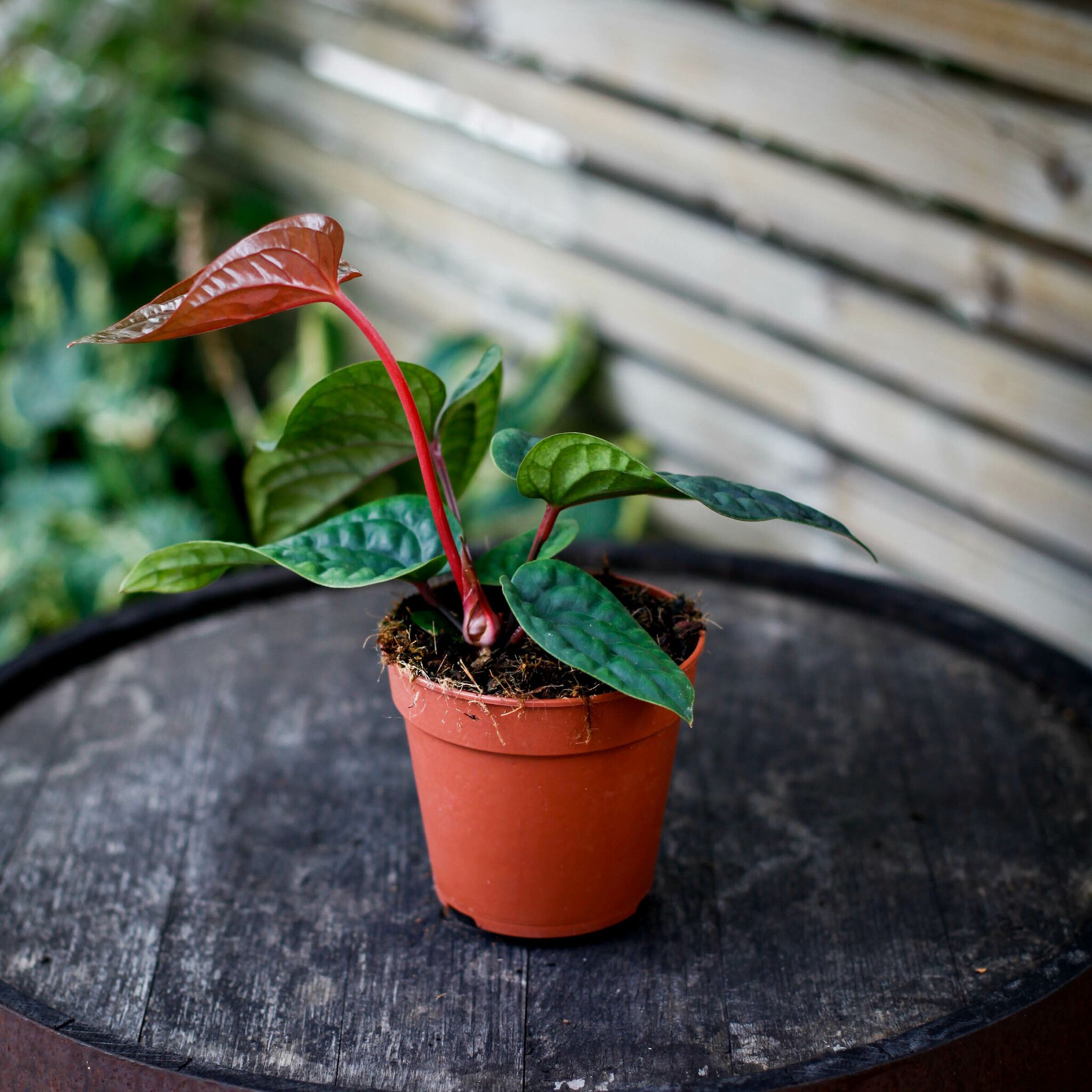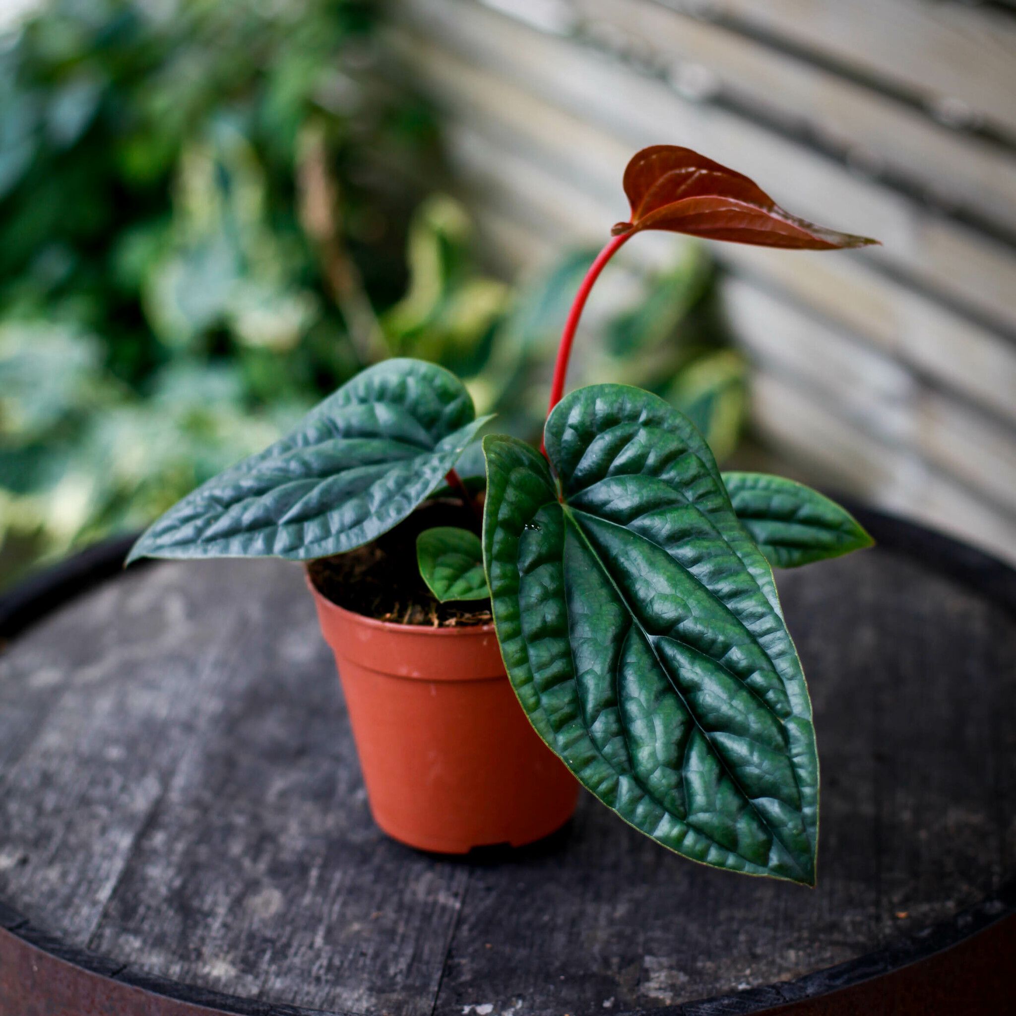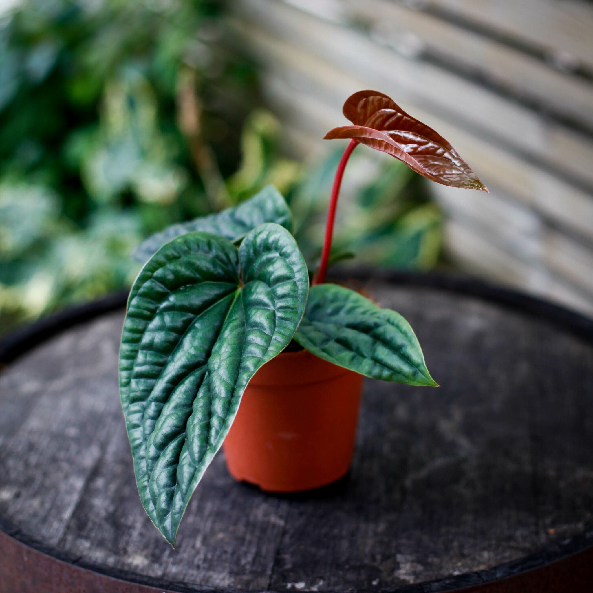 Köp Anthurium luxurians x radicans: unik hybrid med läderartade, glansiga blad. Perfekt för en tropisk känsla i hemmet. Köp exakt den växt du ser!