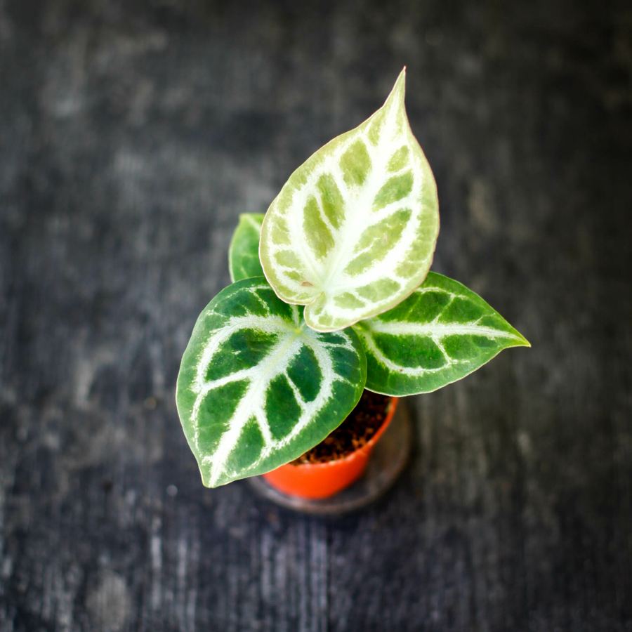 Anthurium 'Silver Blush' är en tropisk växt som kännetecknas av sina stora, hjärtformade blad med silvriga ådror. Växten har en elegant och exotisk utstrålning och är idealisk för inomhusmiljöer där den kan få bästa möjliga ljusförhållanden och skyddas från direkt sol.