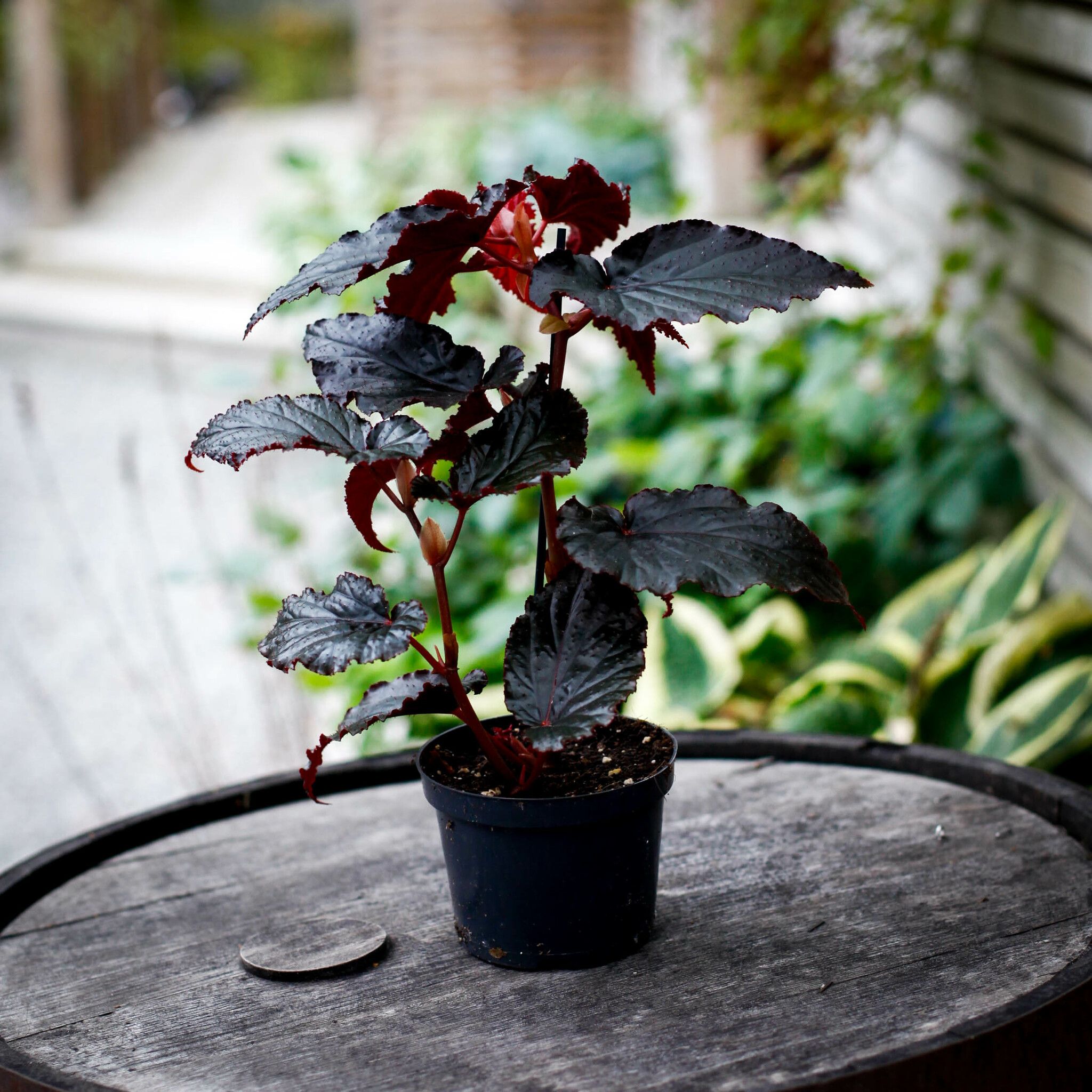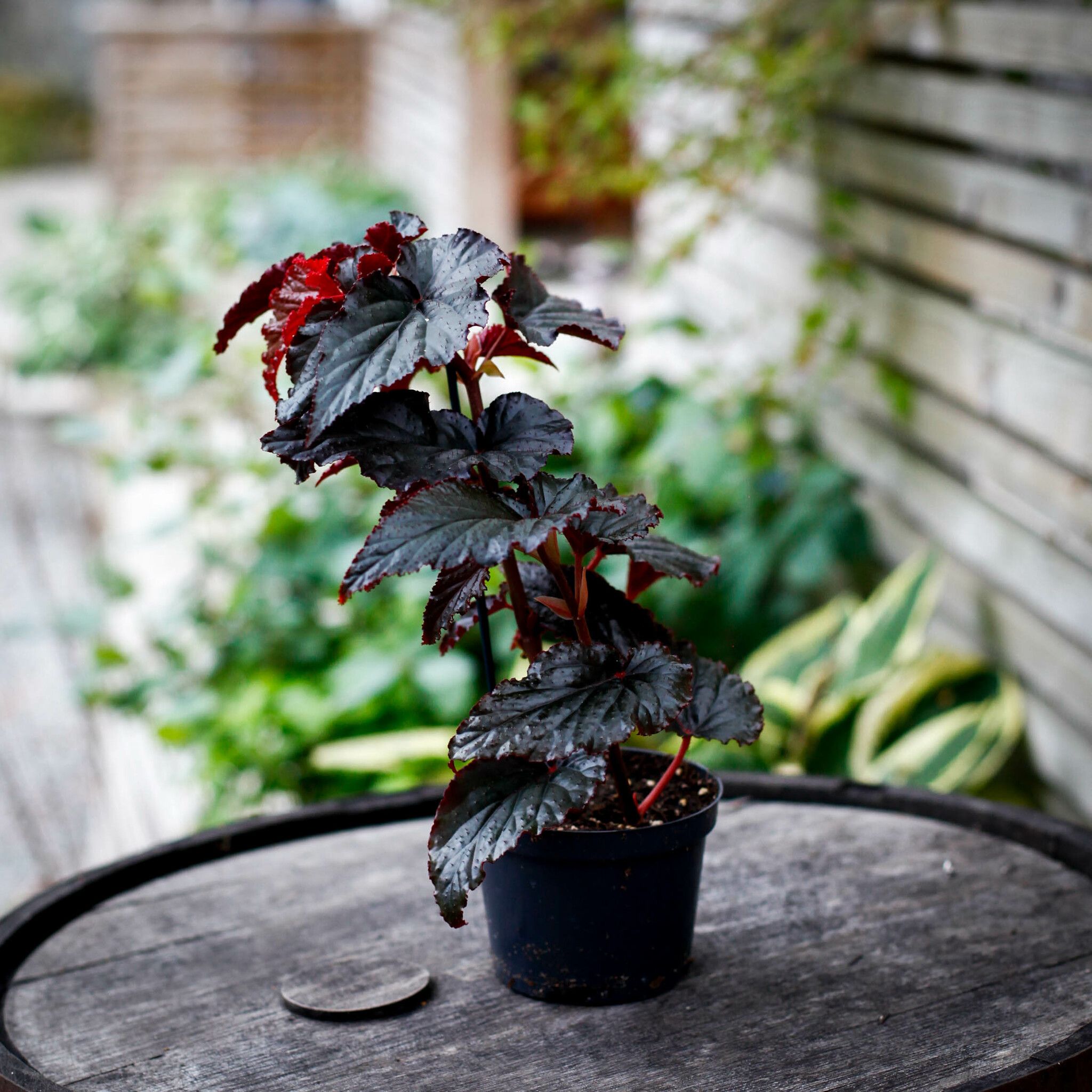 Begonia 'Arabian Sunset' - en prydnadsbegonia med mörka, dramatiska blad. Perfekt för inredning med starka färgskiftningar och lättskötta behov.