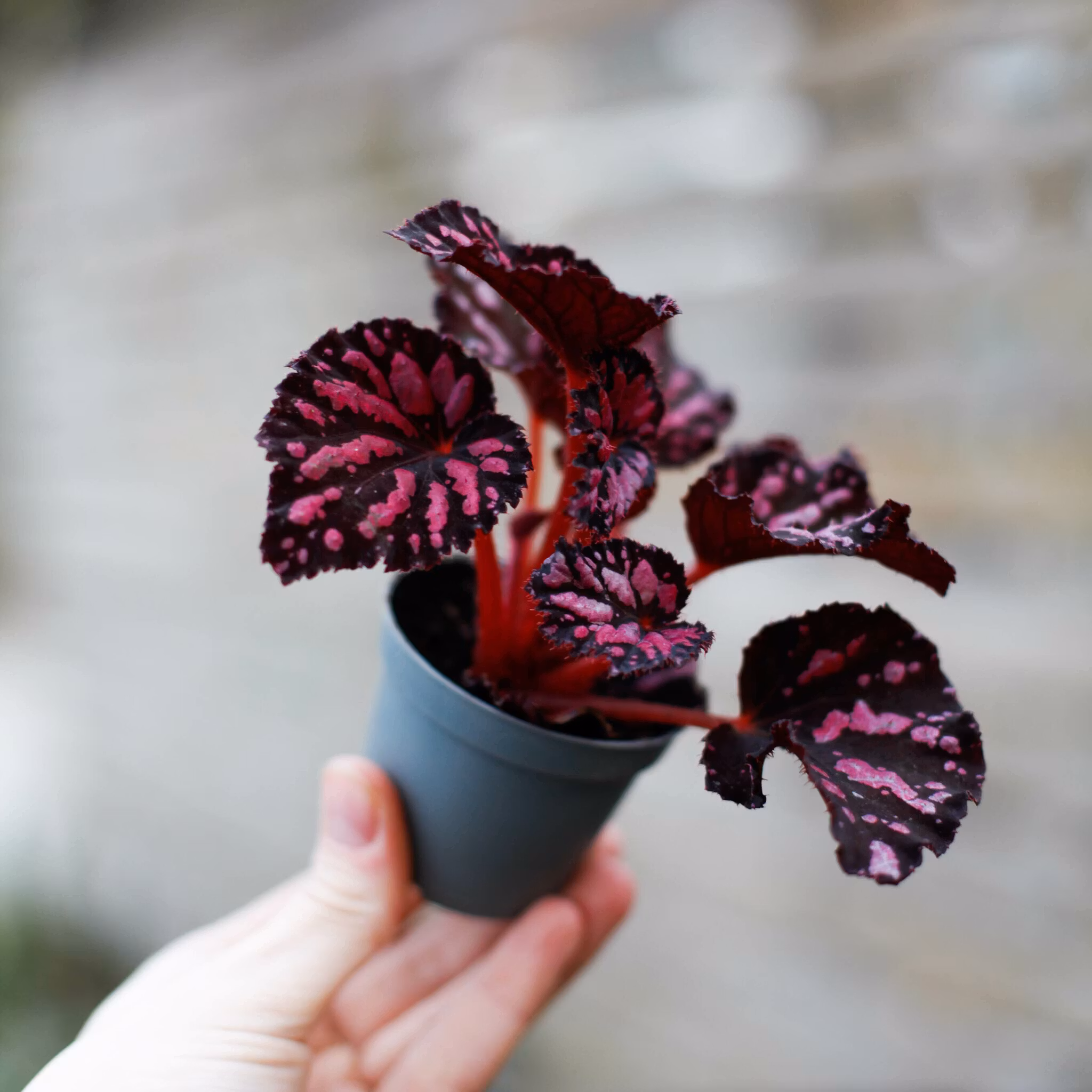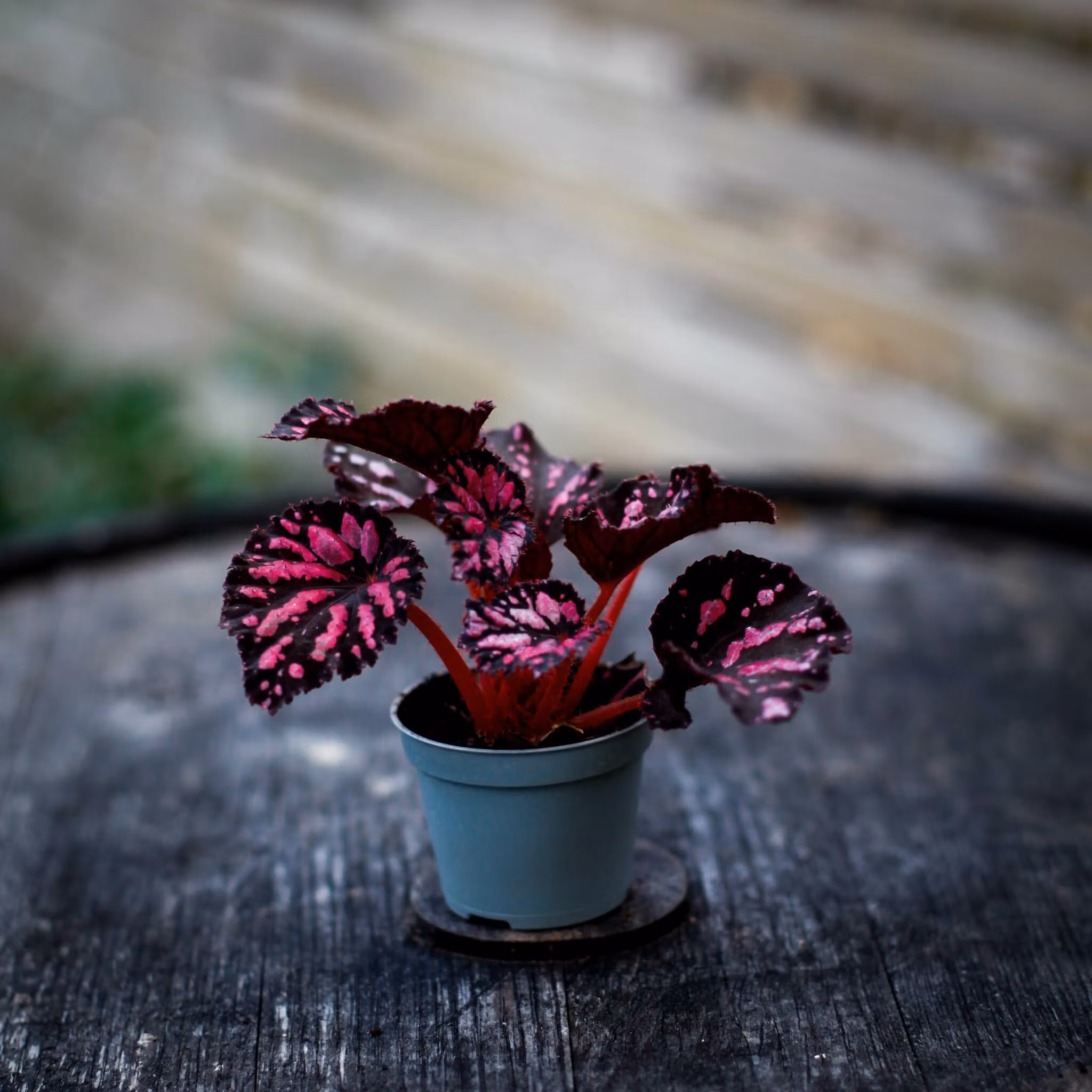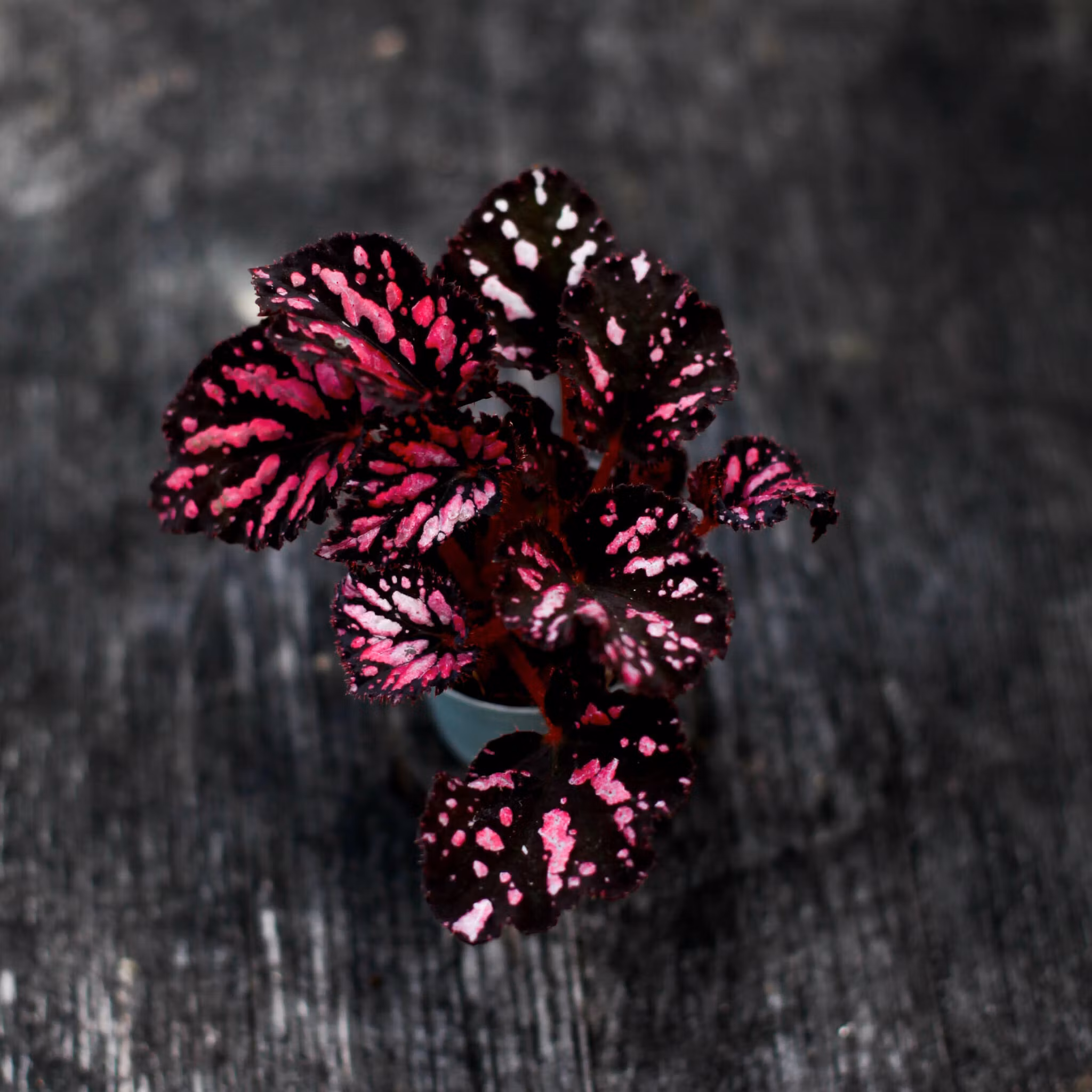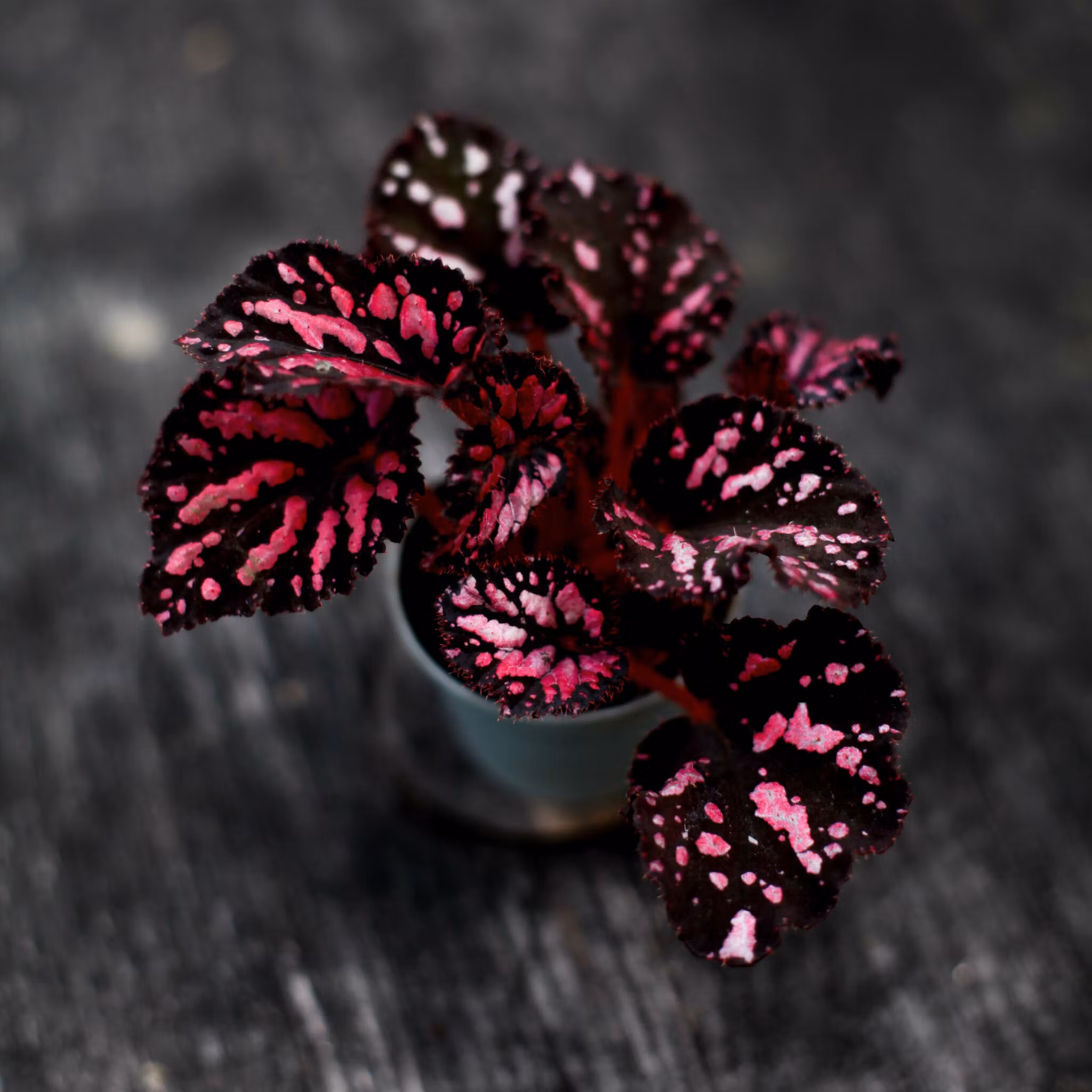 Med sina unika blad, som har svarta kanter och en lysande rosa mitt, är Begonia rex ’Pink Pop’ en sann visuell fest. Dess kontrastrika mönster och färgstarka utseende kommer säkert att vara ett samtalsämne i vilket rum som helst.
