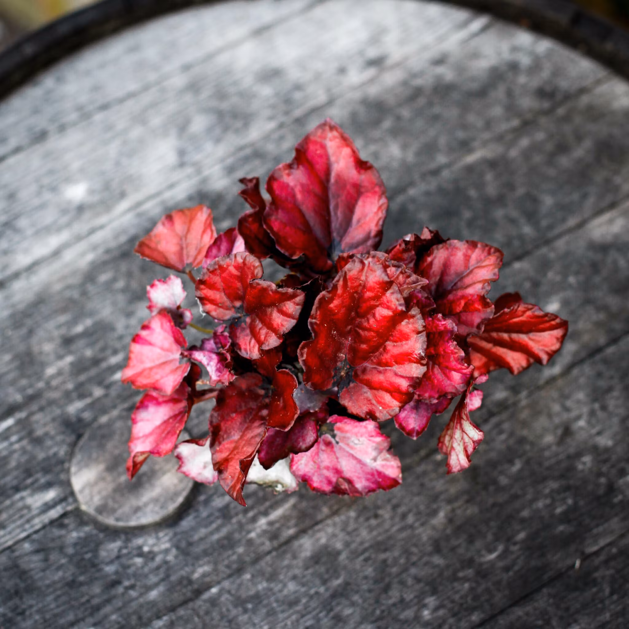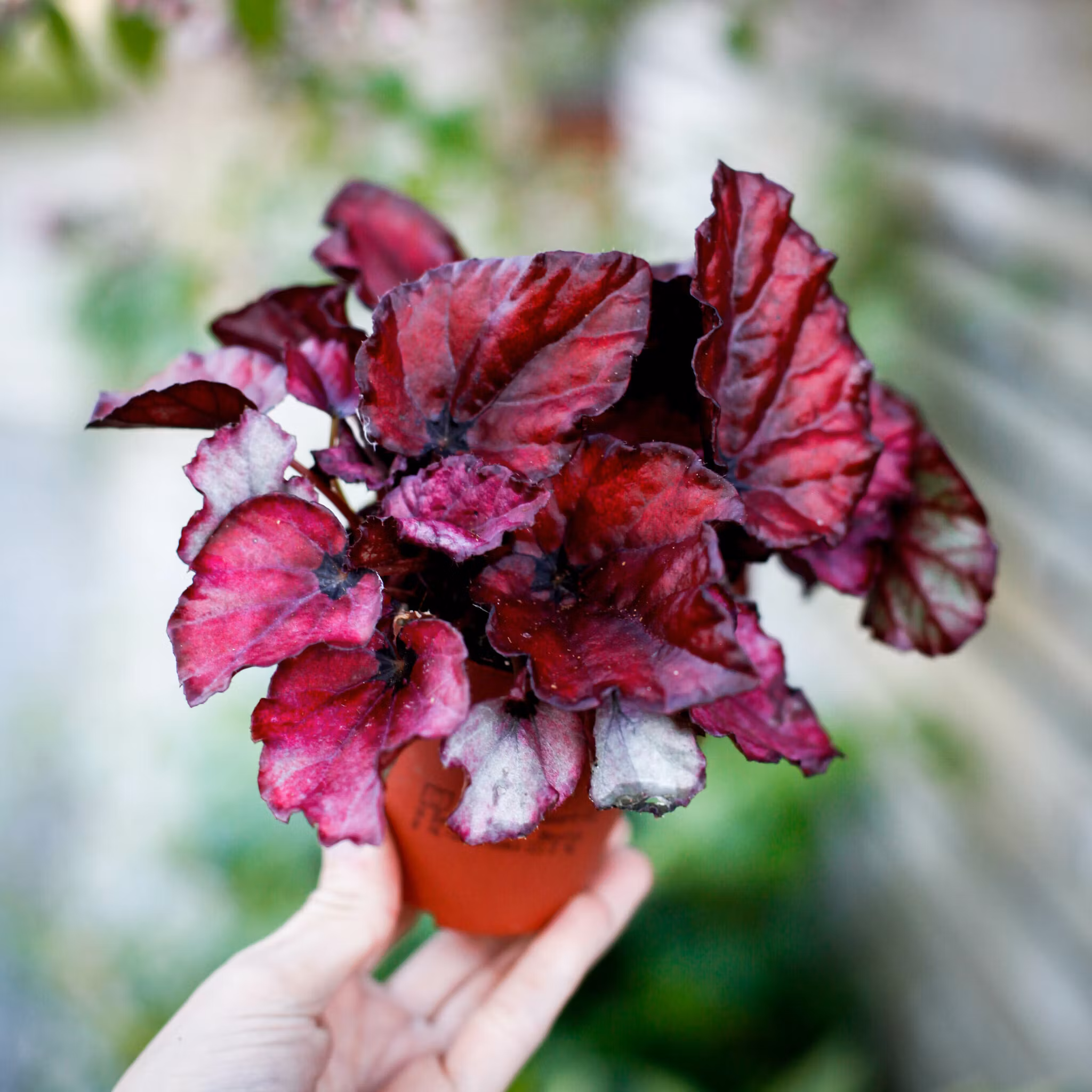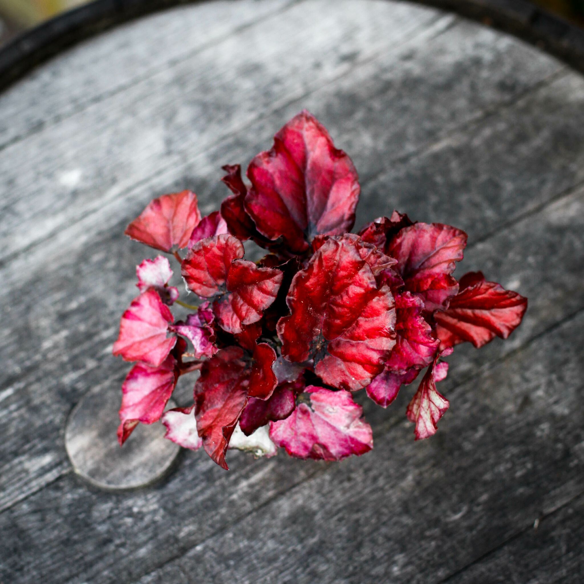 Begonia 'Red Bull' i 8,5 cm kruka pryds av intensiva röd-rosa blad med silvriga inslag. En kompakt och färgstark bladbegonia som skapar en exotisk känsla i ditt