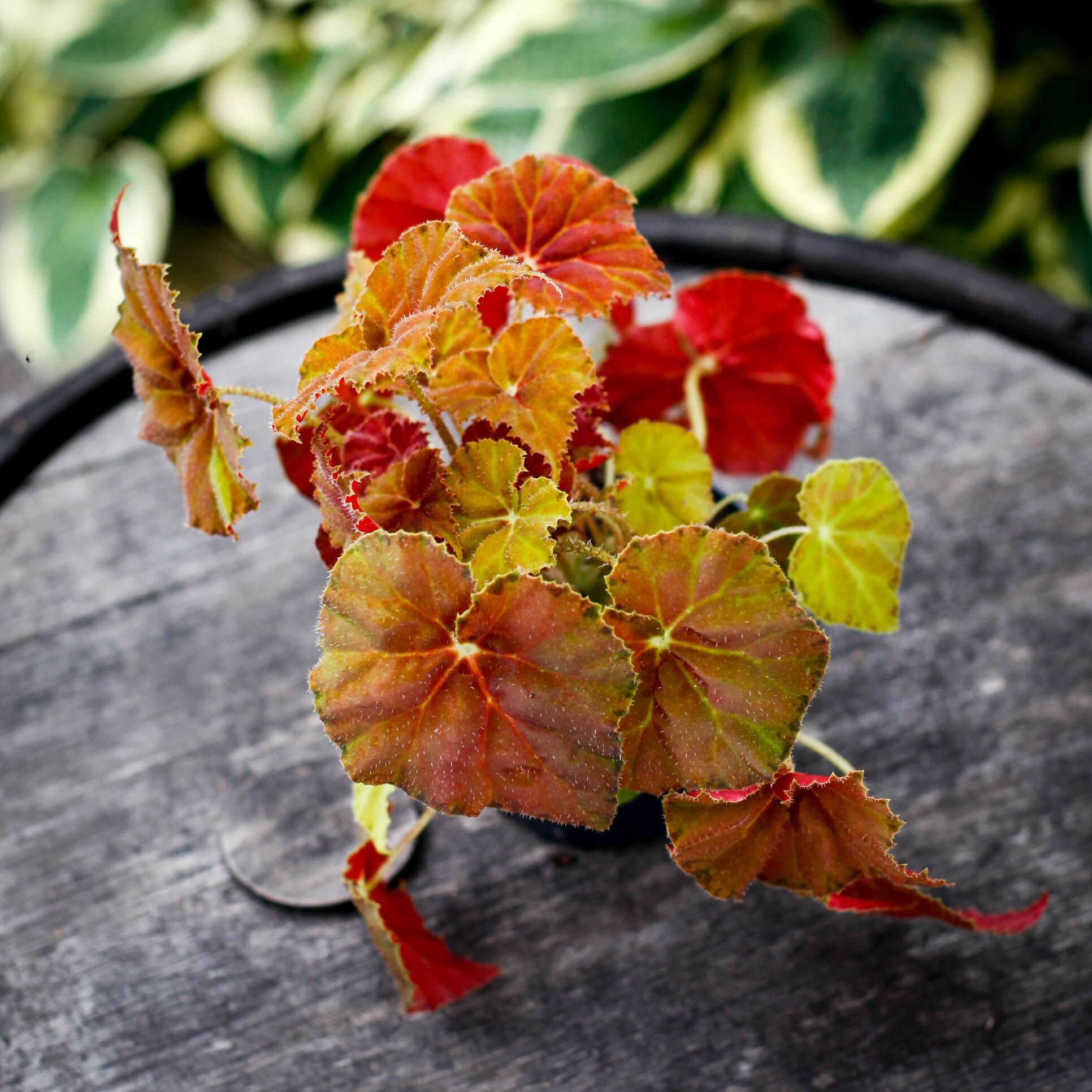 Begonia rex 'Amber Love' - En kunglig begonia med bärnstensfärgade blad, perfekt för inomhusmiljöer. Lättskött och trivs i ljusa, fuktiga miljöer.