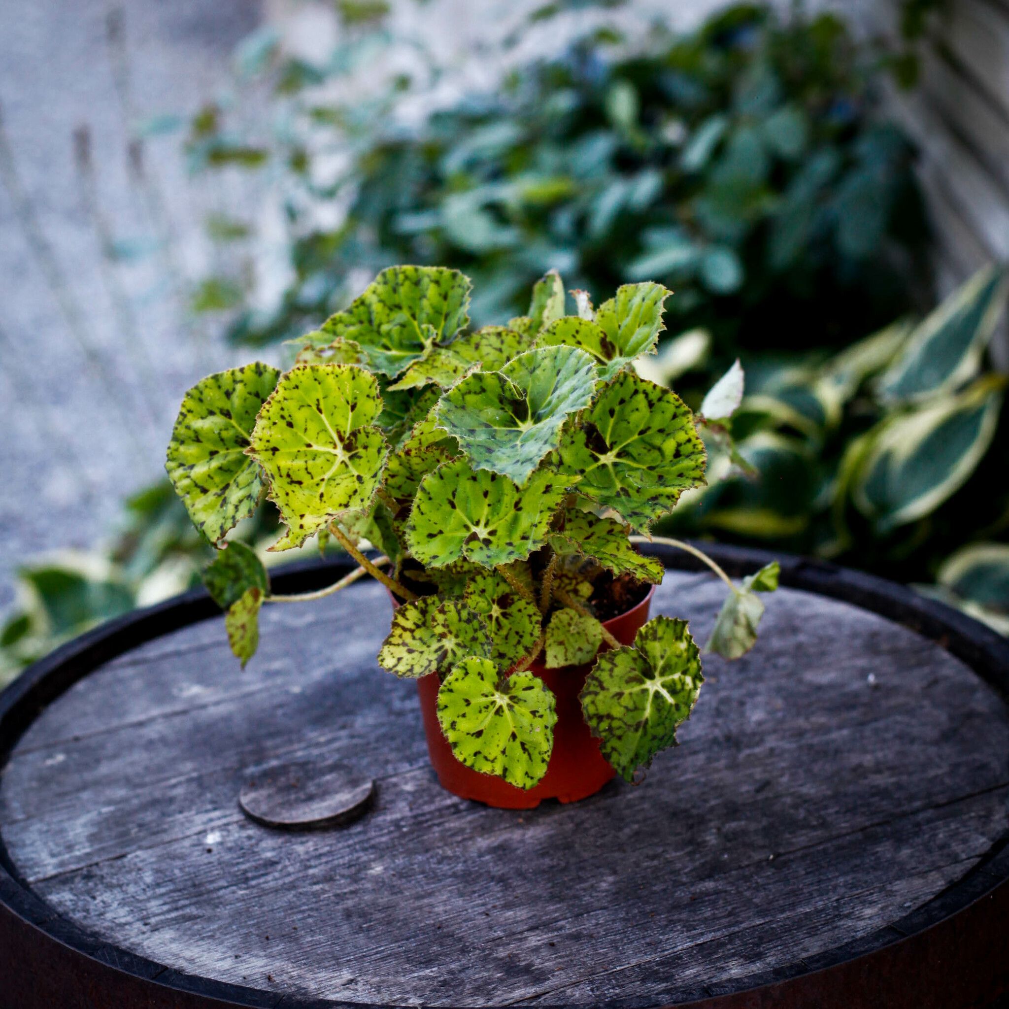 Upptäck Begonia rex 'Lime Fever': En färgexplosion i limegrönt och mörka nyanser. Perfekt för att lysa upp hemmet med sin unika karaktär.
