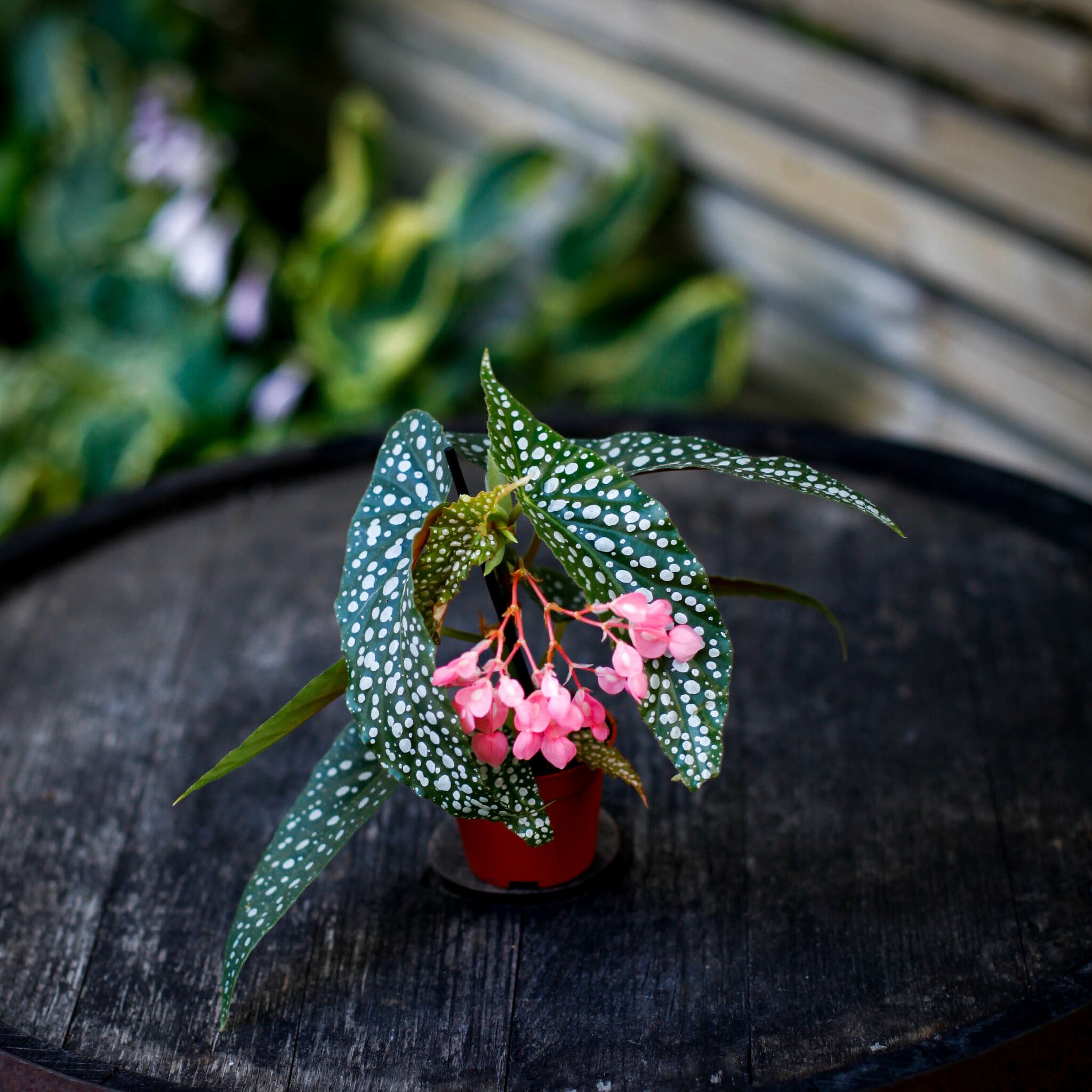 Utforska skönheten hos Begonia även kallad Änglavinge. Denna underbara Begonia är känd för sina gröna blad som är vackert prickade med vita fläckar och sin förtjusande rosa eller vita blomning. Säljs för sina vackra bladverk och det garanteras inte blomning vid leverans.