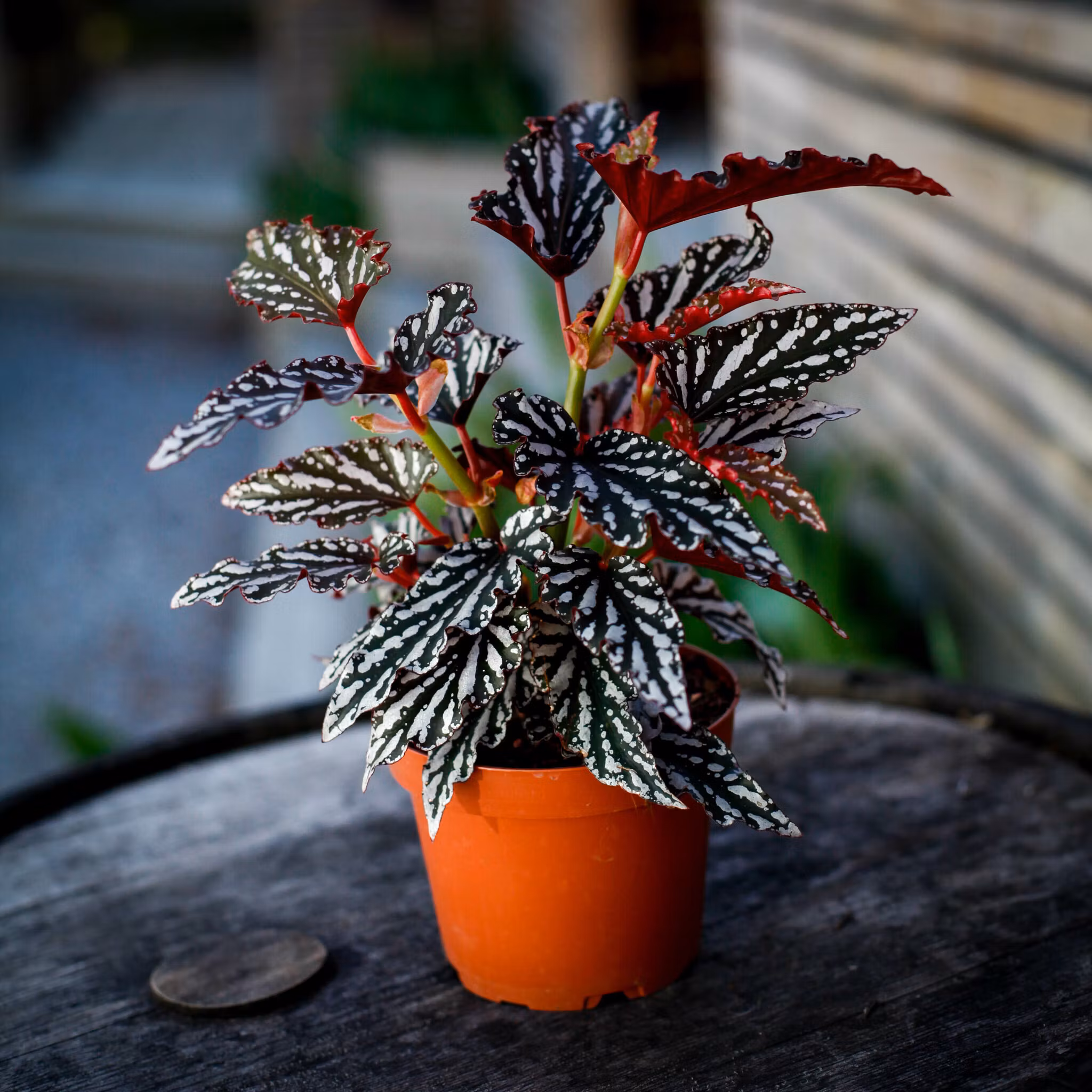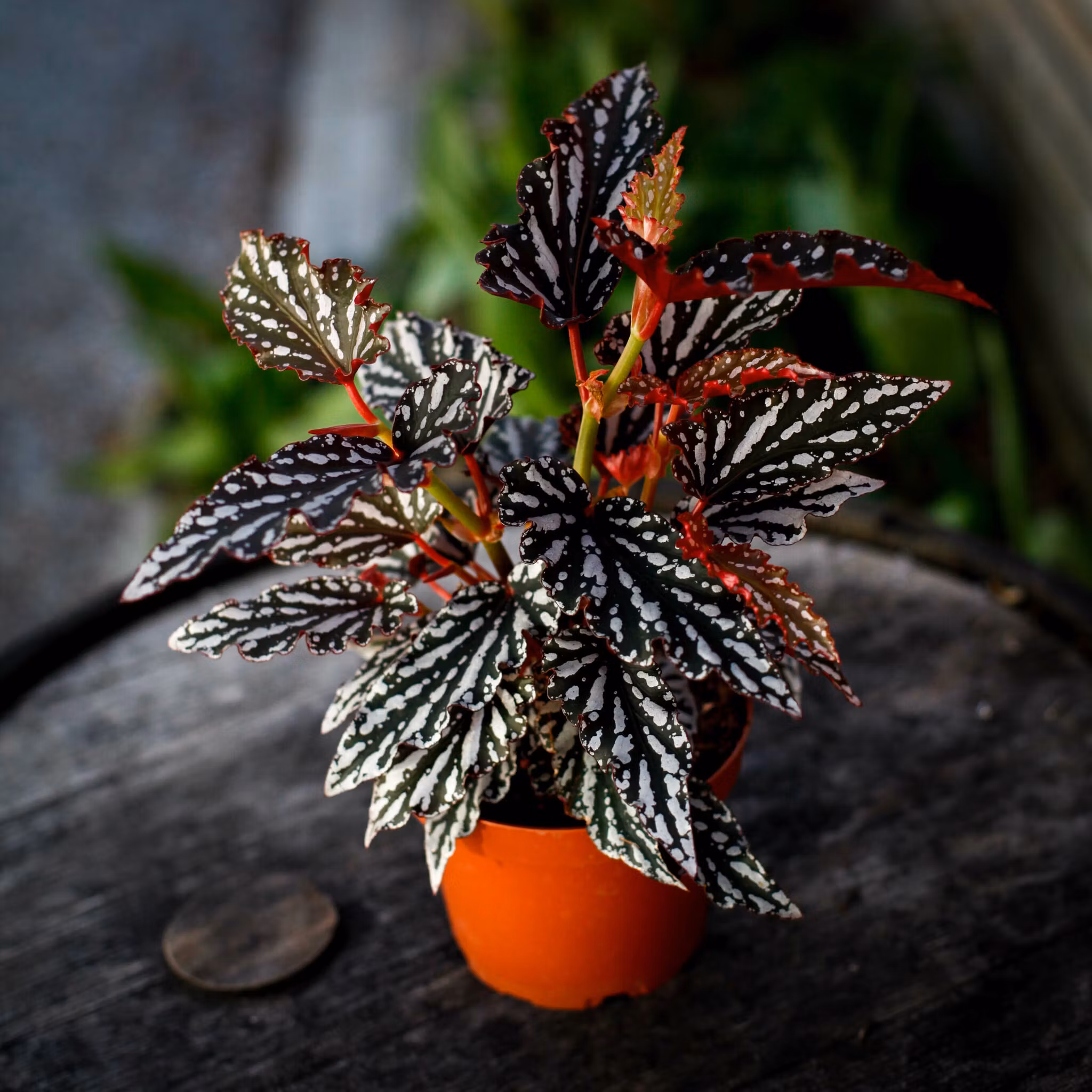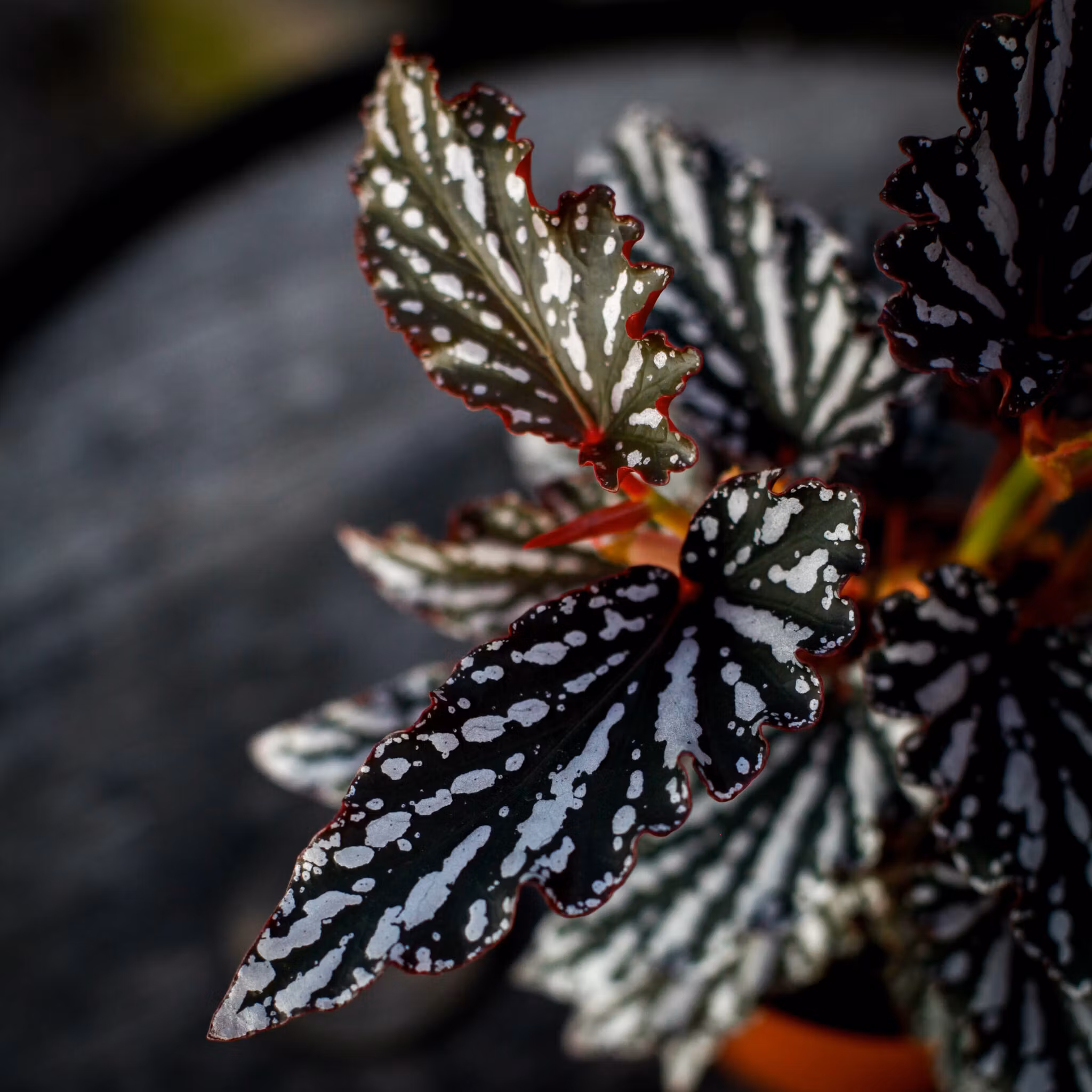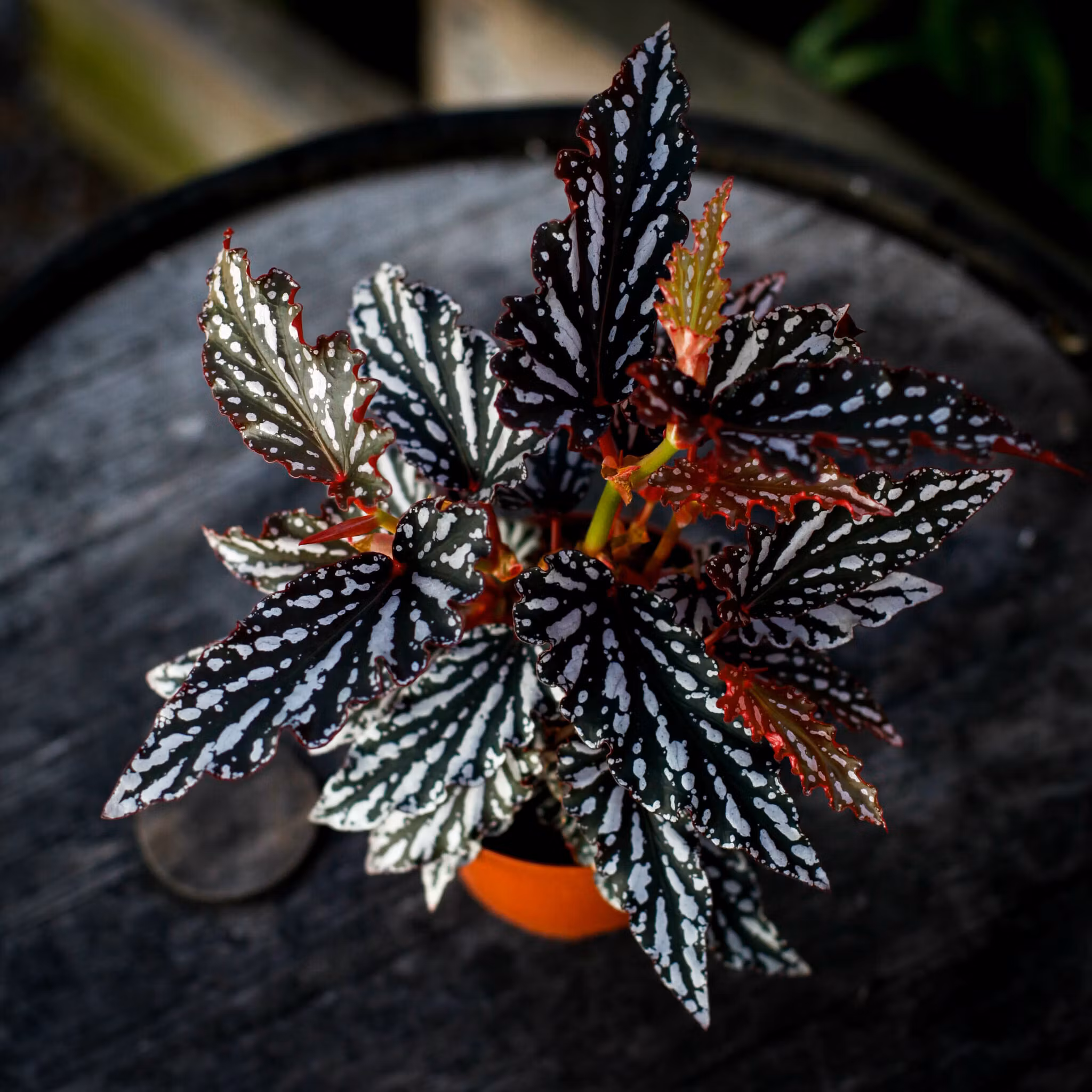 Dramatisk Begonia 'Spotlight Dark' 12cm med mörka, kontrasterande blad. Skapar en elegant atmosfär i hemmet och trivs i ljusa, indirekta ljusförhållanden.