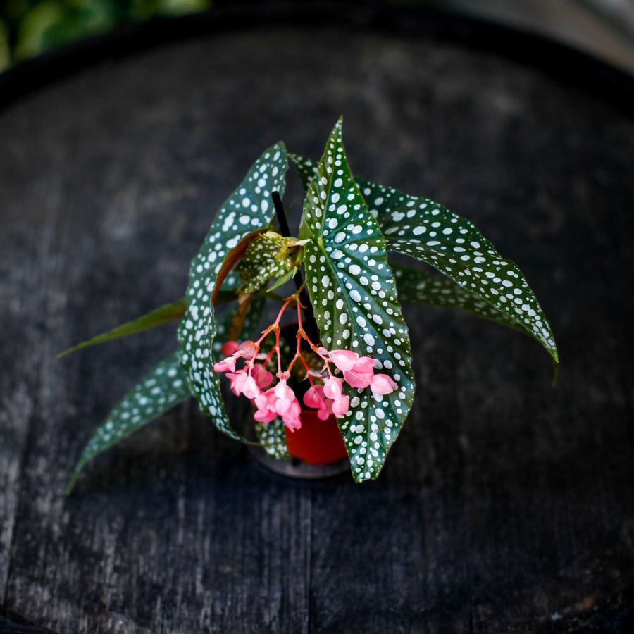 Utforska skönheten hos Begonia även kallad Änglavinge. Denna underbara Begonia är känd för sina gröna blad som är vackert prickade med vita fläckar och sin förtjusande rosa eller vita blomning. Säljs för sina vackra bladverk och det garanteras inte blomning vid leverans.