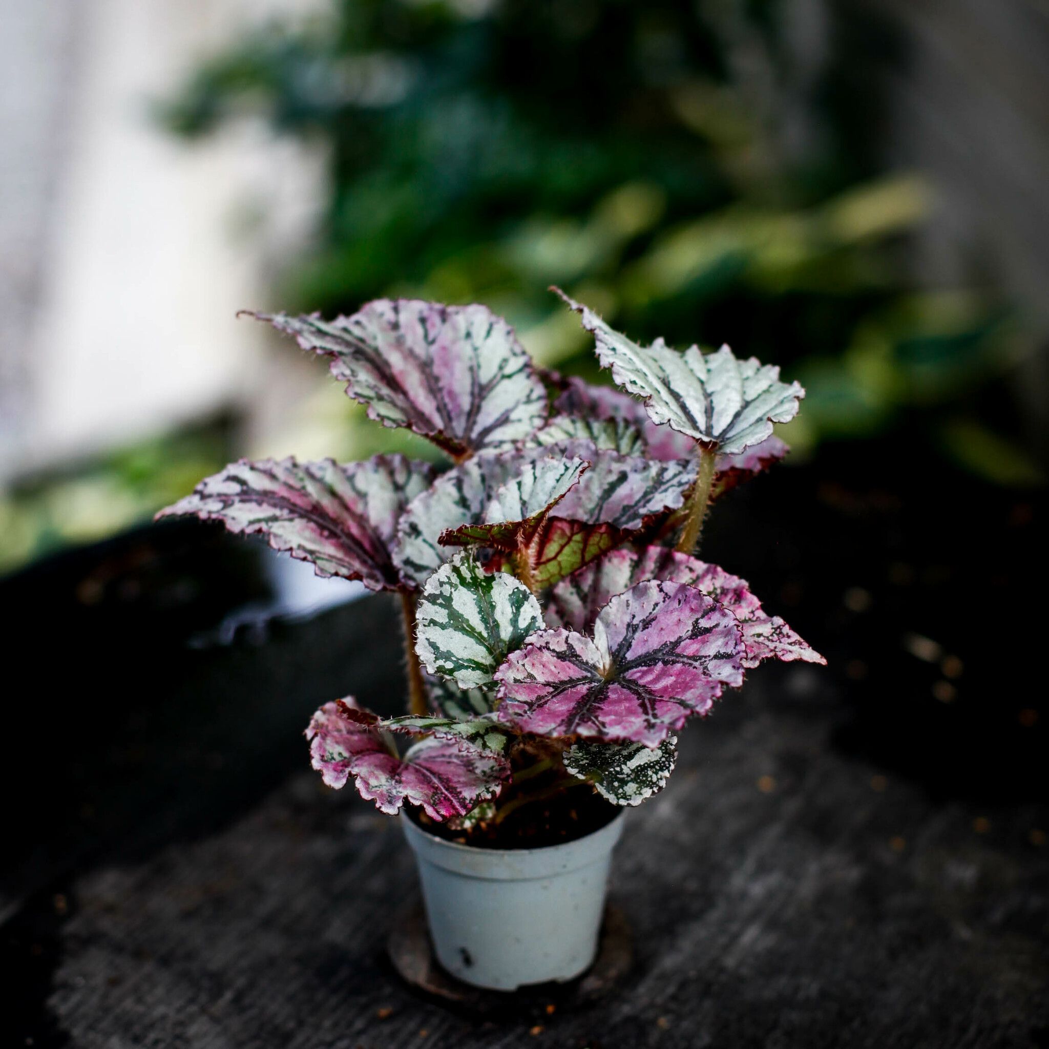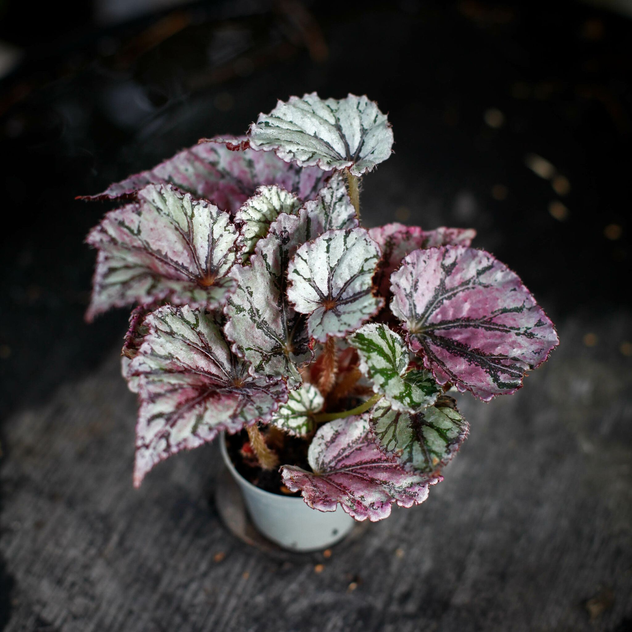 Elegant Begonia rex 'Dew Drop' 6cm med skimrande silver och rosa blad. En lättskött och dekorativ växt som trivs i ljusa men skuggiga miljöer.
