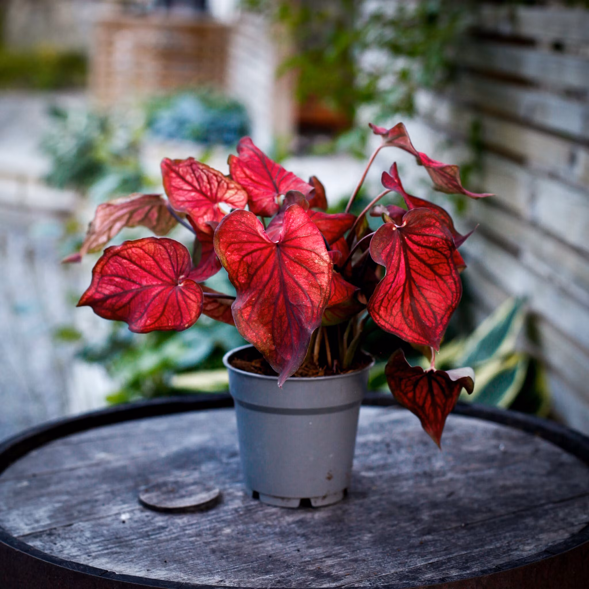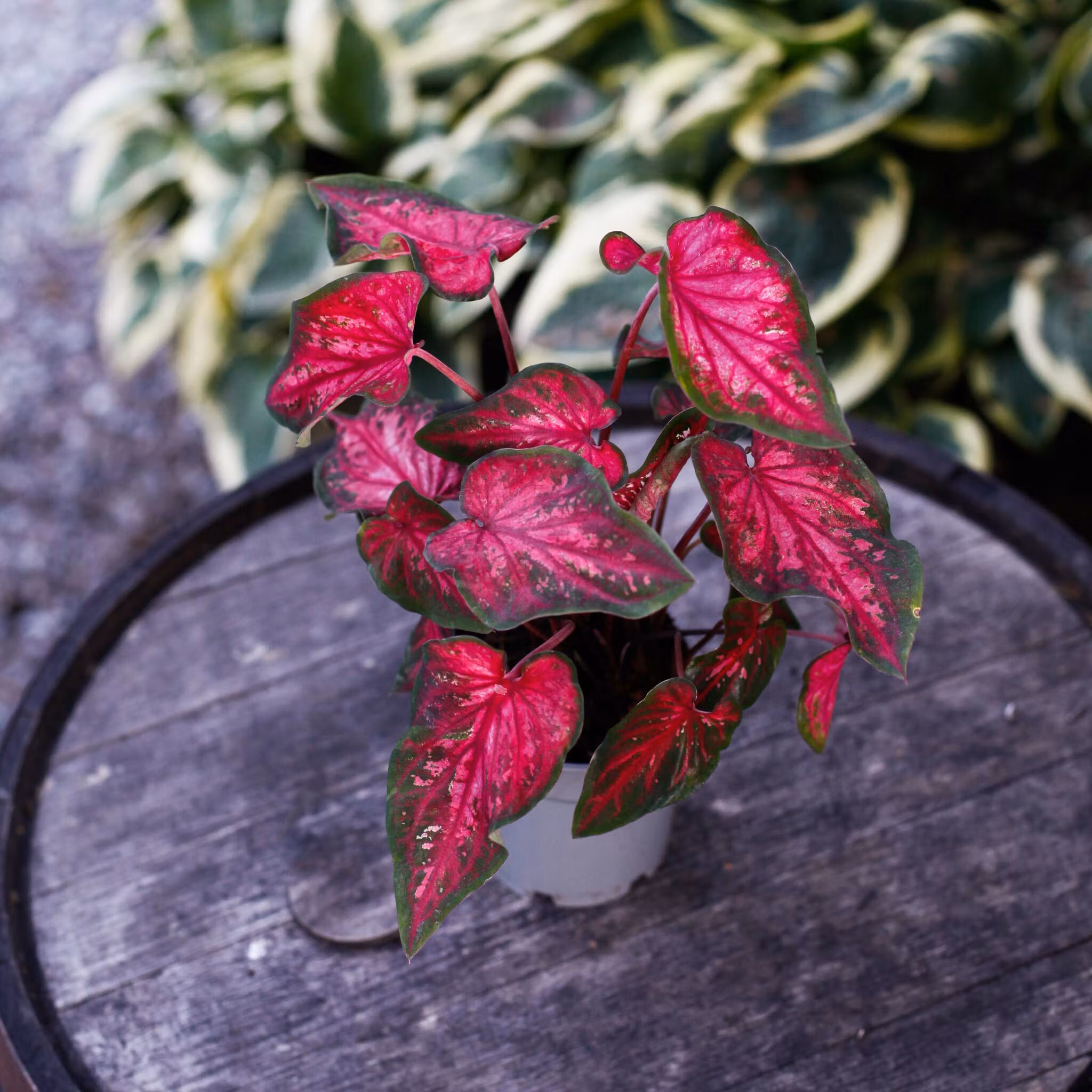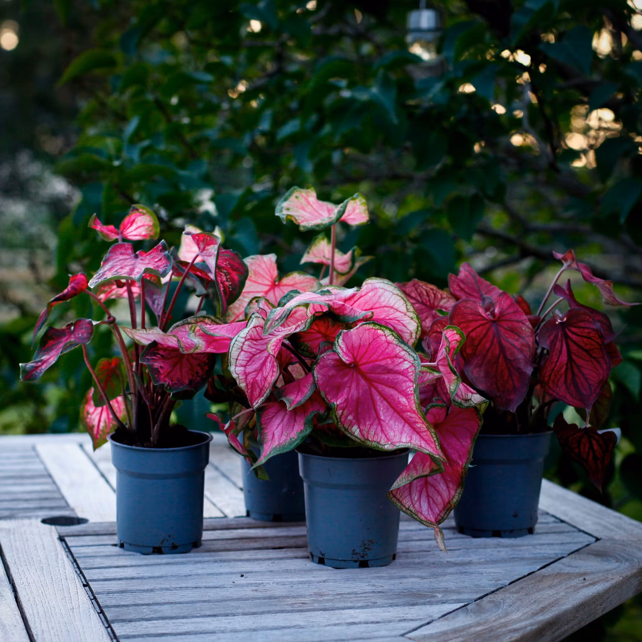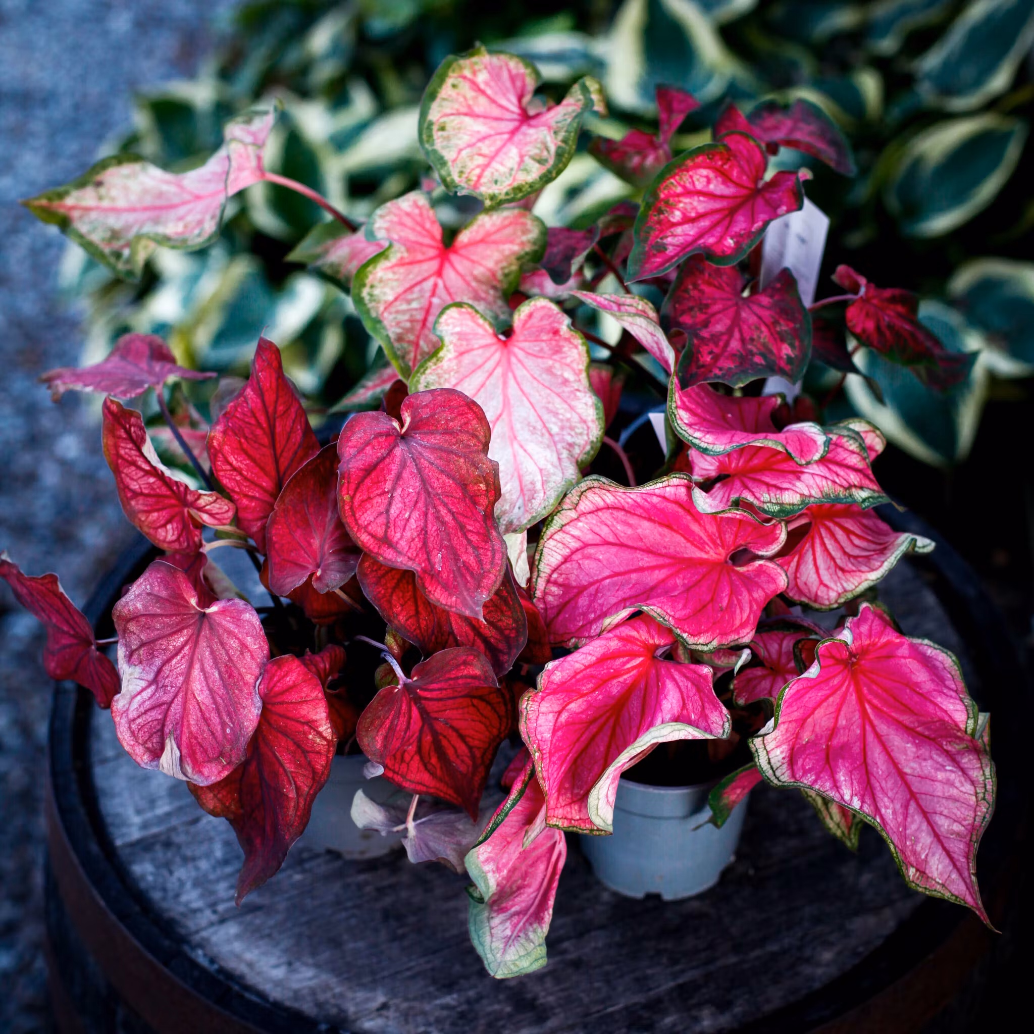 En tropisk bladskönhet som bjuder på sprakande färger och slående mönster – Caladium är växten som tar plats med stil. Med sina stora, hjärtformade blad i nyanser av vitt, rosa, rött och grönt är den lika mycket ett konstverk som en krukväxt. Välj mellan fyra olika sorter, Scarlet Flame, röd, bicolor och Chinook.