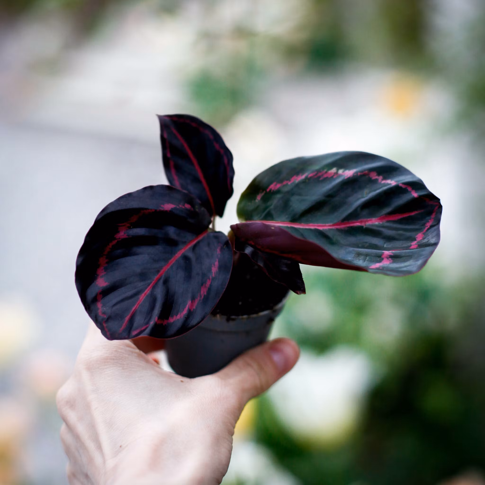 Calathea roseopicta 'Dottie' är en dramatisk och dekorativ växt med mörkt purpursvarta blad och lysande rosa mönster. Den är ett perfekt val för dig som vill ha en exotisk växt med starka kontraster och ett elegant uttryck. Liksom andra Calatheor rör sig bladen beroende på ljusets mängd – en fascinerande detalj i vardagsrummet eller växthörnan.