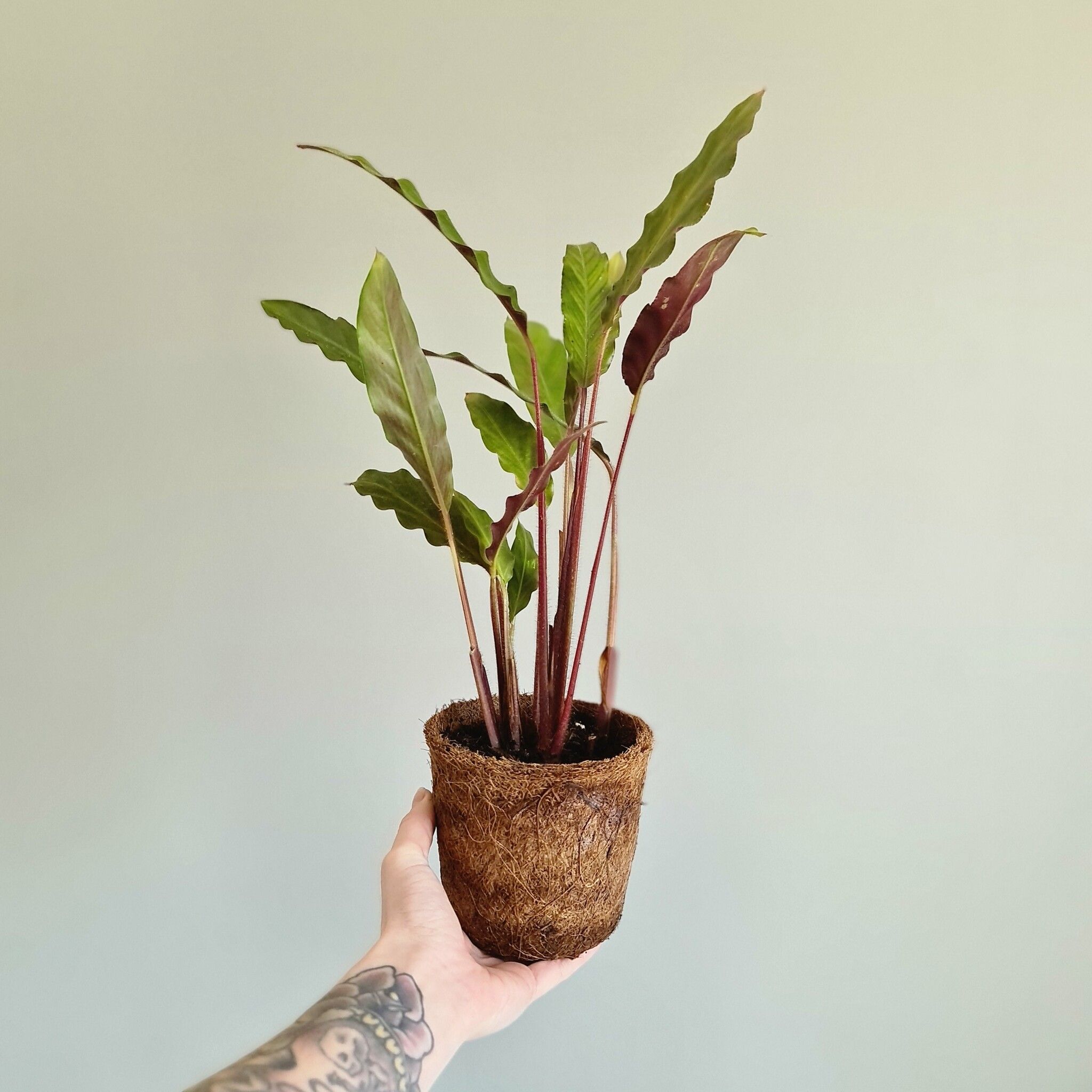 Calathea 'Rufibarba',12 cm, med sina silkeslena blad och unika rörelser, är en perfekt tropisk växt för att förgylla ditt hem med grönskande elegans.