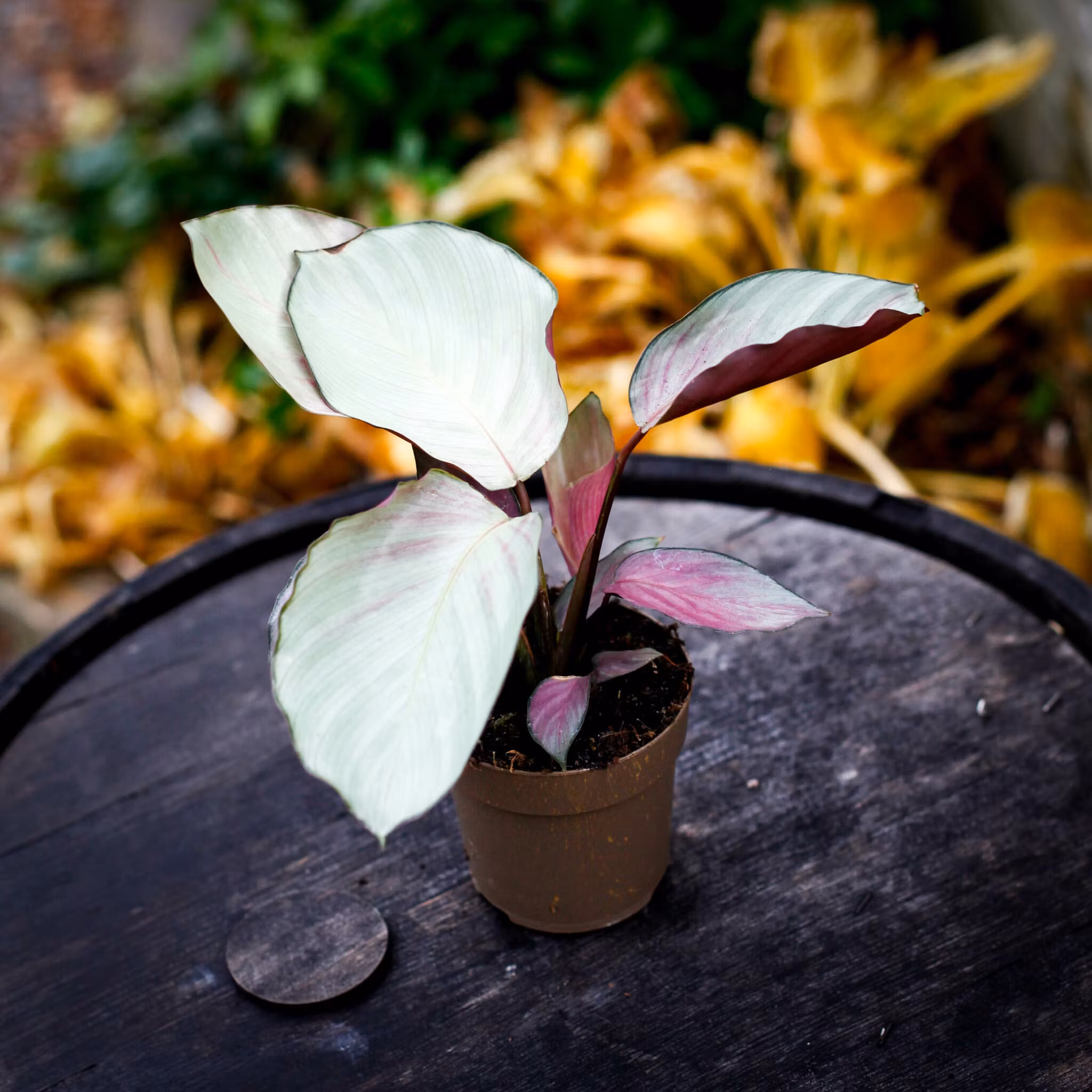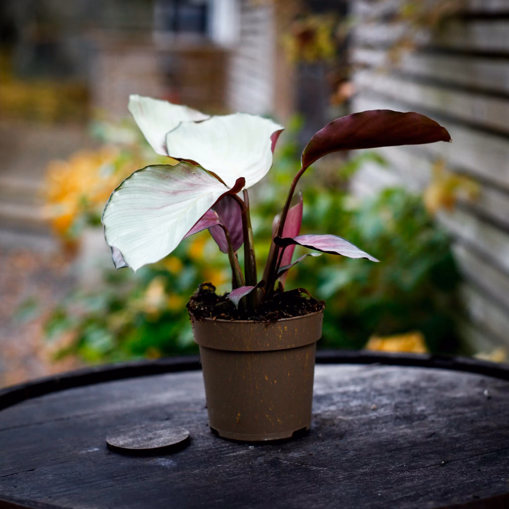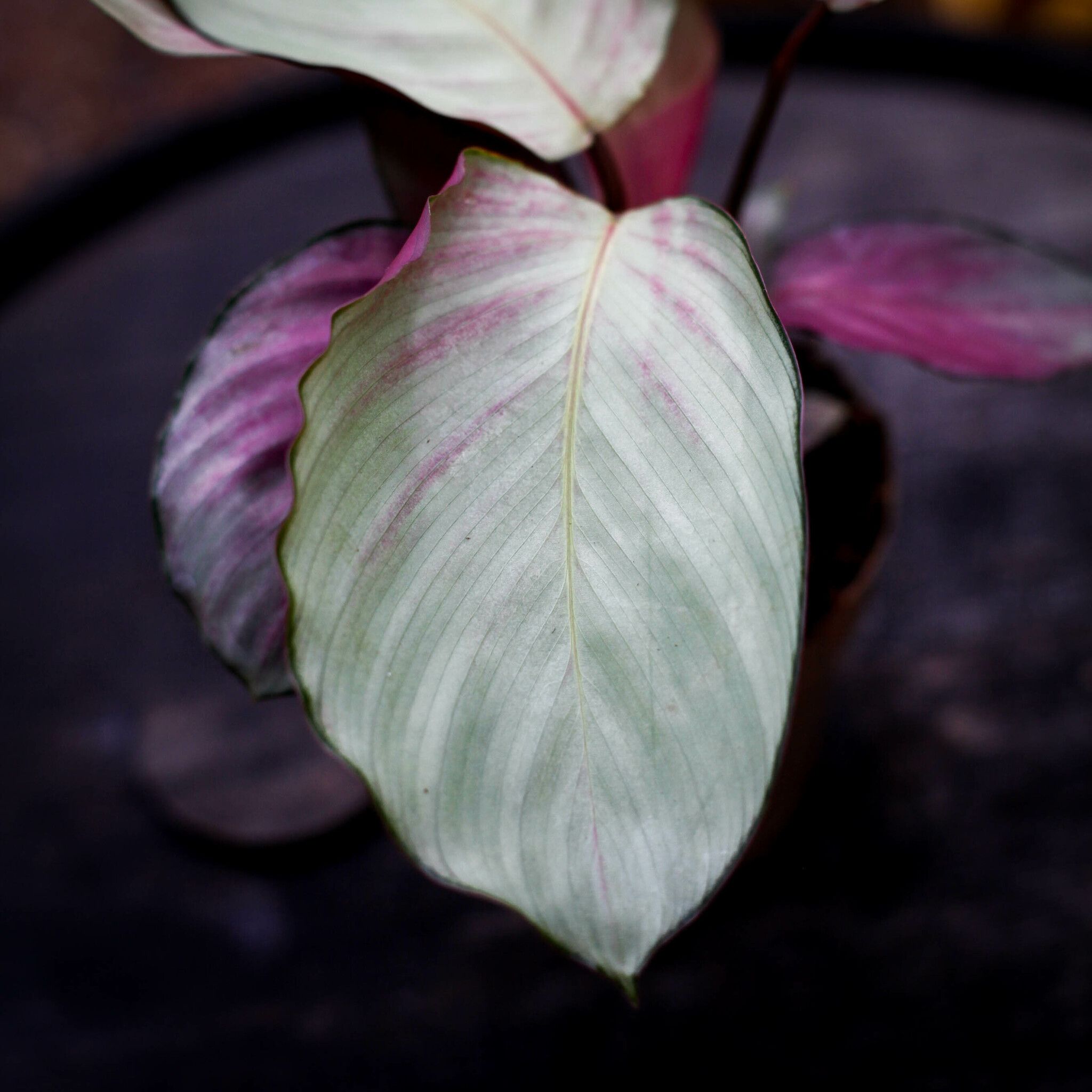Calathea ’Silver Plate’, är en tropisk växt ur familjen Marantaceae. Släktet har sitt ursprung i Sydamerikas regnskogar, där växterna trivs i den fuktiga undervegetationen. Sorten ’Silver Plate’ är särskilt uppskattad för sina breda, silverfärgade blad med mörkgröna kanter och en djupt lila undersida, en riktig blickfångare i hemmet. De unga bladen har ofta en svagt rosa ton som gradvis bleknar och övergår till en jämnt silverfärgad nyans när växten mognar.