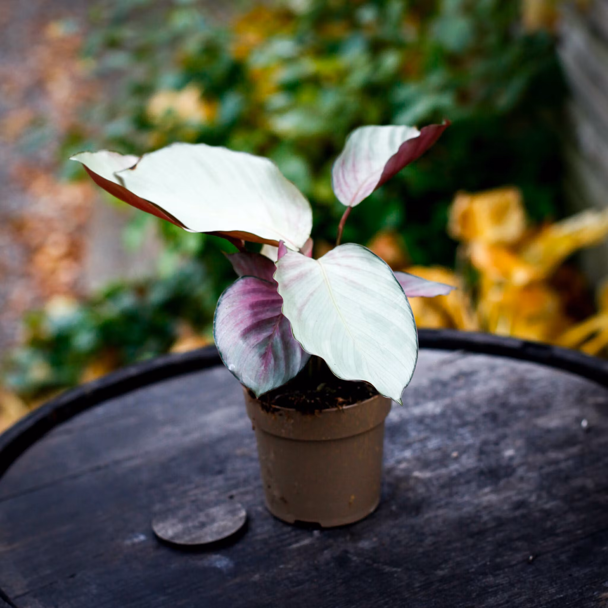 Goeppertia/Calathea ’Silver Plate’ - elegant och lyxig med silvergröna blad, perfekt för moderna hem. Trivs i halvskugga och kräver hög luftfuktighet.