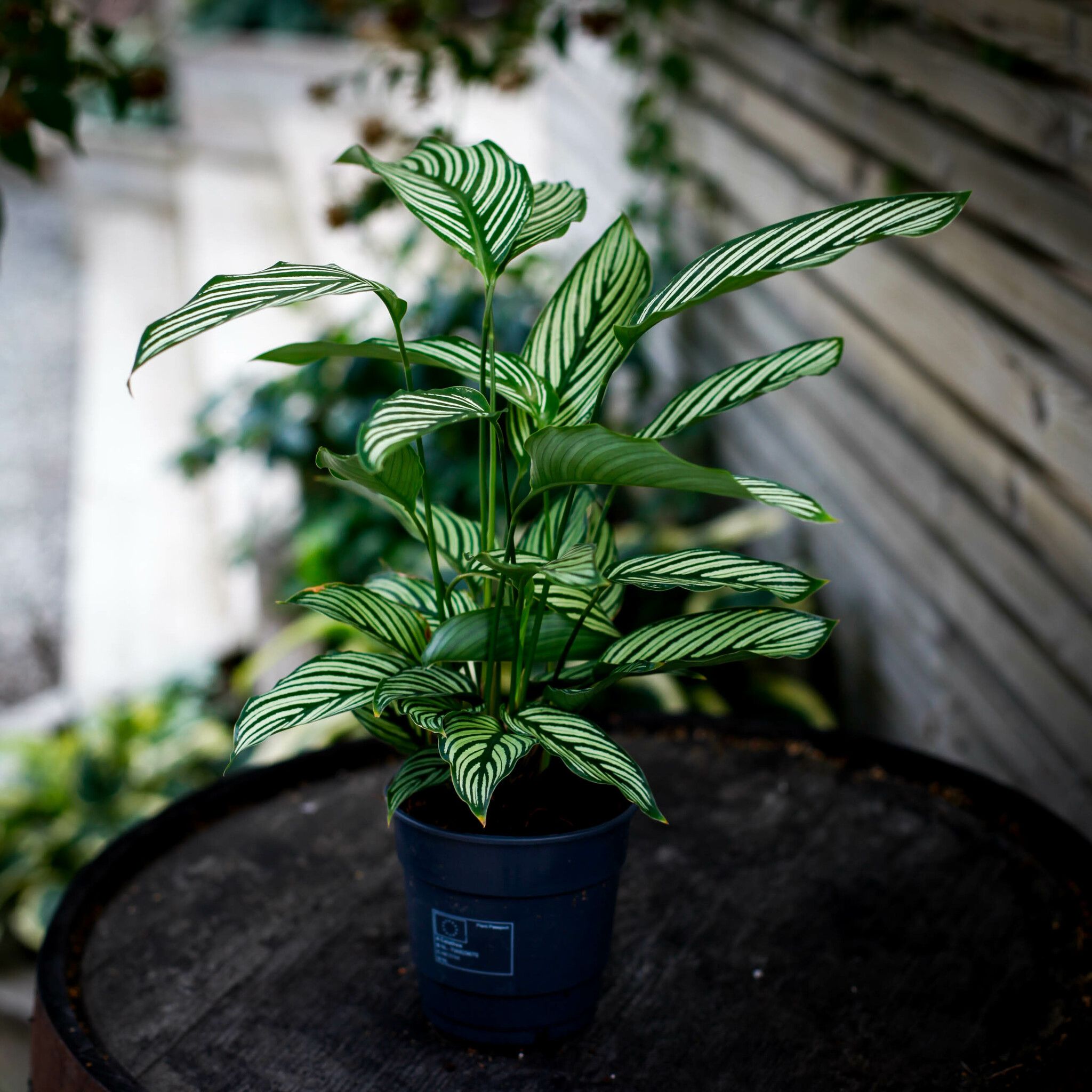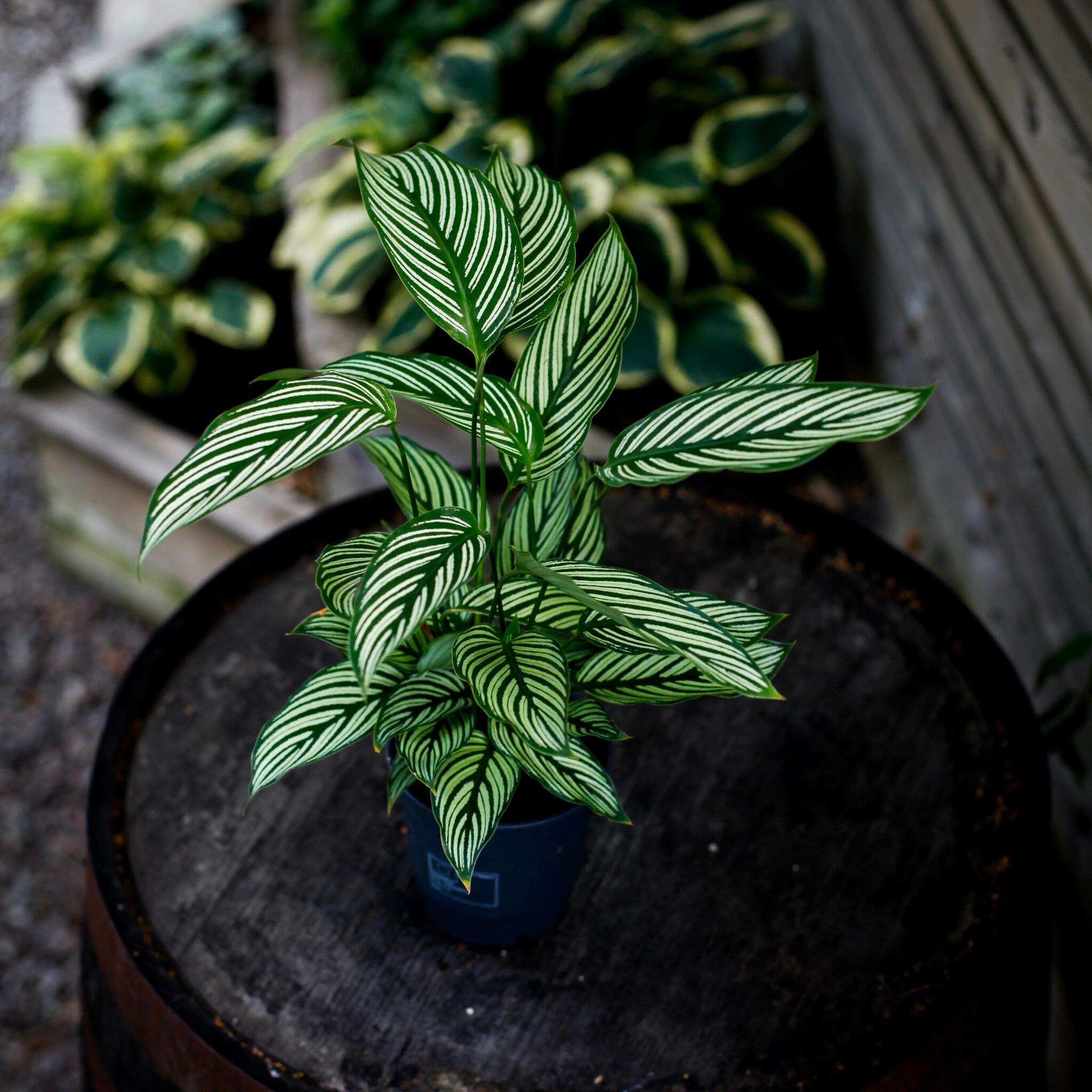 Calathea vittata är en fantastisk och lättskött växt som är perfekt för alla som vill ha en unik och vacker inredning. Dess ovala, breda blad sitter på långa, styva skaft och är mörkt gröna. Ovansidan är vackert mönstrad med vita band eller strimmor mellan nerverna, vilket ger en nästan dramatisk effekt. Undersidan är limegrön och kommer att lysa upp varje rum. Calathea vittata är en mycket vacker och mångsidig växt som är perfekt för att skapa en inspirerande och kreativ miljö som kommer att förbättra ditt hem. Den är lättskött och kräver inte mycket underhåll, så du kan fokusera på att njuta av den härliga skönheten. Upptäck magin med Calathea vittata!