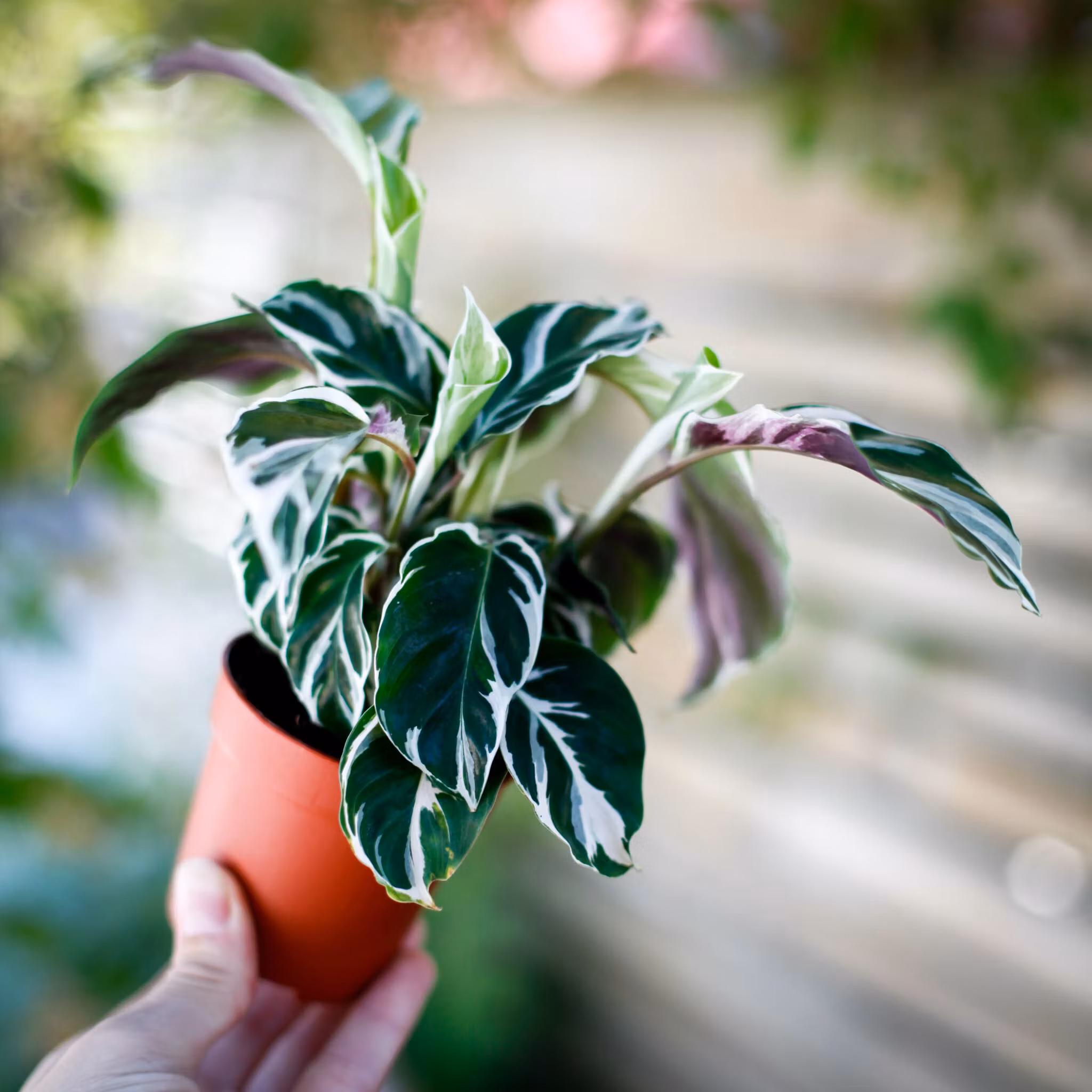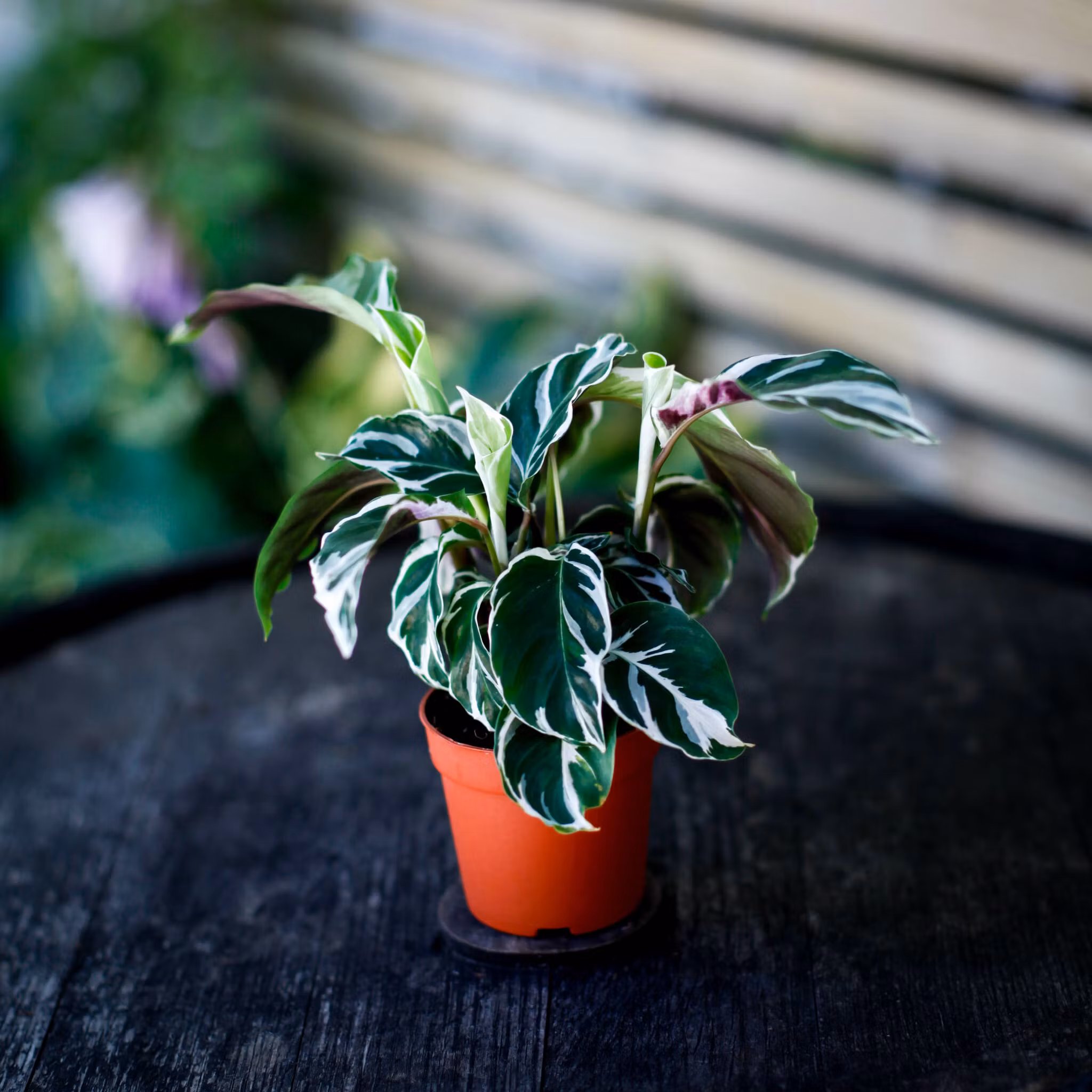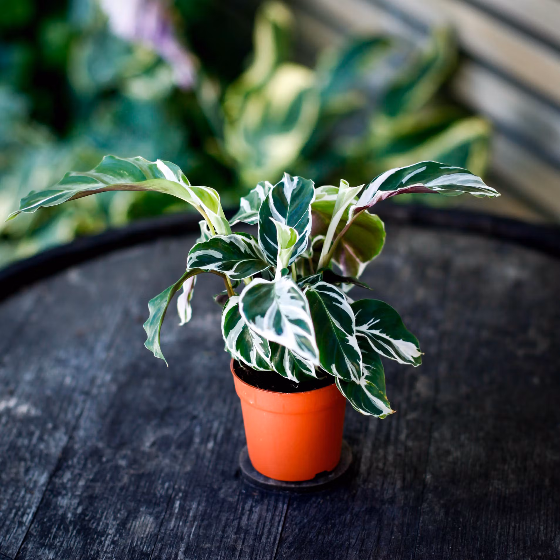 Calathea 'White Fusion' - 7cm En spektakulär växt med eleganta, mönstrade blad i vitt, kräm och grönt. Perfekt för att skapa en sofistikerad touch i hemmet.