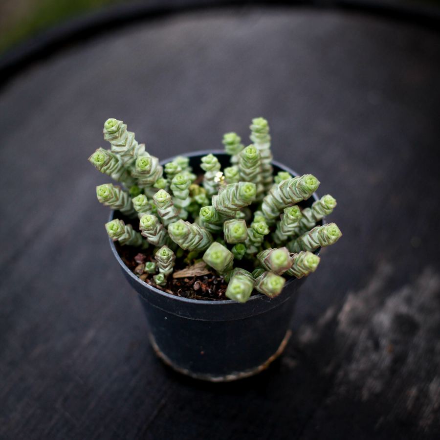 Crassula marnieriana, även känd som "Ladder Plant" eller "Pagoda Plant," är en fascinerande fetbladsväxt som utmärker sig med sina staplade, rosettlika blad som växer i en vertikal formation. Växtens unika struktur gör den till ett intressant inslag i alla inomhusmiljöer. Dess köttiga, grågröna blad ger en minimalistisk och stilren känsla, samtidigt som den är lätt att ta hand om och växer långsamt, vilket gör den till ett långsiktigt prydnadsval.
