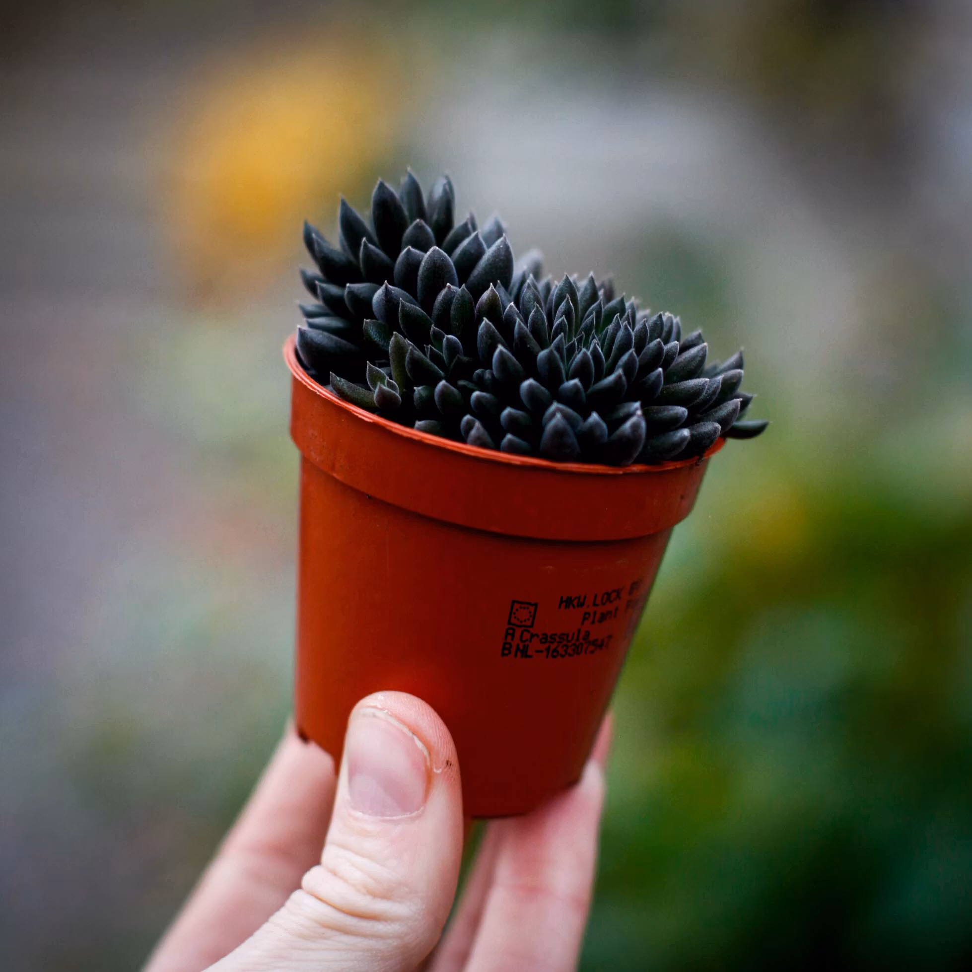 Crassula crassimus ’Dark Leaf’, är en suckulent ur familjen Crassulaceae. Släktet Crassula har sitt ursprung i södra Afrika, där växterna växer i torra och soliga miljöer. Sorten ’Dark Leaf’ kännetecknas av sina mörkgröna till purpurröda blad som bildar täta, upprätta stammar – en kompakt och tålig växt som passar utmärkt för den som vill ha något lättskött men karaktärsfullt.