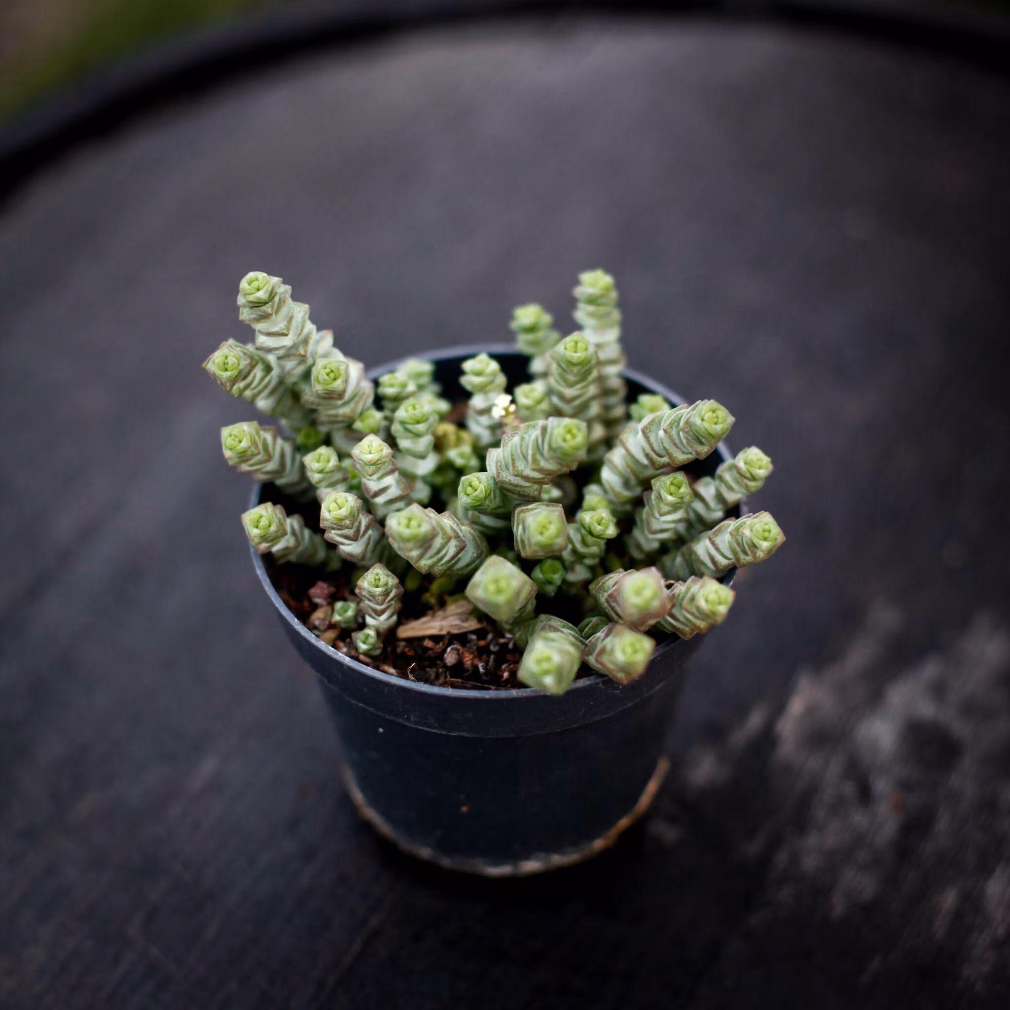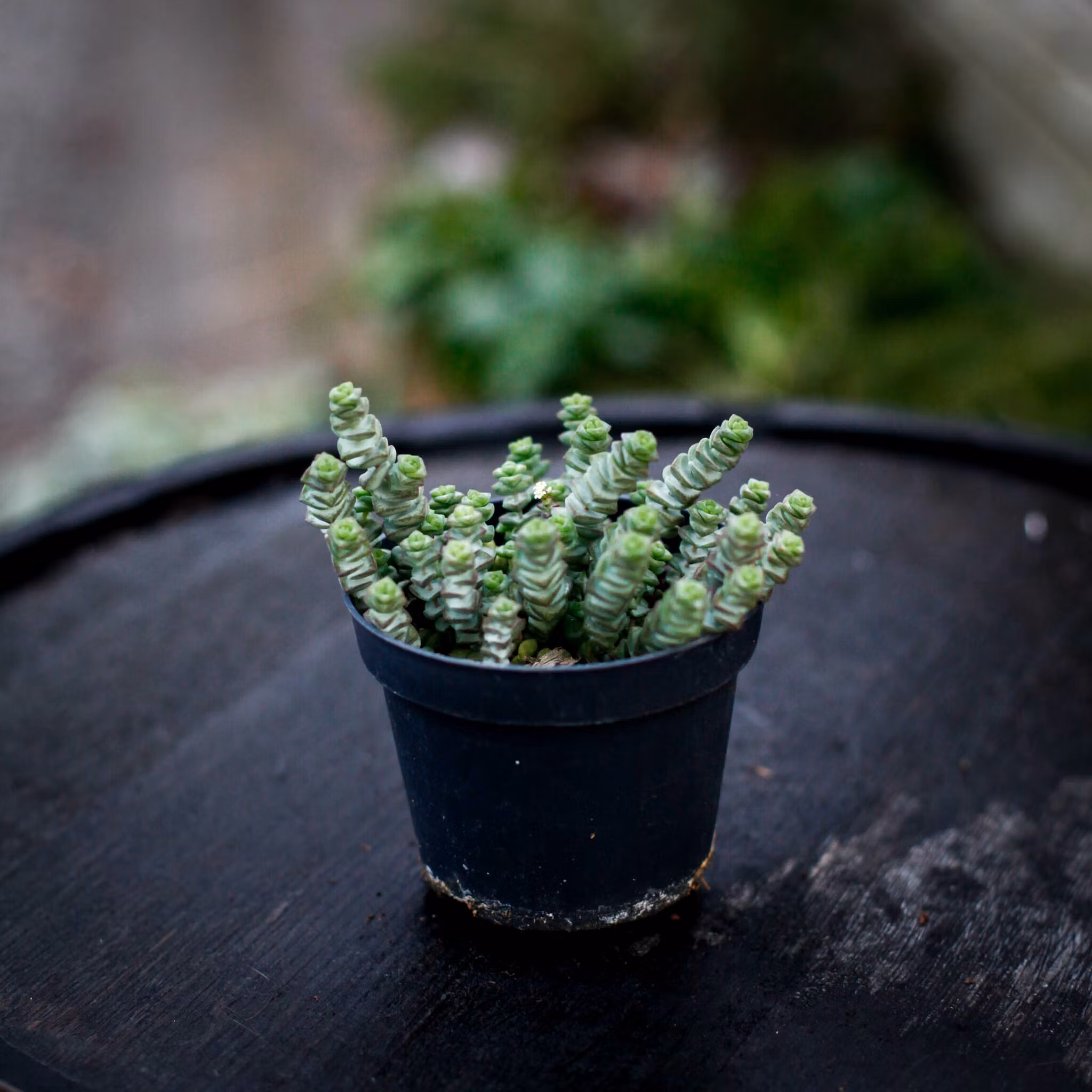 Crassula marnieriana, även känd som "Ladder Plant" eller "Pagoda Plant," är en fascinerande fetbladsväxt som utmärker sig med sina staplade, rosettlika blad som växer i en vertikal formation. Växtens unika struktur gör den till ett intressant inslag i alla inomhusmiljöer. Dess köttiga, grågröna blad ger en minimalistisk och stilren känsla, samtidigt som den är lätt att ta hand om och växer långsamt, vilket gör den till ett långsiktigt prydnadsval.